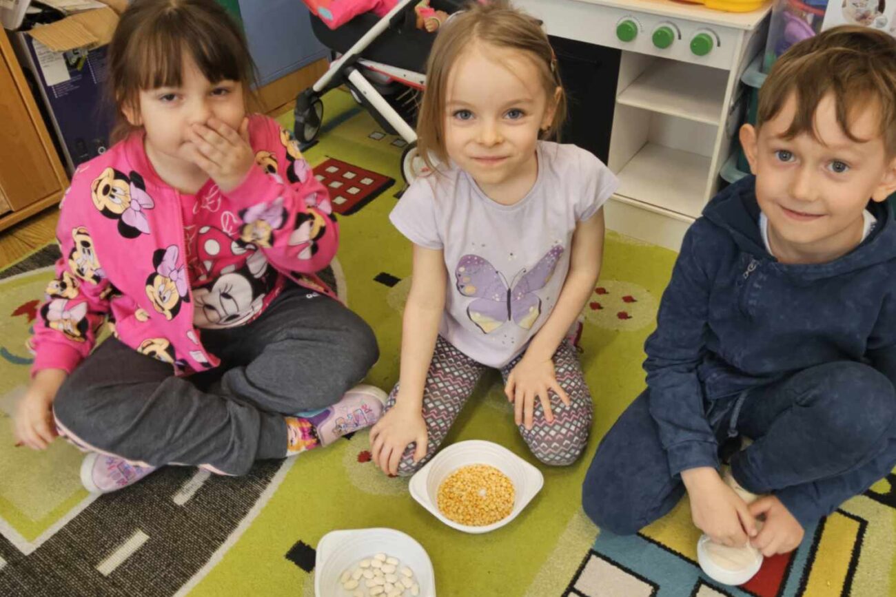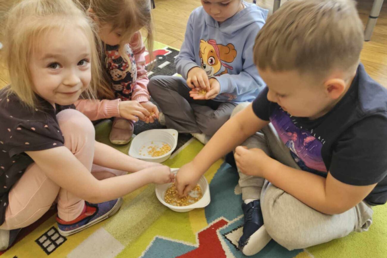 Po wysłuchaniu ciekawostek na temat autorów, a także poznaniu historii „Kopciuszka”, dzieci wykonywały rozmaite zadania: odzielanie grochu od fasoli, sprzątanie, wykonanie eksperymentu: jak powstaje sadza?, tańczenie poloneza na balu. Dzieci zaprojektowały suknię balową oraz garnitur.