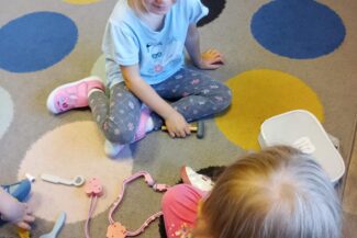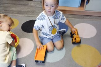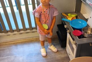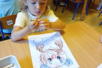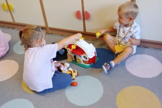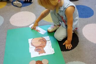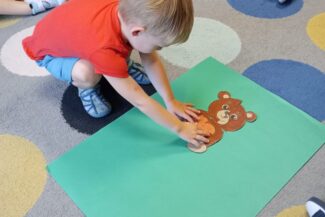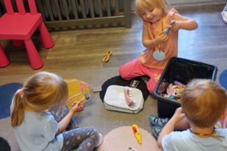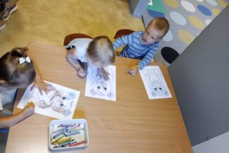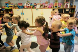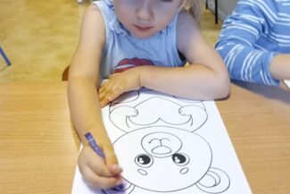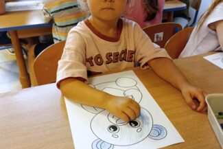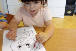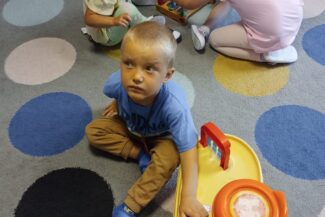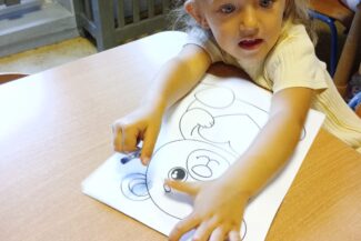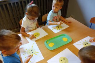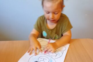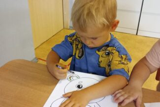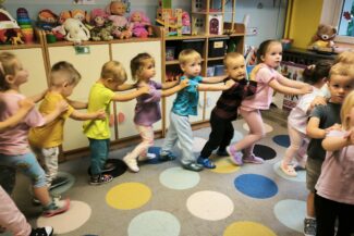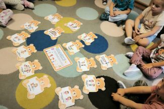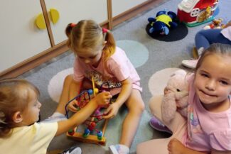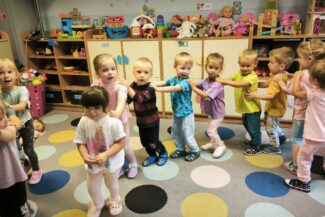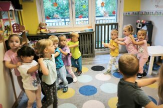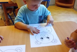 Pierwszy tydzień w przedszkolu w grupie „Misie” poświęciliśmy na zapoznanie się z nowym miejscem – salą, jej wyposażeniem, kącikami zainteresowań, przedszkolnymi zwyczajami. Wiele zabaw dotyczyło ważnego i trudnego tematu emocji związanych z odnalezieniem się w przedszkolnej rzeczywistości oraz budowaniu zaufania do swoich pań – były to zabawy integracyjne „Przytulas z misiem”, „Witam chłopców, witam dziewczynki”, „Zapoznaj się z misiem” oraz zabawy rozwijające umiejętność rozpoznawania i określania emocji „Uczucia misia i lali”, „Określamy emocje”, „Złość, radość, smutek i znudzenie”. W drugim tygodniu dużo czasu poświęciliśmy tematyce zasad obowiązujących w grupie – zaczęliśmy od stworzenia grupowego kodeksu, do którego będziemy się bardzo często odwoływać, przypominając o jego poszczególnych zapisach, a także określaliśmy właściwe i nieprawidłowe zachowania dzieci, utrwalaliśmy swoje imiona, opowiadaliśmy o swoich ulubionych zabawkach. Poznaliśmy piosenki: „Jadą misie, Pociąg, Jestem sobie przedszkolaczek, Gruby miś” oraz wiersze ” Mam trzy latka, Sprzątamy zabawki” oraz szereg wyliczanek i zabaw ruchowych z pokazywaniem. Wykonywaliśmy ciekawe prace plastyczne rozwijając sprawność manualną dziecka, (rysowanie, malowanie, stemplowanie), uczyliśmy się rozpoznawania i nazywania podstawowych kolorów, segregowania zabawek, tworzenia zbiorów, przeliczania. Powolutku zaczynamy tworzyć grupę.