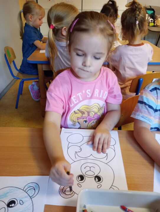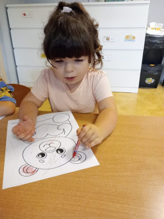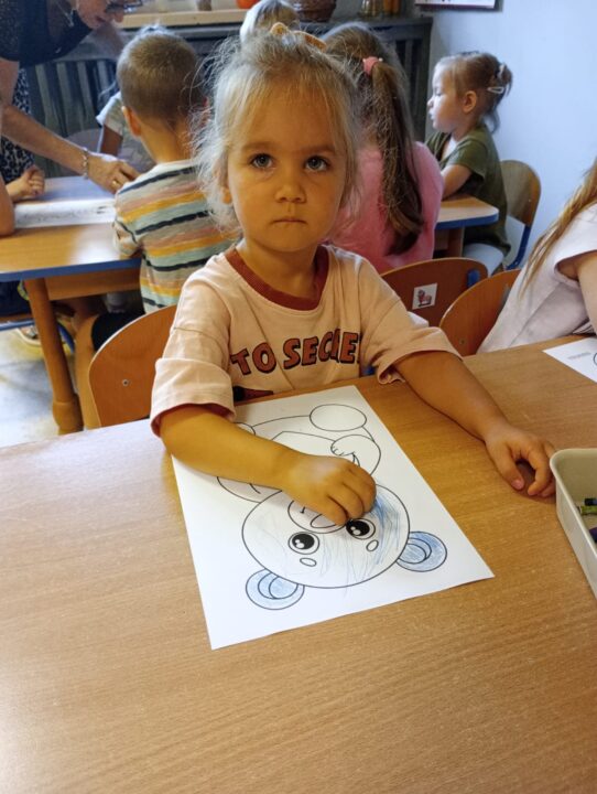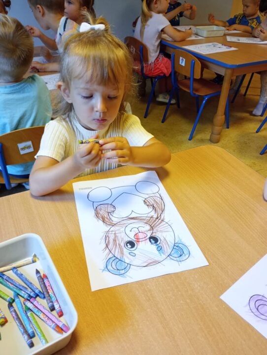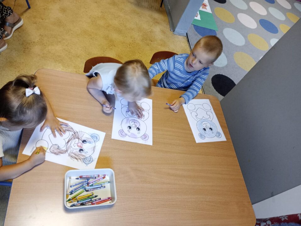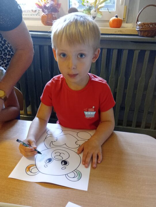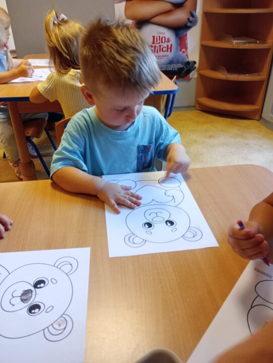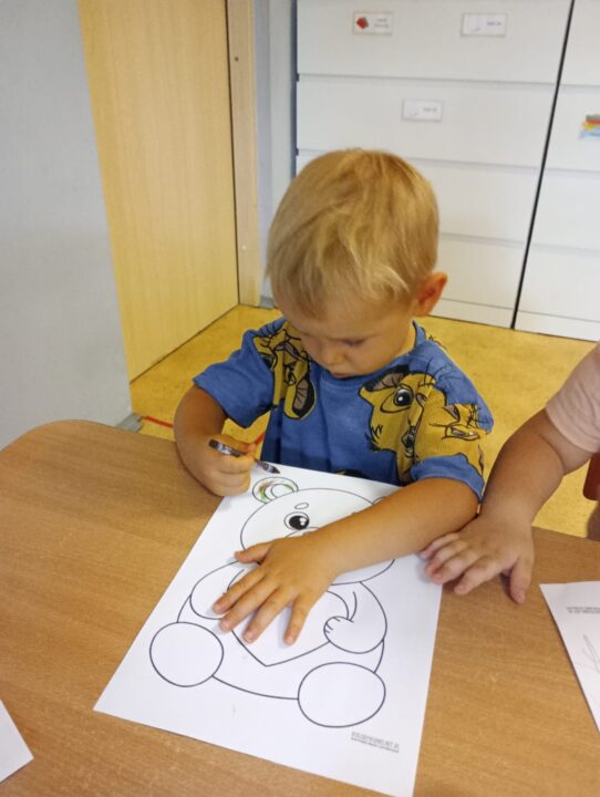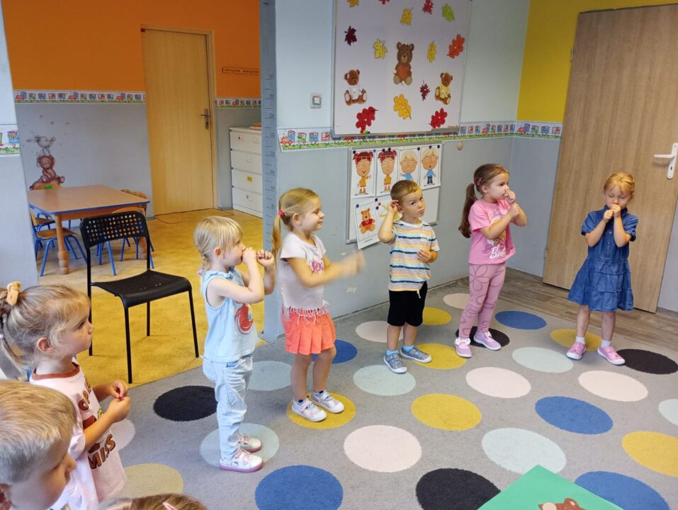Pierwszy tydzień w przedszkolu w grupie „Misie” poświęciliśmy na zapoznanie się z nowym miejscem – salą, jej wyposażeniem, kącikami zainteresowań, przedszkolnymi zwyczajami. Wiele zabaw dotyczyło ważnego i trudnego tematu emocji związanych z odnalezieniem się w przedszkolnej rzeczywistości oraz budowaniu zaufania do swoich pań – były to zabawy integracyjne „Przytulas z misiem”, „Witam chłopców, witam dziewczynki”, „Zapoznaj się z misiem” oraz zabawy rozwijające umiejętność rozpoznawania i określania emocji „Uczucia misia i lali”, „Określamy emocje”, „Złość, radość, smutek i znudzenie”. W drugim tygodniu dużo czasu poświęciliśmy tematyce zasad obowiązujących w grupie – zaczęliśmy od stworzenia grupowego kodeksu, do którego będziemy się bardzo często odwoływać, przypominając o jego poszczególnych zapisach, a także określaliśmy właściwe i nieprawidłowe zachowania dzieci, utrwalaliśmy swoje imiona, opowiadaliśmy o swoich ulubionych zabawkach. Poznaliśmy piosenki: „Jadą misie, Pociąg, Jestem sobie przedszkolaczek, Gruby miś” oraz wiersze ” Mam trzy latka, Sprzątamy zabawki” oraz szereg wyliczanek i zabaw ruchowych z pokazywaniem. Wykonywaliśmy ciekawe prace plastyczne rozwijając sprawność manualną dziecka, (rysowanie, malowanie, stemplowanie), uczyliśmy się rozpoznawania i nazywania podstawowych kolorów, segregowania zabawek, tworzenia zbiorów, przeliczania. Powolutku zaczynamy tworzyć grupę.