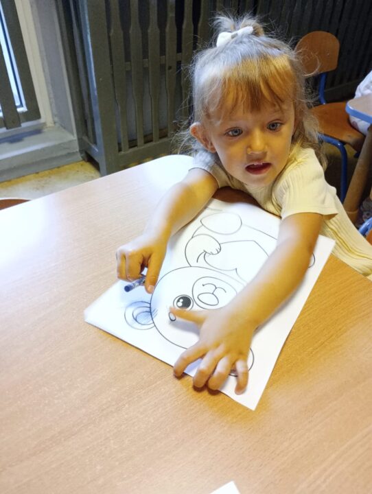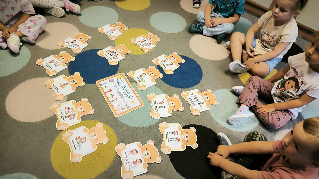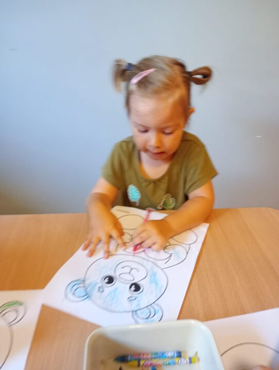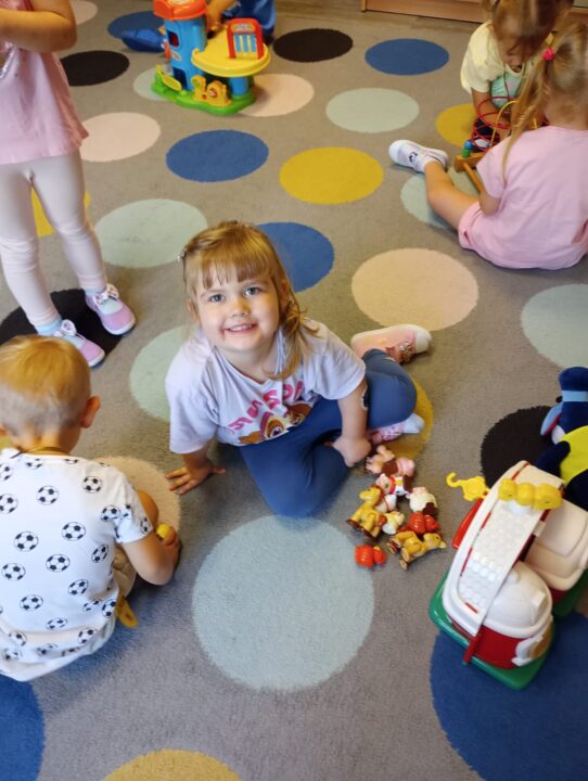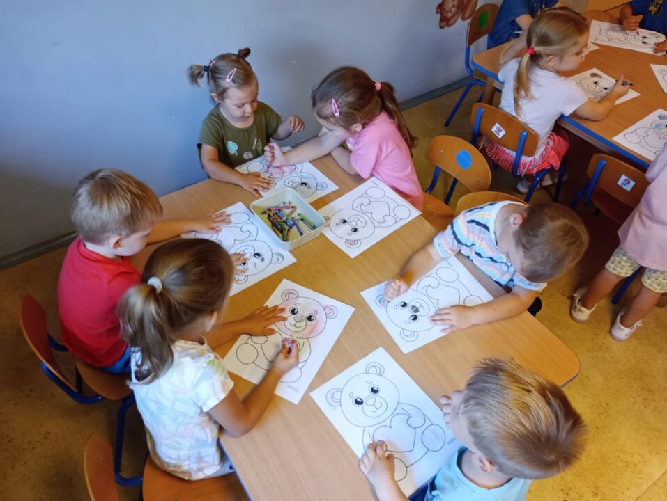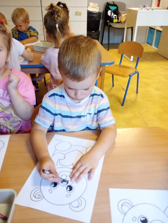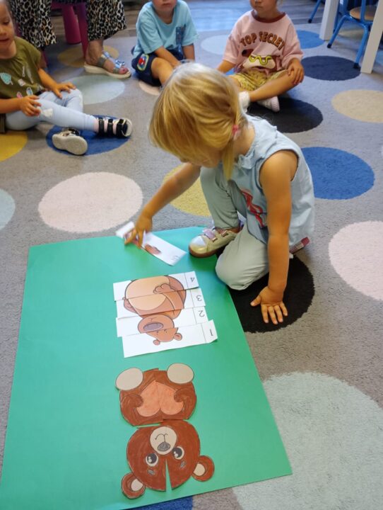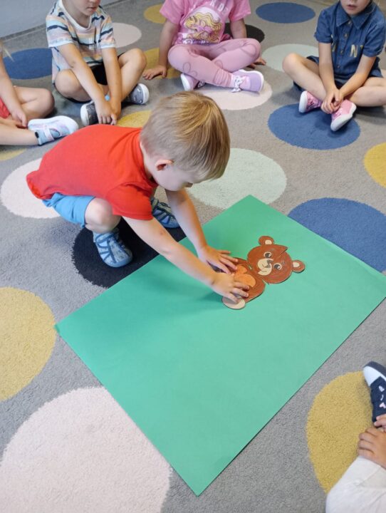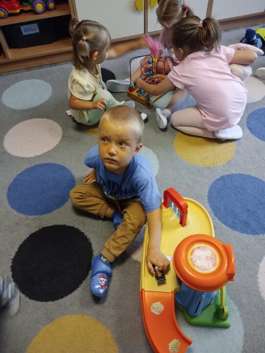 Pierwszy tydzień w przedszkolu w grupie „Misie” poświęciliśmy na zapoznanie się z nowym miejscem – salą, jej wyposażeniem, kącikami zainteresowań, przedszkolnymi zwyczajami. Wiele zabaw dotyczyło ważnego i trudnego tematu emocji związanych z odnalezieniem się w przedszkolnej rzeczywistości oraz budowaniu zaufania do swoich pań – były to zabawy integracyjne „Przytulas z misiem”, „Witam chłopców, witam dziewczynki”, „Zapoznaj się z misiem” oraz zabawy rozwijające umiejętność rozpoznawania i określania emocji „Uczucia misia i lali”, „Określamy emocje”, „Złość, radość, smutek i znudzenie”. W drugim tygodniu dużo czasu poświęciliśmy tematyce zasad obowiązujących w grupie – zaczęliśmy od stworzenia grupowego kodeksu, do którego będziemy się bardzo często odwoływać, przypominając o jego poszczególnych zapisach, a także określaliśmy właściwe i nieprawidłowe zachowania dzieci, utrwalaliśmy swoje imiona, opowiadaliśmy o swoich ulubionych zabawkach. Poznaliśmy piosenki: „Jadą misie, Pociąg, Jestem sobie przedszkolaczek, Gruby miś” oraz wiersze ” Mam trzy latka, Sprzątamy zabawki” oraz szereg wyliczanek i zabaw ruchowych z pokazywaniem. Wykonywaliśmy ciekawe prace plastyczne rozwijając sprawność manualną dziecka, (rysowanie, malowanie, stemplowanie), uczyliśmy się rozpoznawania i nazywania podstawowych kolorów, segregowania zabawek, tworzenia zbiorów, przeliczania. Powolutku zaczynamy tworzyć grupę.