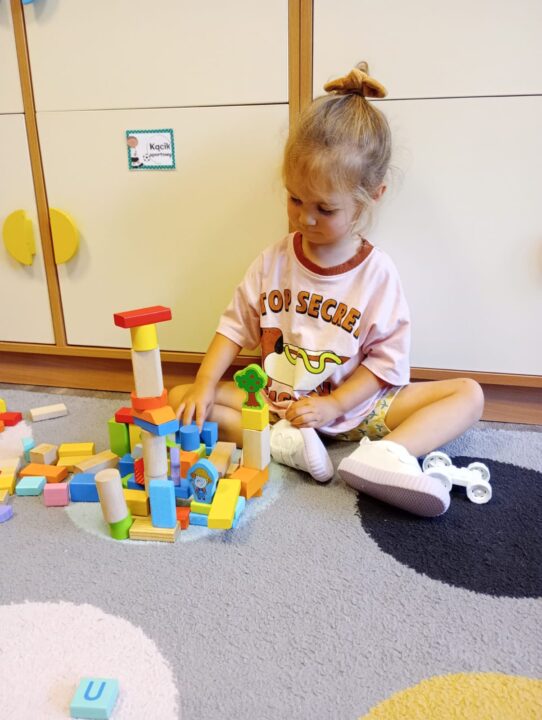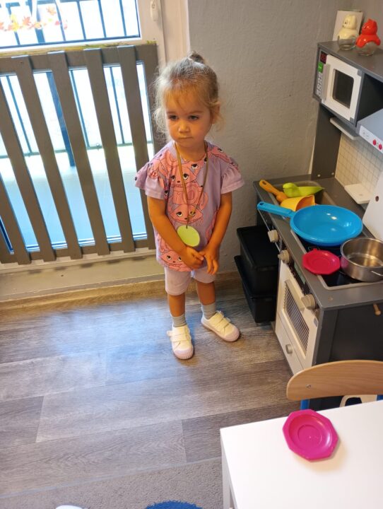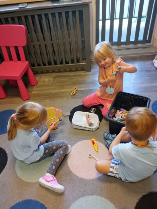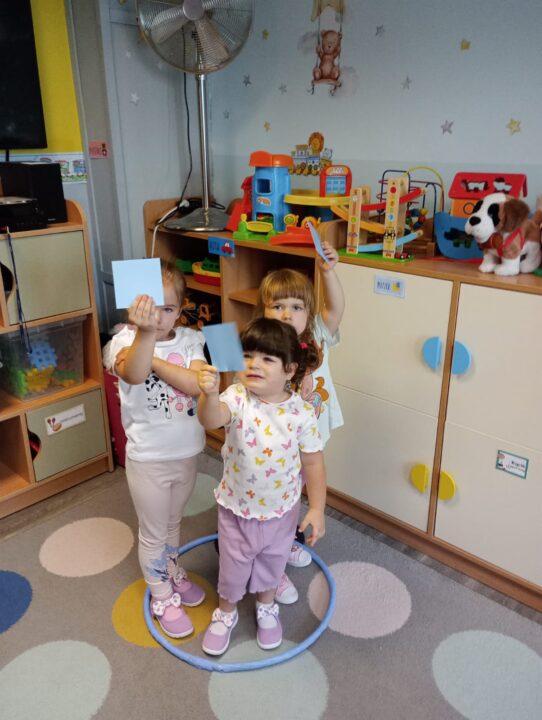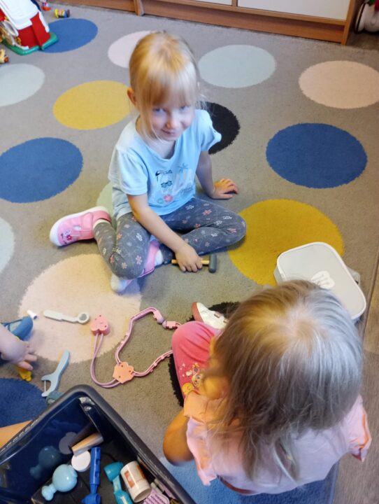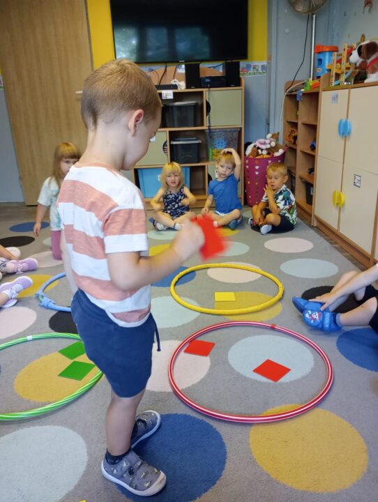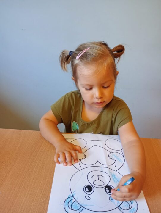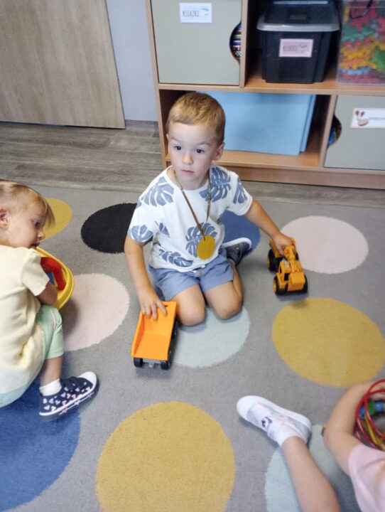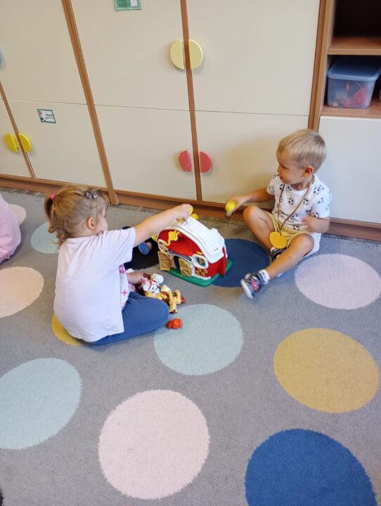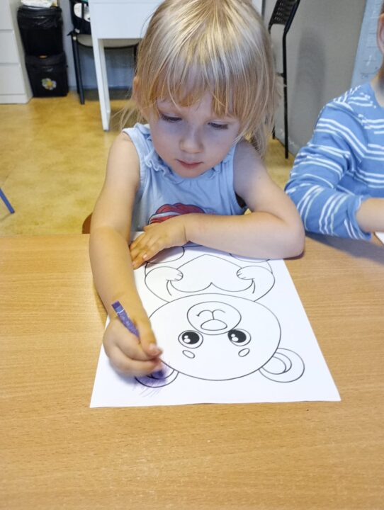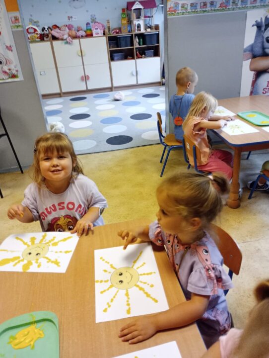 Pierwszy tydzień w przedszkolu w grupie „Misie” poświęciliśmy na zapoznanie się z nowym miejscem – salą, jej wyposażeniem, kącikami zainteresowań, przedszkolnymi zwyczajami. Wiele zabaw dotyczyło ważnego i trudnego tematu emocji związanych z odnalezieniem się w przedszkolnej rzeczywistości oraz budowaniu zaufania do swoich pań – były to zabawy integracyjne „Przytulas z misiem”, „Witam chłopców, witam dziewczynki”, „Zapoznaj się z misiem” oraz zabawy rozwijające umiejętność rozpoznawania i określania emocji „Uczucia misia i lali”, „Określamy emocje”, „Złość, radość, smutek i znudzenie”. W drugim tygodniu dużo czasu poświęciliśmy tematyce zasad obowiązujących w grupie – zaczęliśmy od stworzenia grupowego kodeksu, do którego będziemy się bardzo często odwoływać, przypominając o jego poszczególnych zapisach, a także określaliśmy właściwe i nieprawidłowe zachowania dzieci, utrwalaliśmy swoje imiona, opowiadaliśmy o swoich ulubionych zabawkach. Poznaliśmy piosenki: „Jadą misie, Pociąg, Jestem sobie przedszkolaczek, Gruby miś” oraz wiersze ” Mam trzy latka, Sprzątamy zabawki” oraz szereg wyliczanek i zabaw ruchowych z pokazywaniem. Wykonywaliśmy ciekawe prace plastyczne rozwijając sprawność manualną dziecka, (rysowanie, malowanie, stemplowanie), uczyliśmy się rozpoznawania i nazywania podstawowych kolorów, segregowania zabawek, tworzenia zbiorów, przeliczania. Powolutku zaczynamy tworzyć grupę.