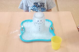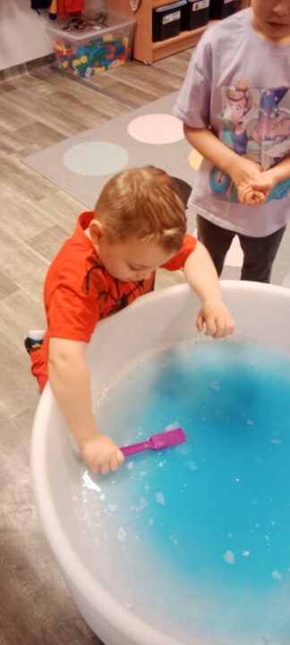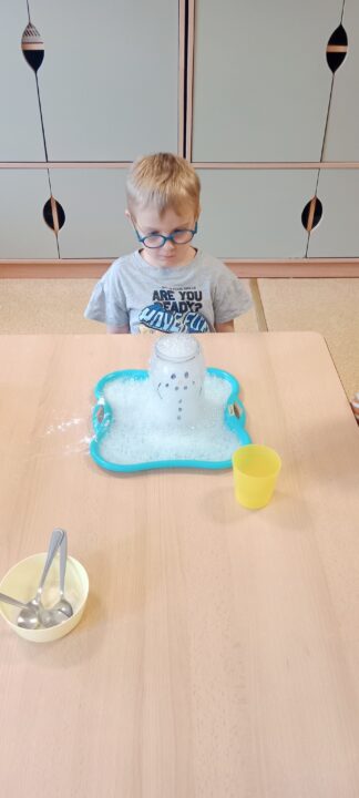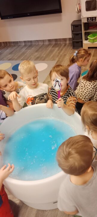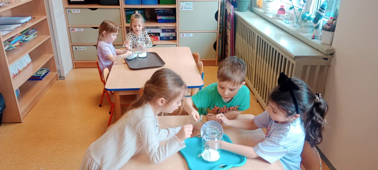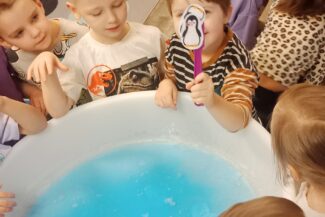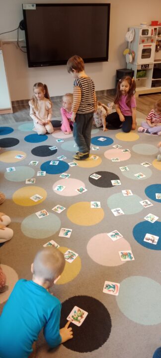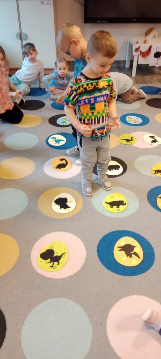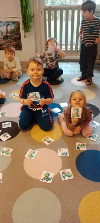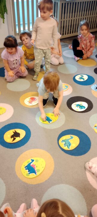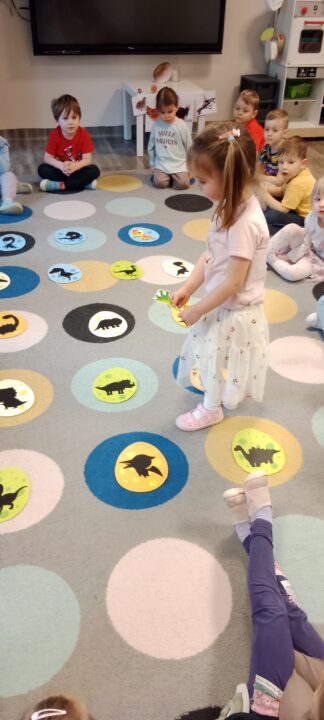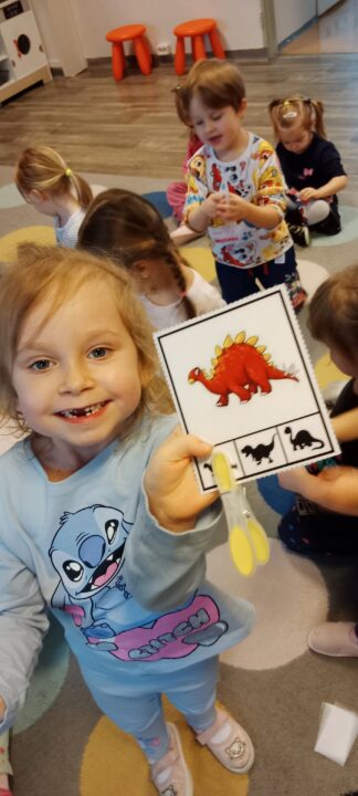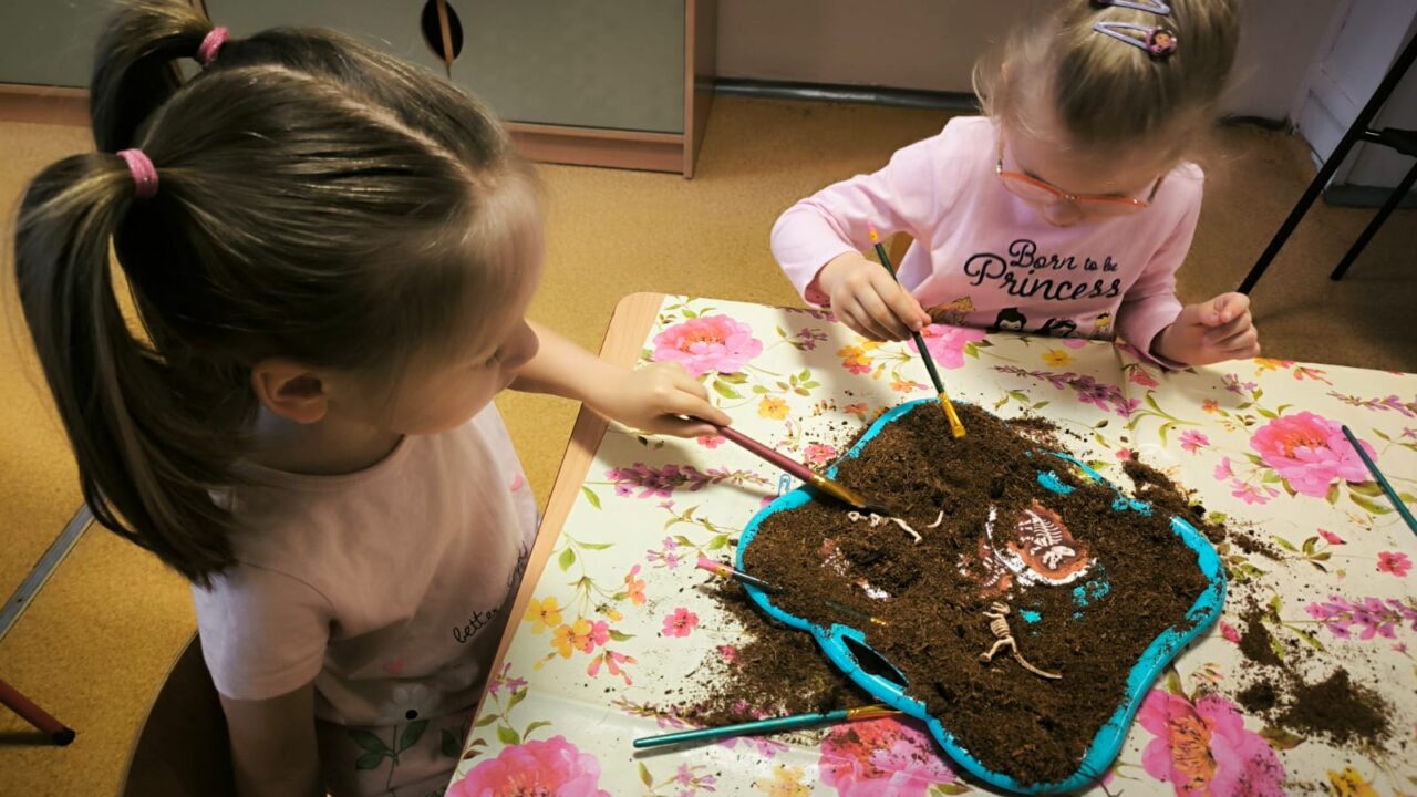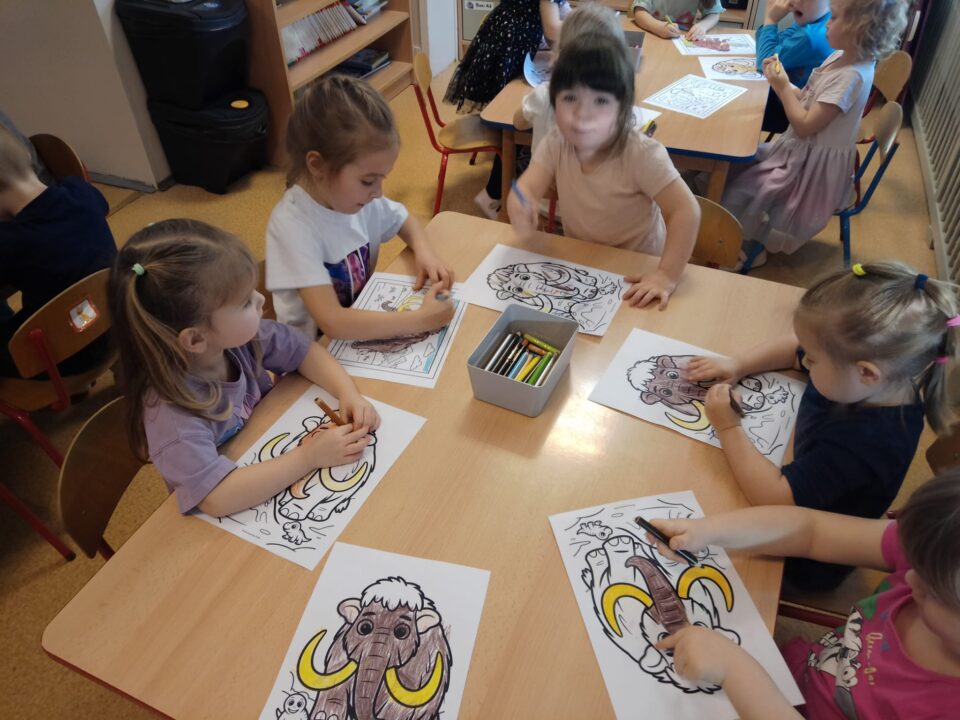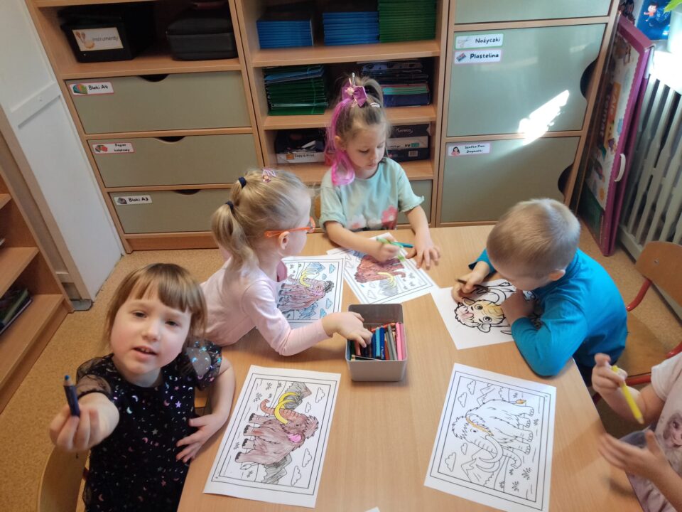 o wykopaliskach. Podczas zabaw matematycznych utrwalały znajomość figur geometrycznych. Wysłuchały wiersza „Świat dinozaurów” M. Przewoźniaka i na podstawie rozmowy o jego bohaterach klasyfikowały wielkie gady zgodnie z ich sposobem odżywiania się. Wysłuchały również ciekawostek dotyczących prehistorycznych czasów oraz dzieliły się wiedzą o zawodach paleontologa i archeologa. „Kiedy zlodowaciał świat” to zabawa, podczas której dzieci próbowały odpowiedzieć na pytanie, co się stało z dinozaurami. W tym celu oglądały w internecie film edukacyjny na temat wyginięcia dinozaurów. Zapoznały się też ze zdjęciami zwierząt z epoki lodowcowej, między innymi mamuta