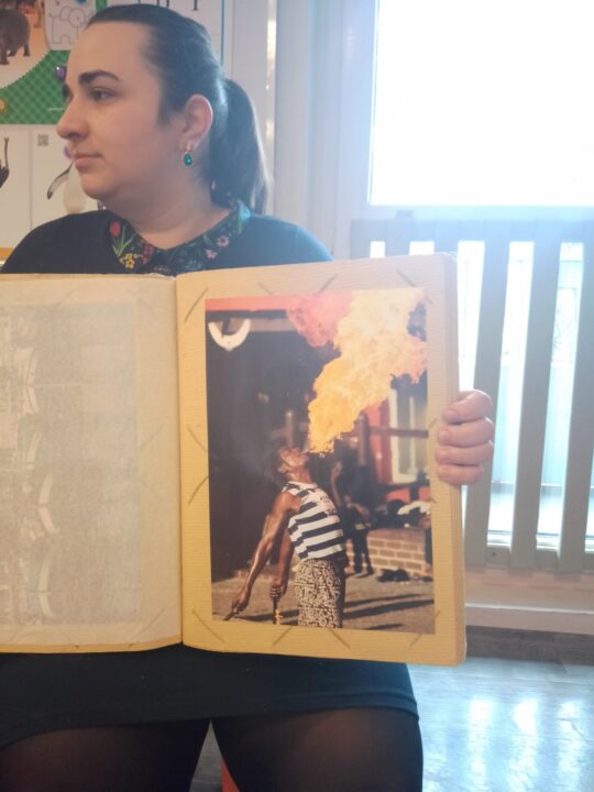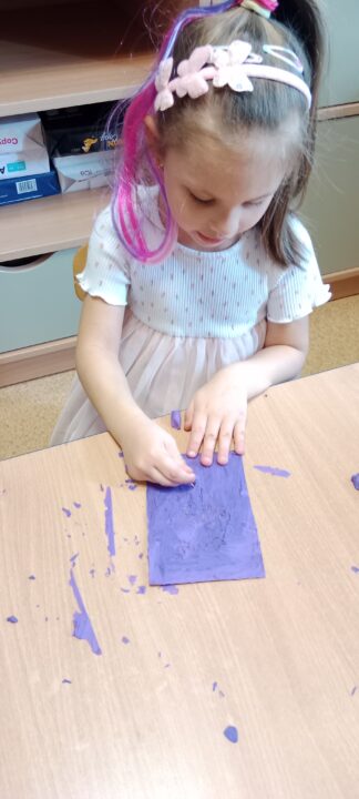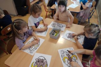 i tygrysa szablozębnego. Rozmawiały na temat znaczenia ognia w życiu ludzi w dawnych czasach. Dzieci wykonały pracę plastyczną „Rysunki naskalne”. Rysowanie poprzedzone było oglądaniem ilustracji malarstwa naskalnego w grotach i jaskiniach. Prehistorię poznawały także przez liczne działania plastyczne: tworzenie mini wykopaliska archeologicznego czy wykonanie pracy plastyczno-technicznej z wyprawki „Pradawne ozdoby”.