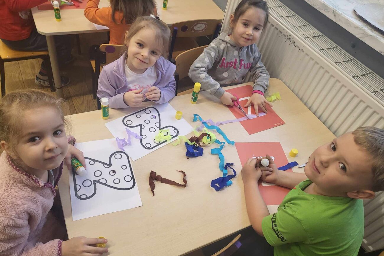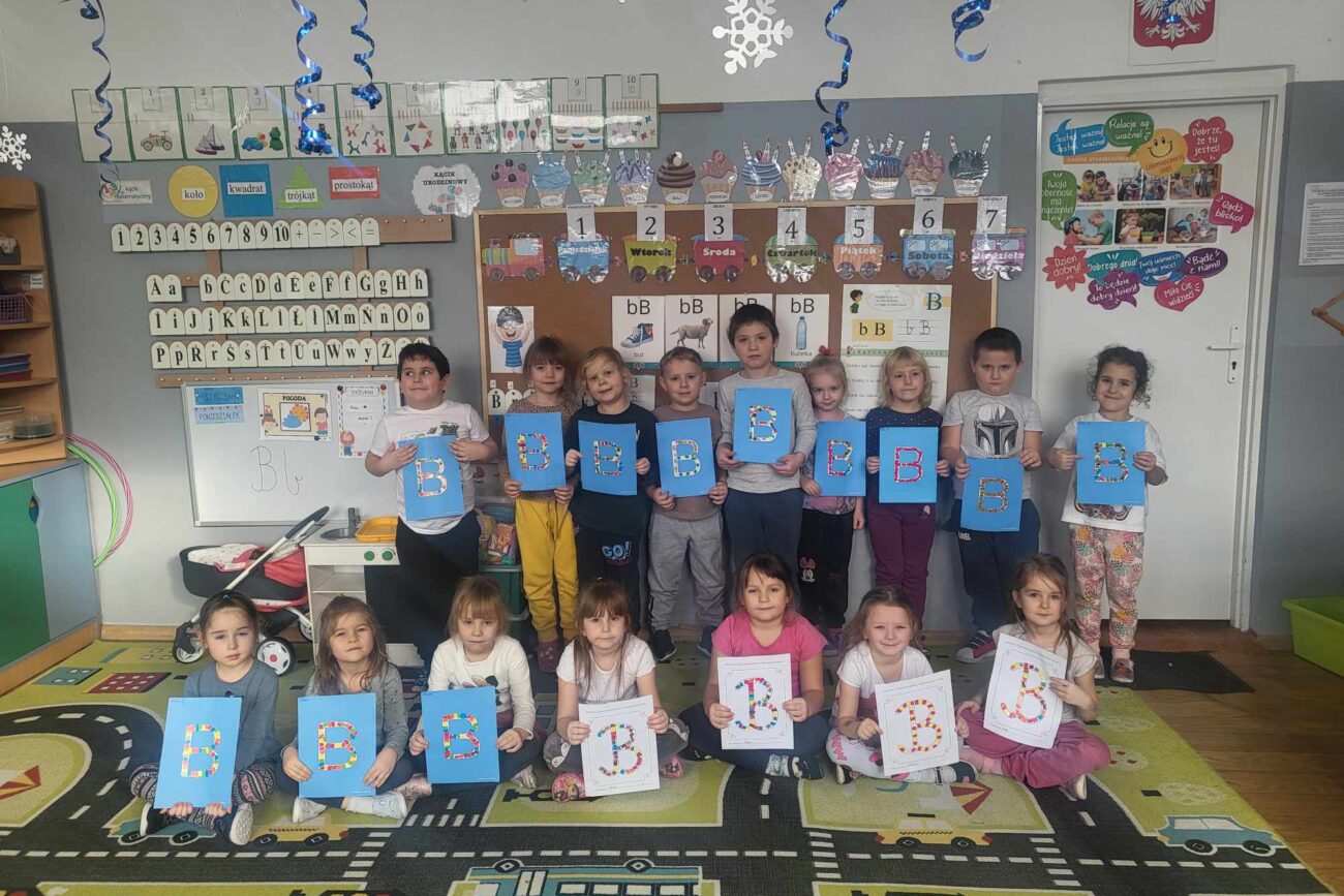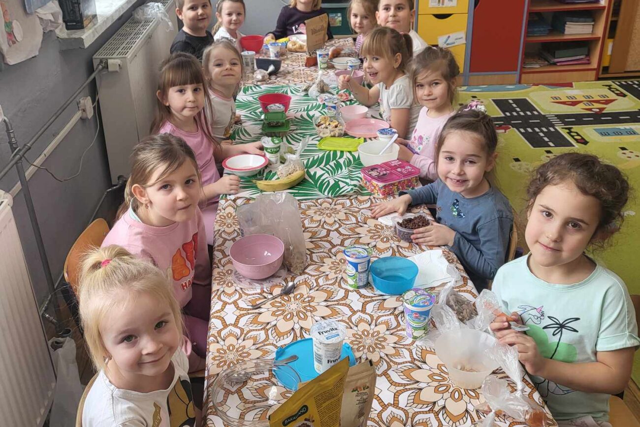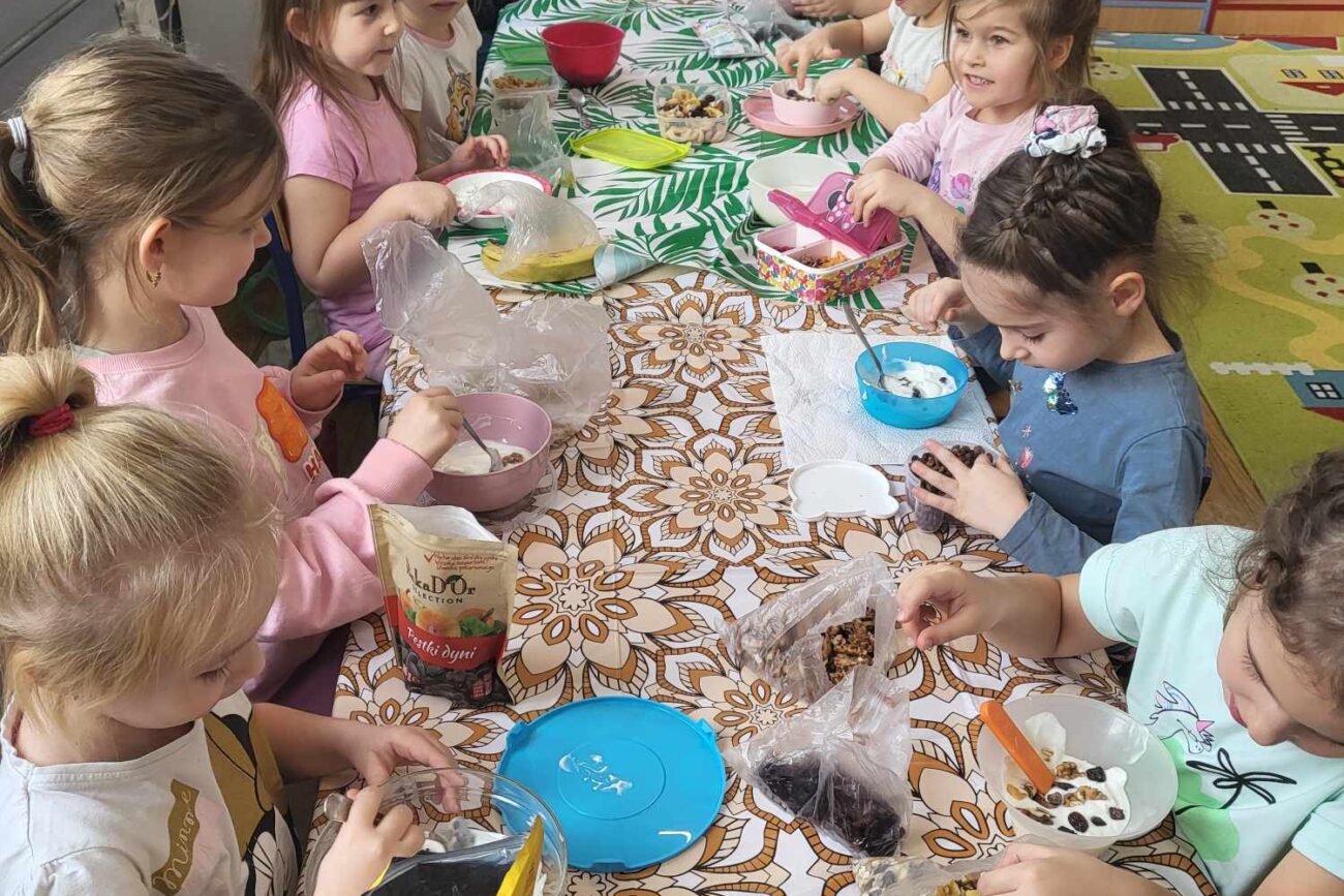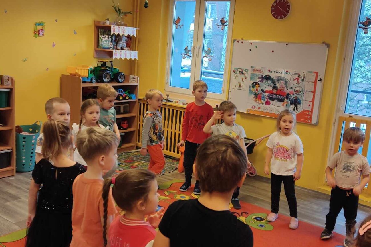 „Biedronki ” poznały litery „Z”, „B”, których kontur wypełniały przy użyciu różnych materiałów. Opanowały treść wiersza T.Fiutowskiej:” Co robią dni tygodnia?”, układając do niego we właściwej kolejności obrazki. Poznały znak matematyczny ,,+”, gdzie odczytywały i układały zapisy działań na dodawanie w zakresie 5. Brały udział w zabawie dydaktycznej: „Przyjęcie dla babci i dziadka „, gdzie miały za zadanie rozdzielić po tyle samo „smakołyków”. Doskonaliły umiejętność mierzenia długości przy pomocy sznurka. W ramach Ogólnopolskiego Projektu Edukacyjnego „Gramy zmysłami” grupa przygotowała zdrowe II śniadanie. Na sali gimnastycznej odbyły się zabawy ruchowe oraz zumba.