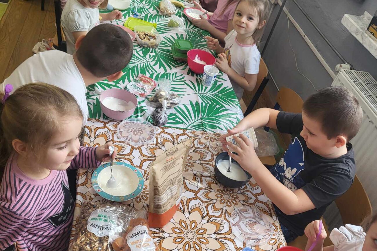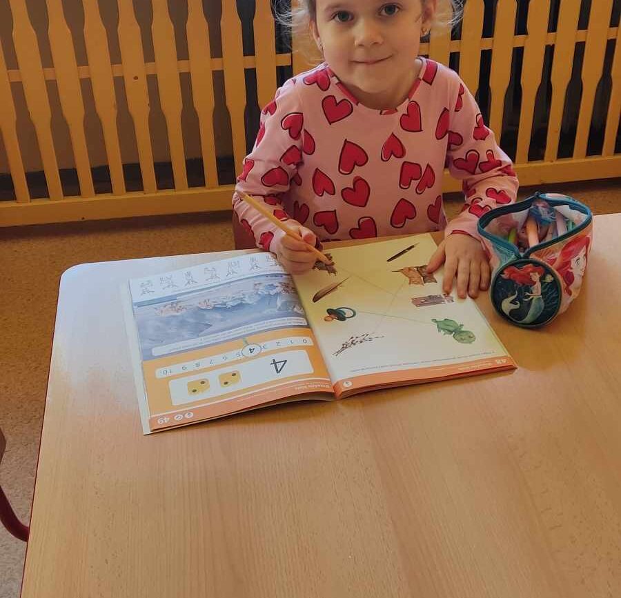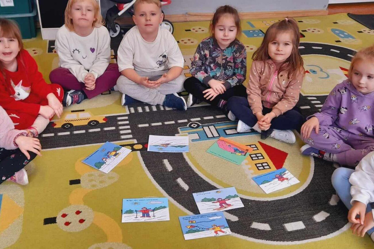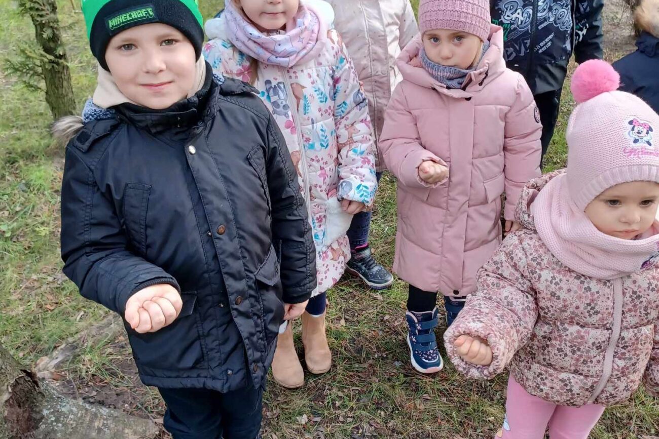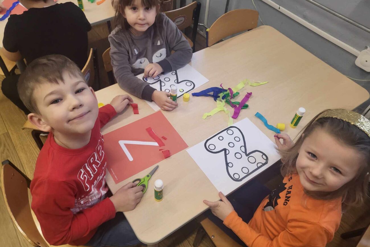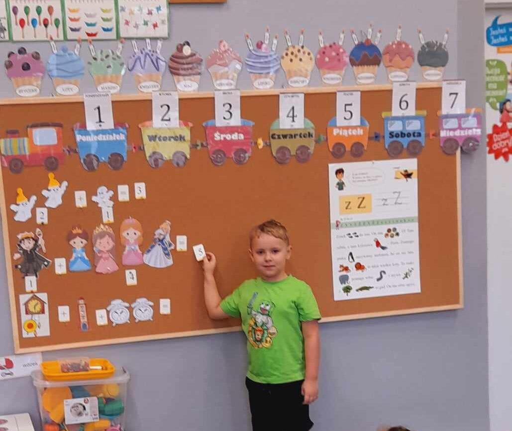 „Biedronki ” poznały litery „Z”, „B”, których kontur wypełniały przy użyciu różnych materiałów. Opanowały treść wiersza T.Fiutowskiej:” Co robią dni tygodnia?”, układając do niego we właściwej kolejności obrazki. Poznały znak matematyczny ,,+”, gdzie odczytywały i układały zapisy działań na dodawanie w zakresie 5. Brały udział w zabawie dydaktycznej: „Przyjęcie dla babci i dziadka „, gdzie miały za zadanie rozdzielić po tyle samo „smakołyków”. Doskonaliły umiejętność mierzenia długości przy pomocy sznurka. W ramach Ogólnopolskiego Projektu Edukacyjnego „Gramy zmysłami” grupa przygotowała zdrowe II śniadanie. Na sali gimnastycznej odbyły się zabawy ruchowe oraz zumba.