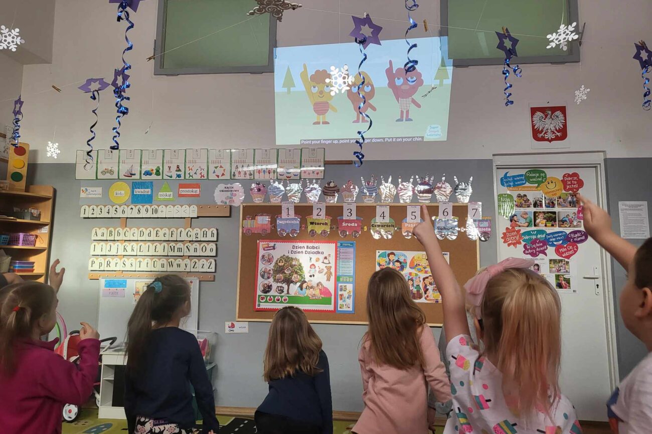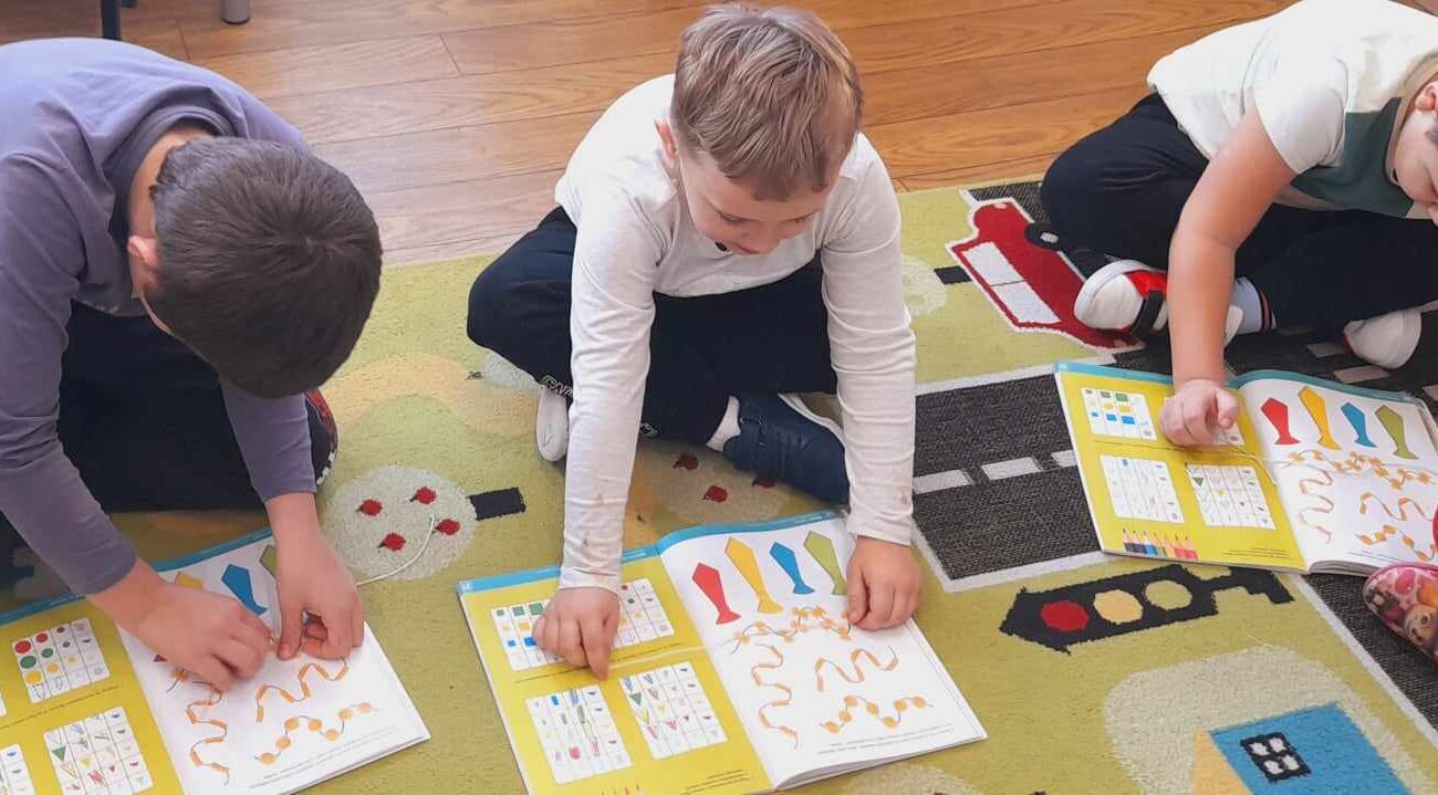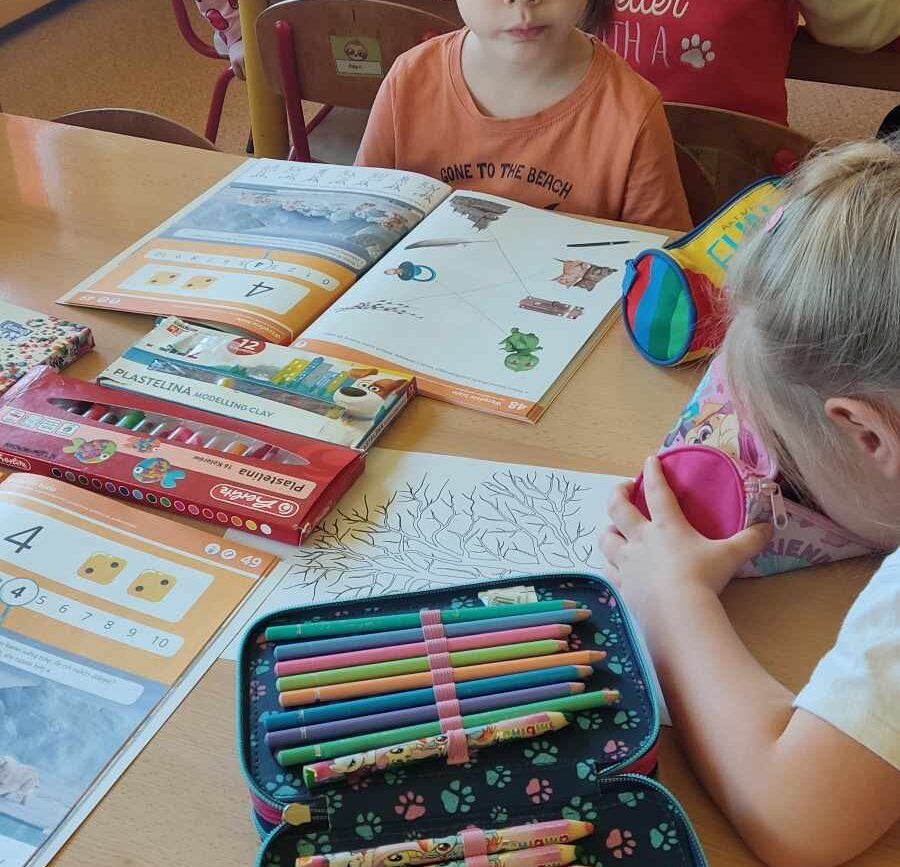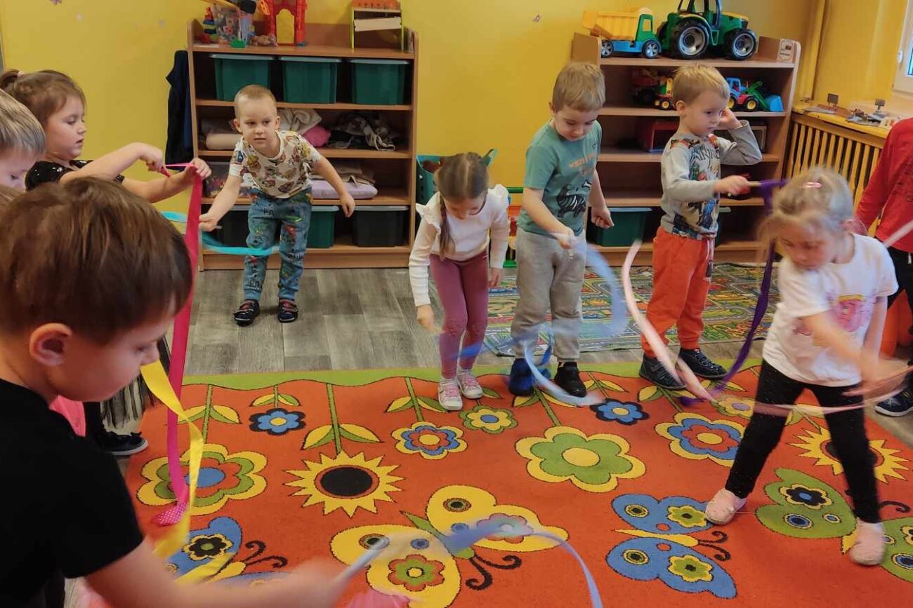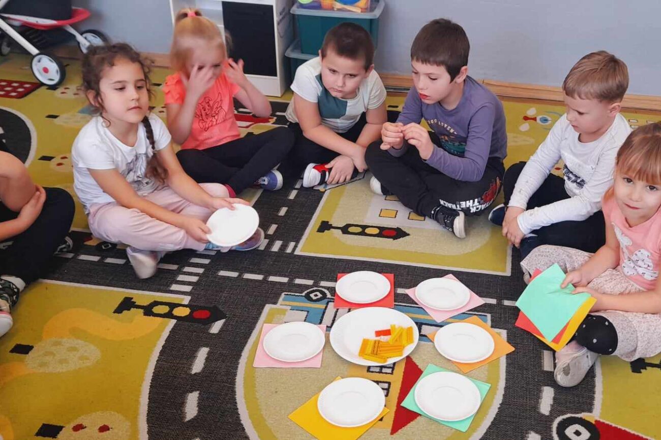 „Biedronki ” poznały litery „Z”, „B”, których kontur wypełniały przy użyciu różnych materiałów. Opanowały treść wiersza T.Fiutowskiej:” Co robią dni tygodnia?”, układając do niego we właściwej kolejności obrazki. Poznały znak matematyczny ,,+”, gdzie odczytywały i układały zapisy działań na dodawanie w zakresie 5. Brały udział w zabawie dydaktycznej: „Przyjęcie dla babci i dziadka „, gdzie miały za zadanie rozdzielić po tyle samo „smakołyków”. Doskonaliły umiejętność mierzenia długości przy pomocy sznurka. W ramach Ogólnopolskiego Projektu Edukacyjnego „Gramy zmysłami” grupa przygotowała zdrowe II śniadanie. Na sali gimnastycznej odbyły się zabawy ruchowe oraz zumba.