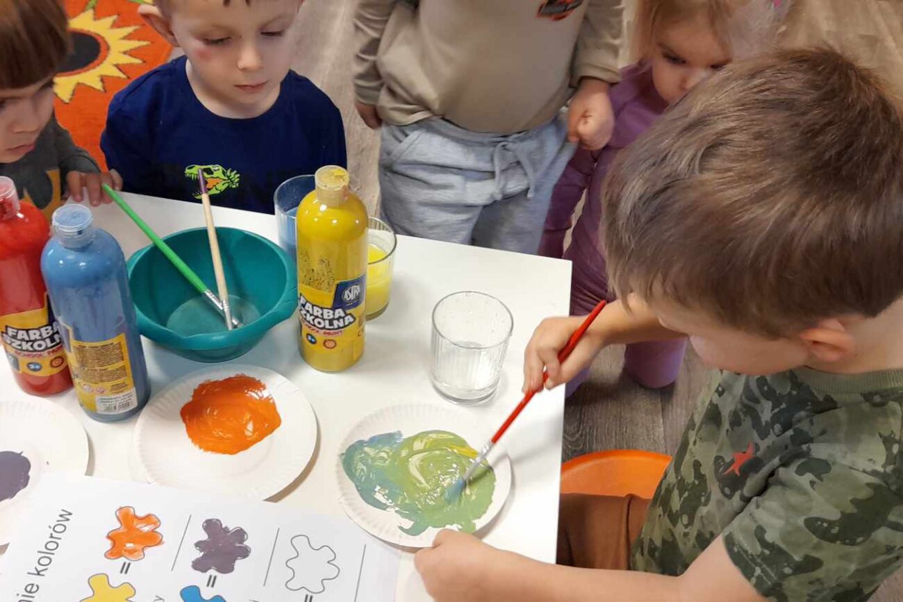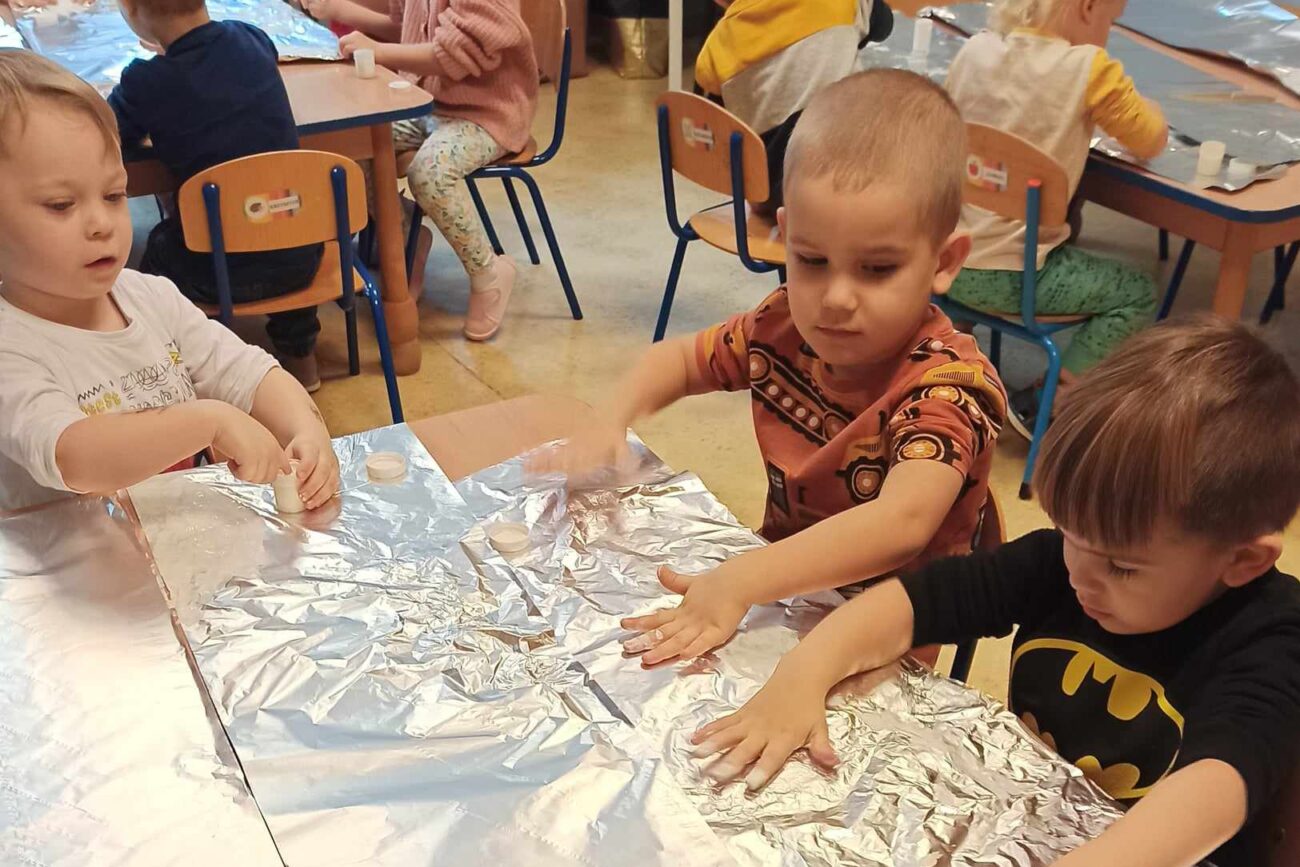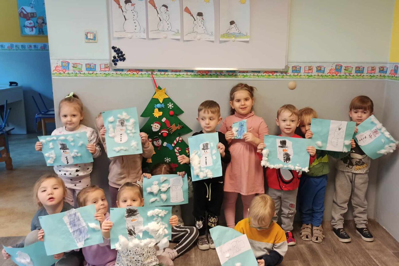 Dzieci z grupy „Misie” poznawały właściwości barw i sprawdzały, co wyjdzie z ich połączenia utrwalając nazwy kolorów. Z uwagą słuchały opowiadania o śniegu, rozmawiały o jego cechach, a także dowiedziały się, że nie ma dwóch takich samych śnieżynek. Dzieci tworzyły śnieżki i bałwanki z waty oraz wykonały prace plastyczne: bałwanka na śniegu oraz zimowy obrazek na folii.