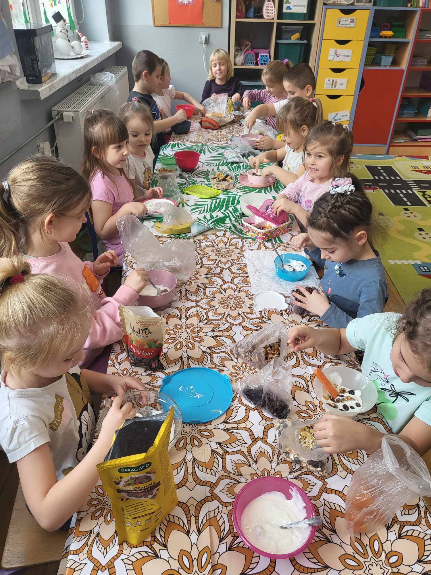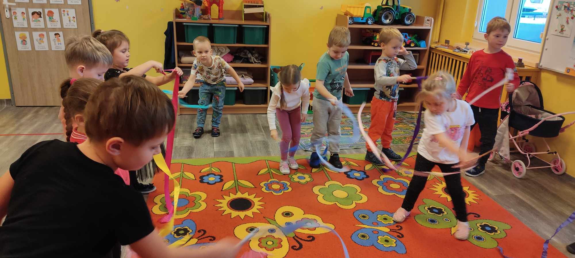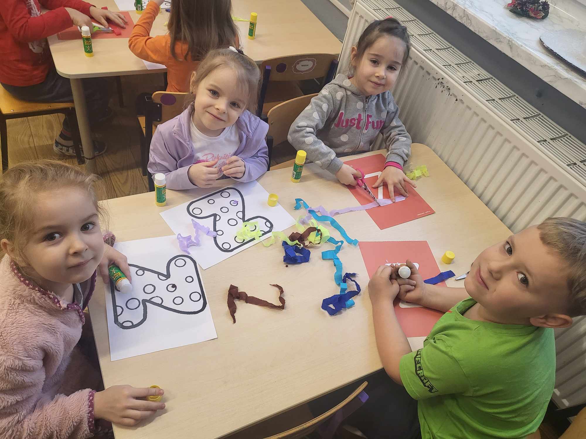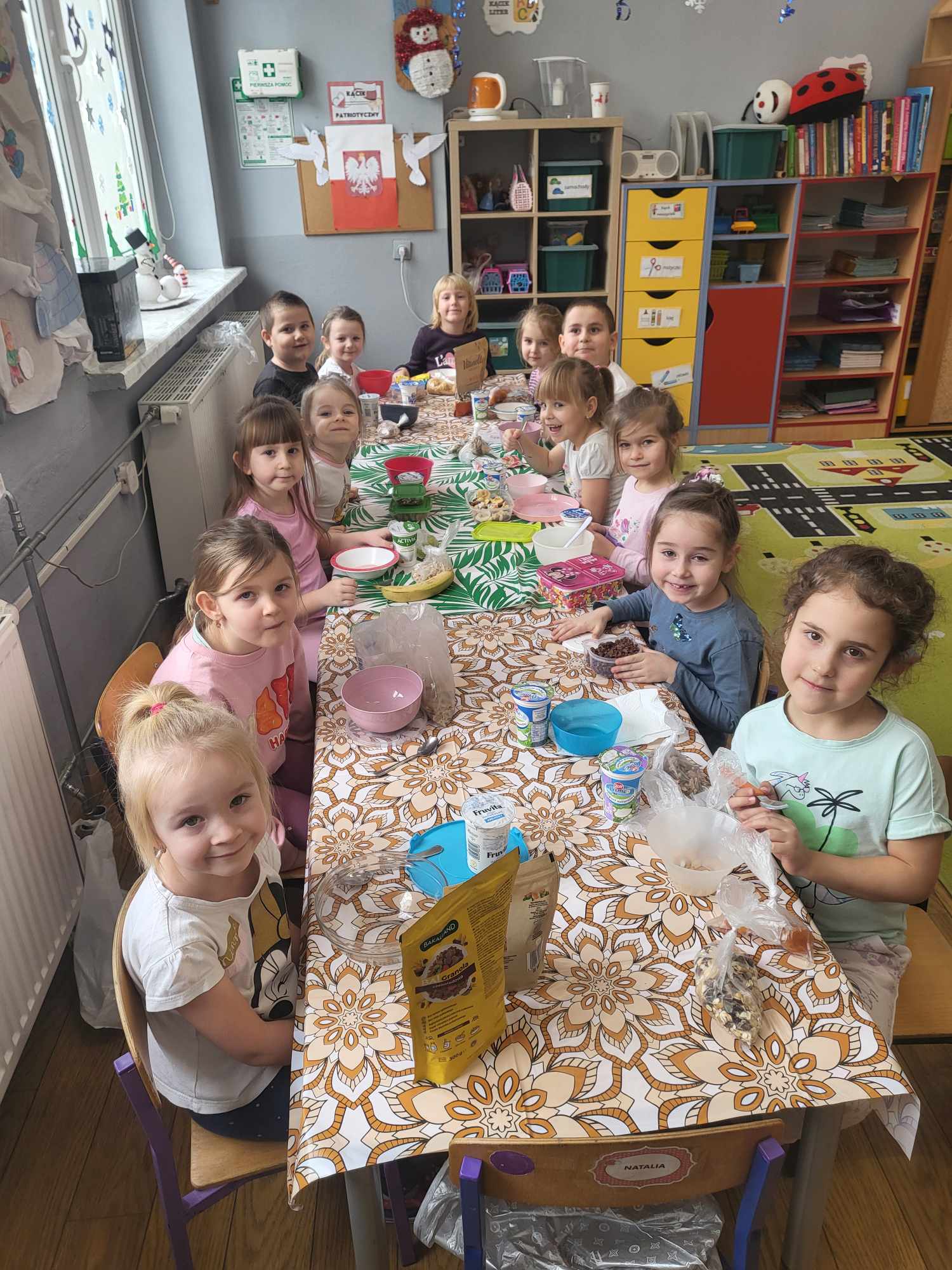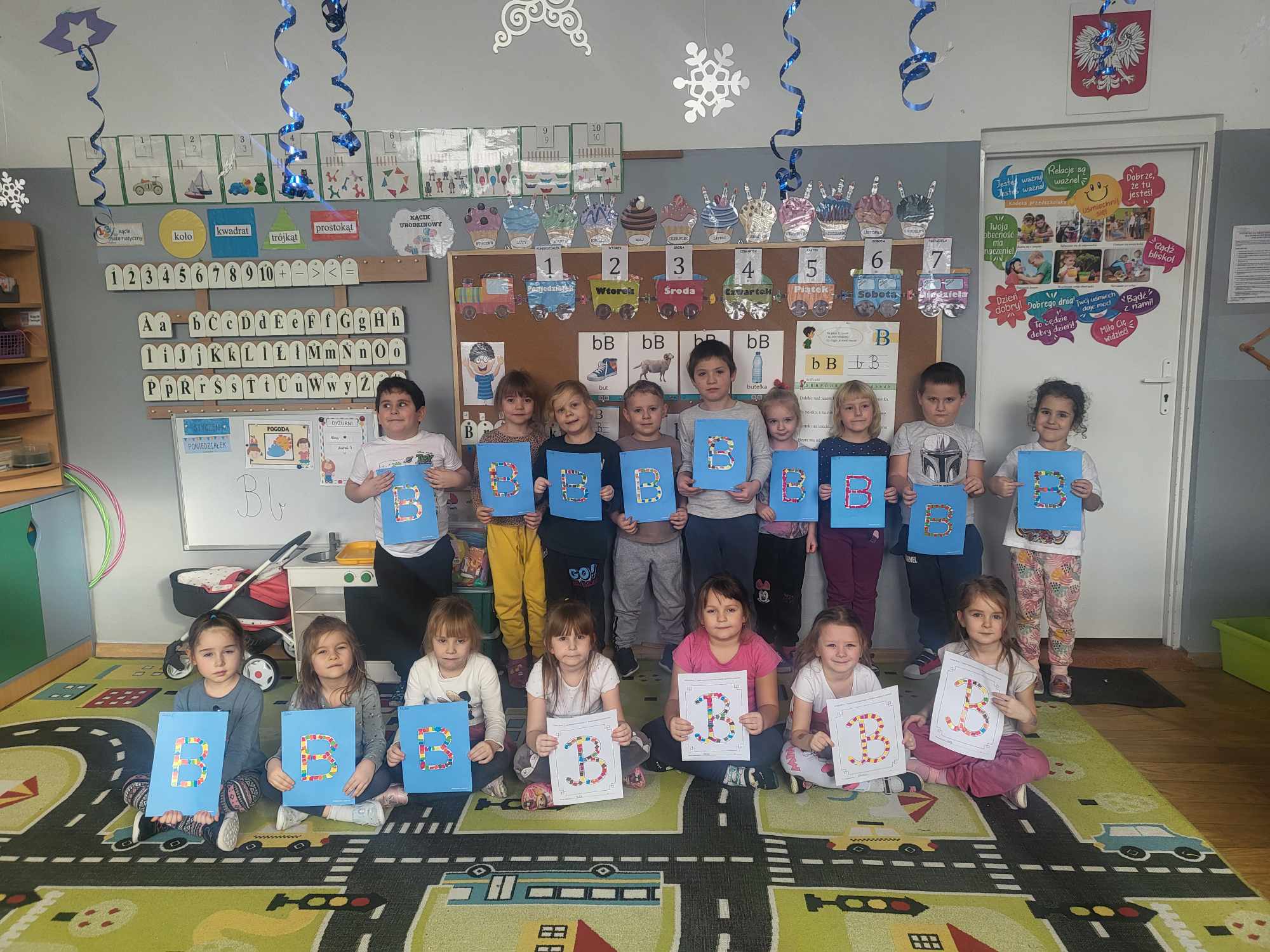 „Biedronki ” poznały litery „Z”, „B”, których kontur wypełniały przy użyciu różnych materiałów. Opanowały treść wiersza T.Fiutowskiej:” Co robią dni tygodnia?”, układając do niego we właściwej kolejności obrazki. Poznały znak matematyczny ,,+”, gdzie odczytywały i układały zapisy działań na dodawanie w zakresie 5. Brały udział w zabawie dydaktycznej: „Przyjęcie dla babci i dziadka „, gdzie miały za zadanie rozdzielić po tyle samo „smakołyków”. Doskonaliły umiejętność mierzenia długości przy pomocy sznurka. W ramach Ogólnopolskiego Projektu Edukacyjnego „Gramy zmysłami” grupa przygotowała zdrowe II śniadanie. Na sali gimnastycznej odbyły się zabawy ruchowe oraz zumba.
