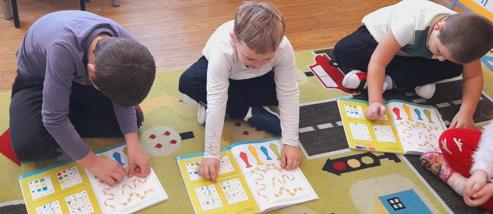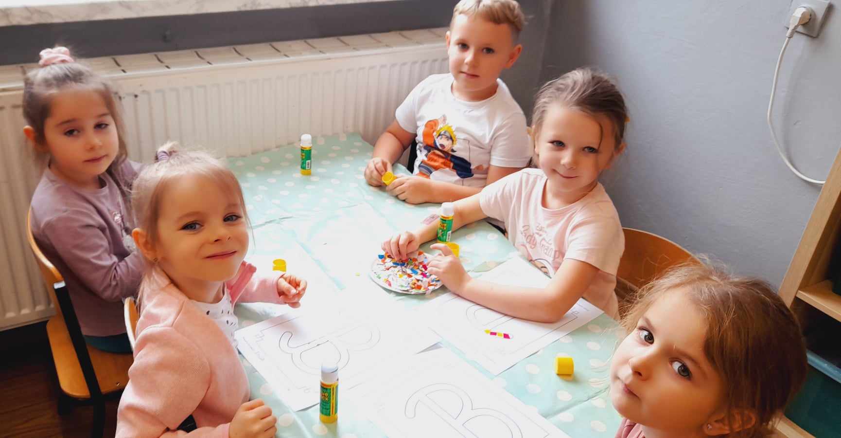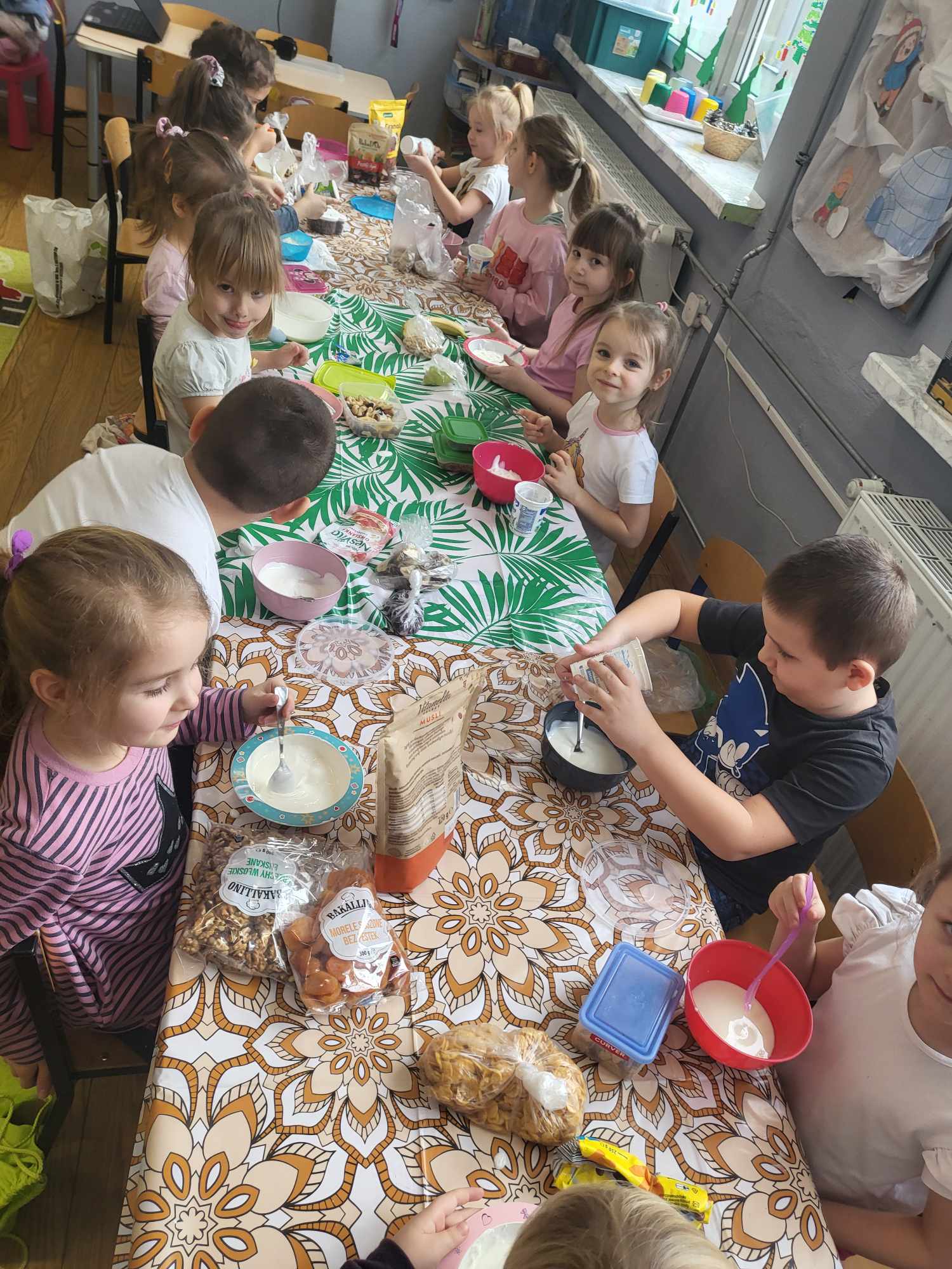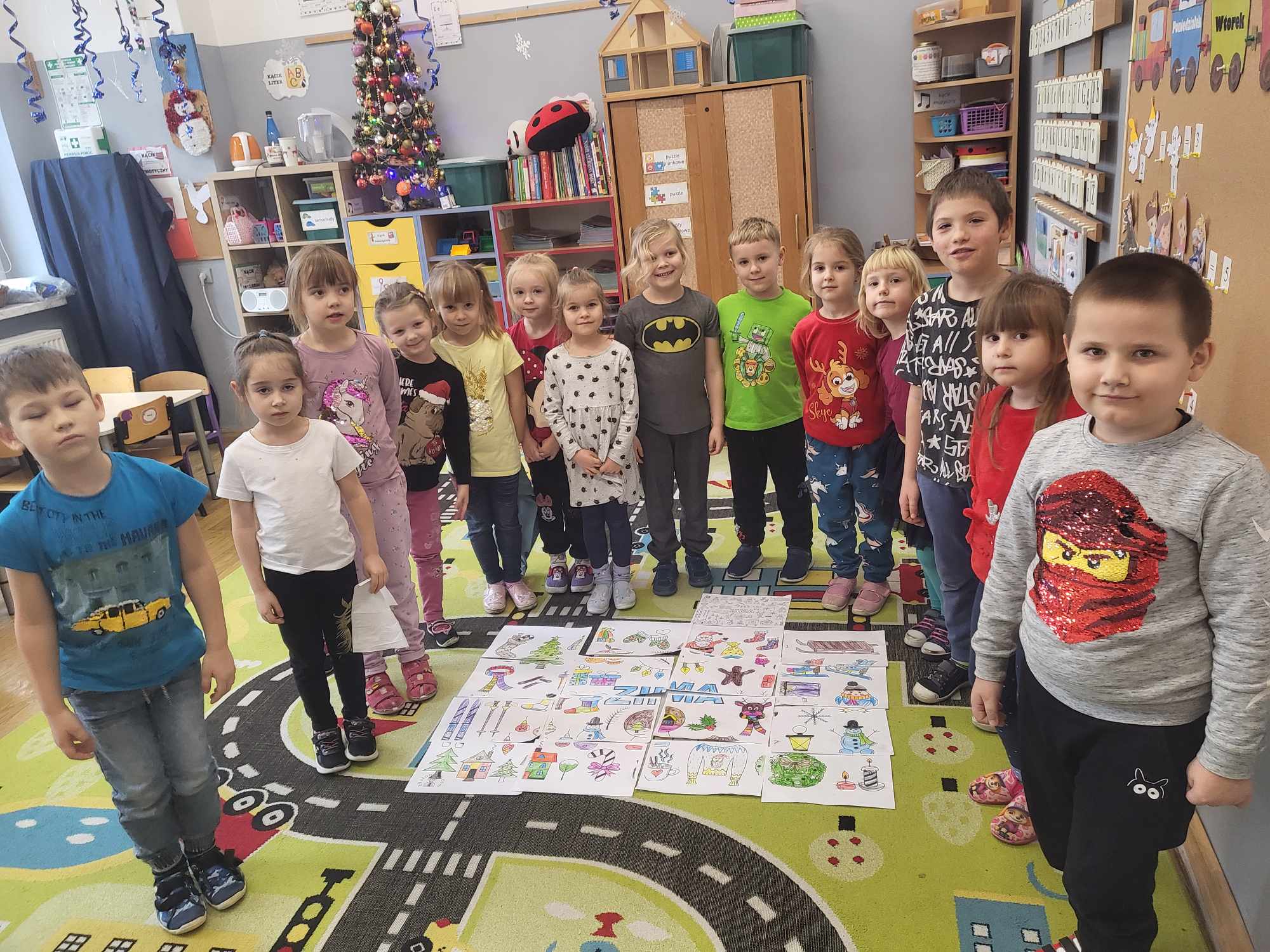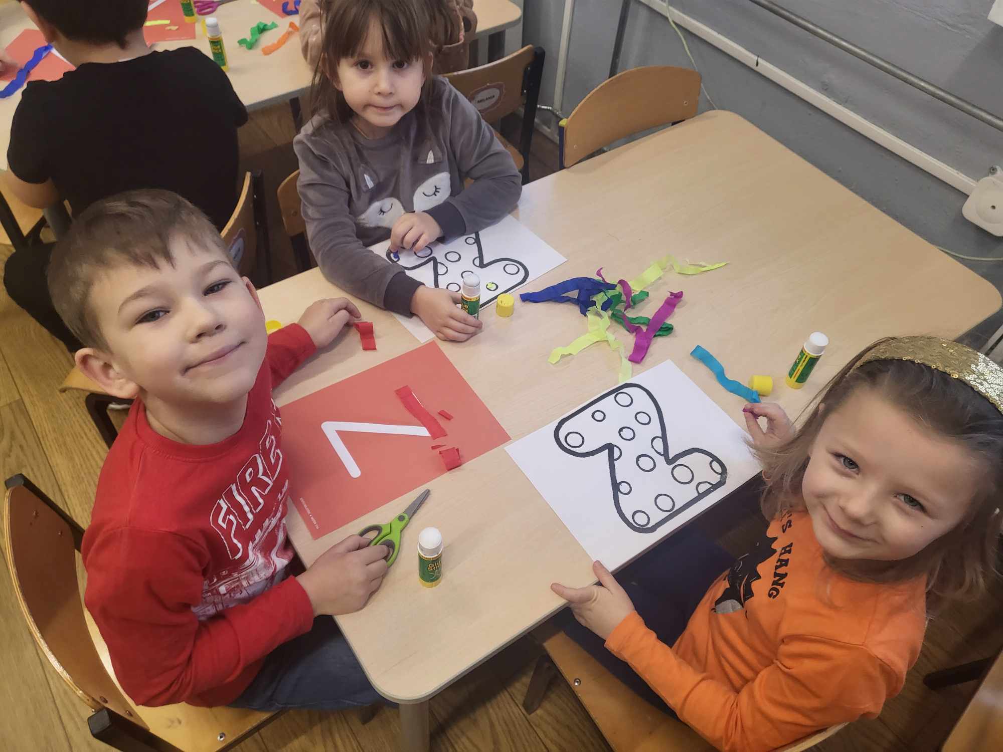 „Biedronki ” poznały litery „Z”, „B”, których kontur wypełniały przy użyciu różnych materiałów. Opanowały treść wiersza T.Fiutowskiej:” Co robią dni tygodnia?”, układając do niego we właściwej kolejności obrazki. Poznały znak matematyczny ,,+”, gdzie odczytywały i układały zapisy działań na dodawanie w zakresie 5. Brały udział w zabawie dydaktycznej: „Przyjęcie dla babci i dziadka „, gdzie miały za zadanie rozdzielić po tyle samo „smakołyków”. Doskonaliły umiejętność mierzenia długości przy pomocy sznurka. W ramach Ogólnopolskiego Projektu Edukacyjnego „Gramy zmysłami” grupa przygotowała zdrowe II śniadanie. Na sali gimnastycznej odbyły się zabawy ruchowe oraz zumba.