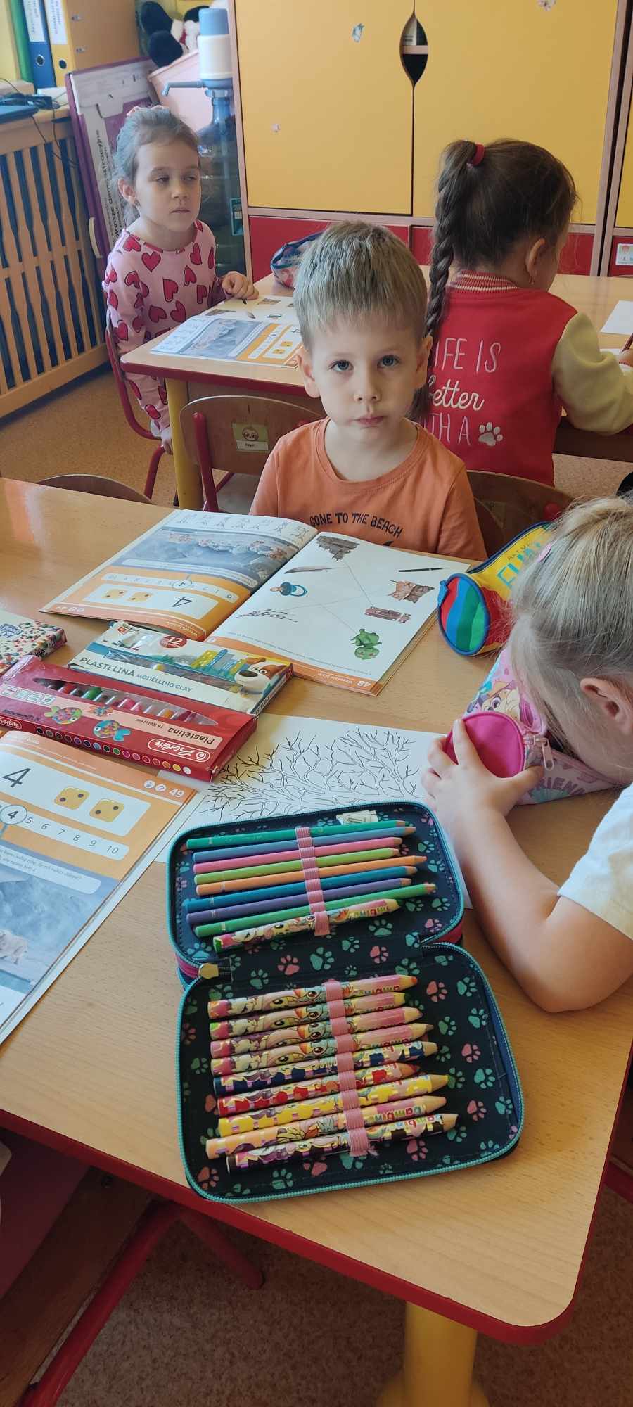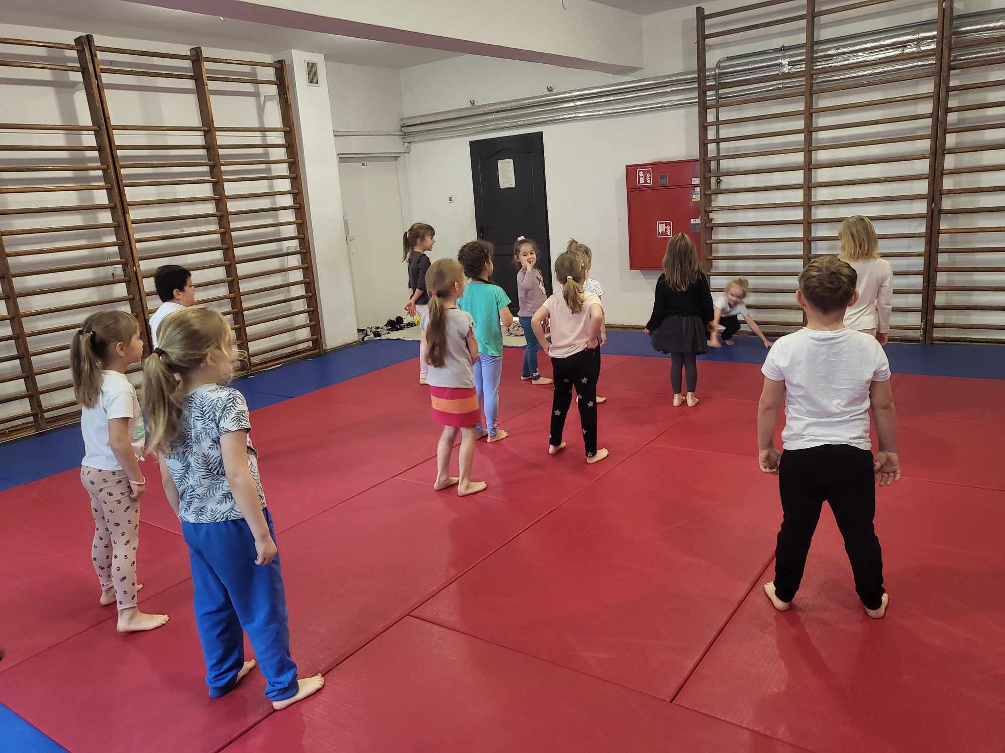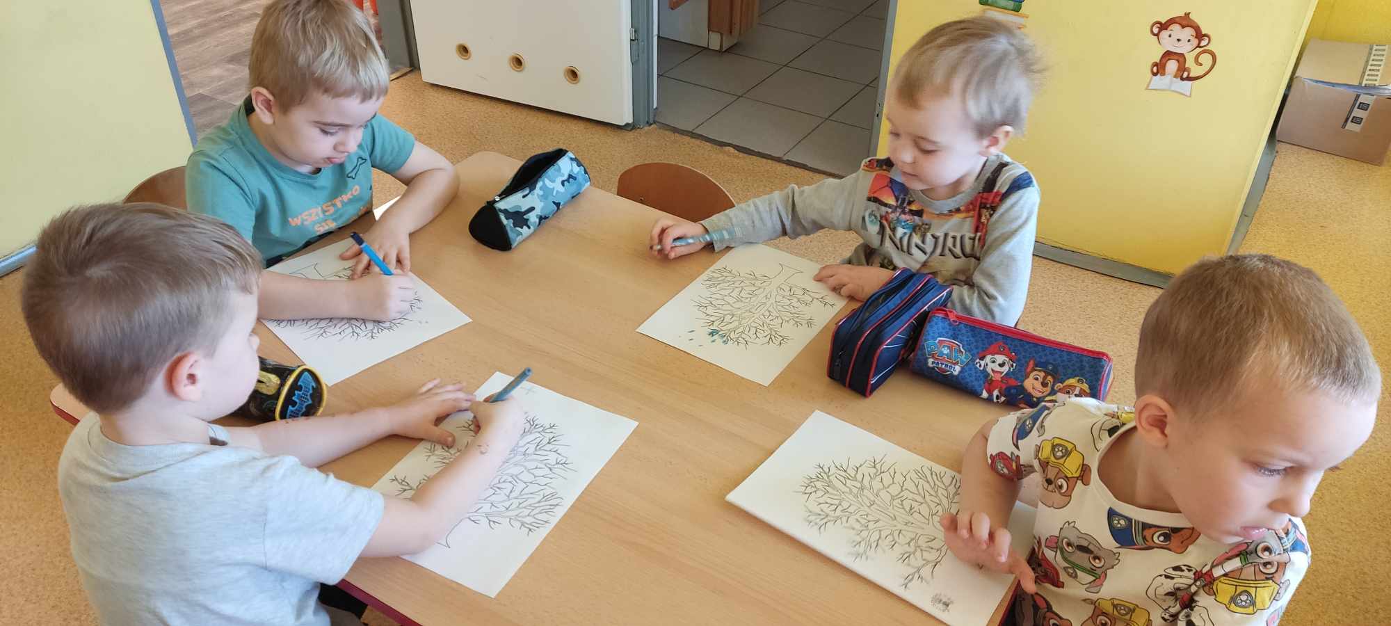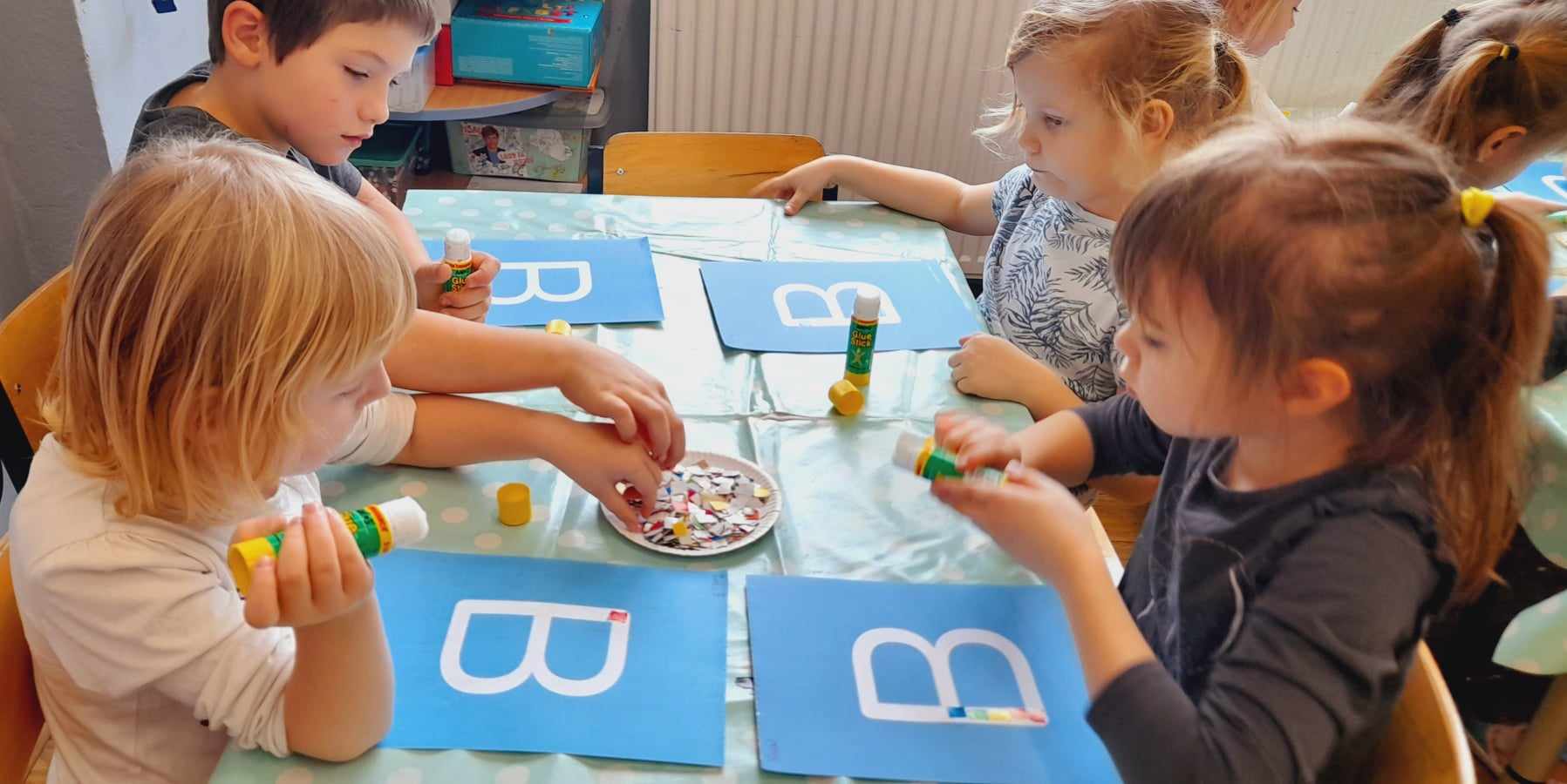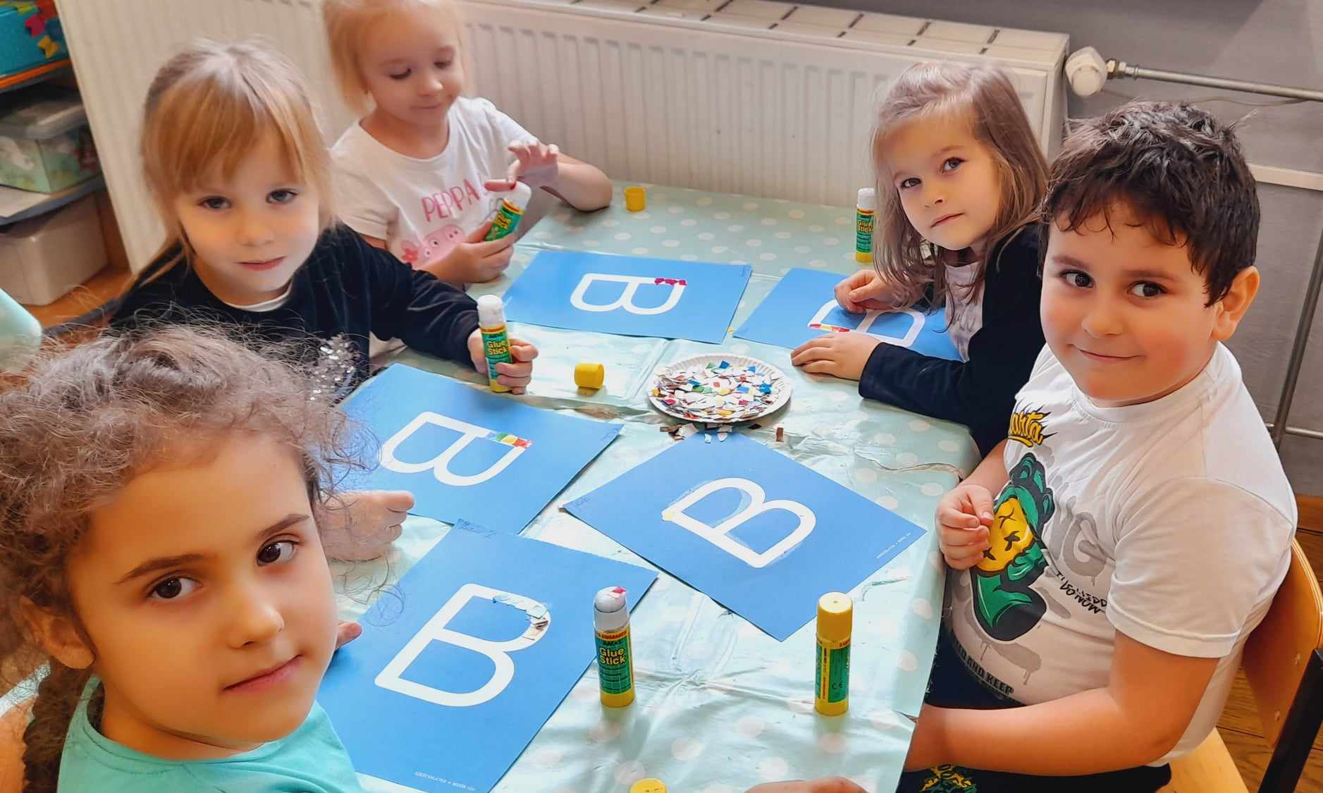 „Biedronki ” poznały litery „Z”, „B”, których kontur wypełniały przy użyciu różnych materiałów. Opanowały treść wiersza T.Fiutowskiej:” Co robią dni tygodnia?”, układając do niego we właściwej kolejności obrazki. Poznały znak matematyczny ,,+”, gdzie odczytywały i układały zapisy działań na dodawanie w zakresie 5. Brały udział w zabawie dydaktycznej: „Przyjęcie dla babci i dziadka „, gdzie miały za zadanie rozdzielić po tyle samo „smakołyków”. Doskonaliły umiejętność mierzenia długości przy pomocy sznurka. W ramach Ogólnopolskiego Projektu Edukacyjnego „Gramy zmysłami” grupa przygotowała zdrowe II śniadanie. Na sali gimnastycznej odbyły się zabawy ruchowe oraz zumba.