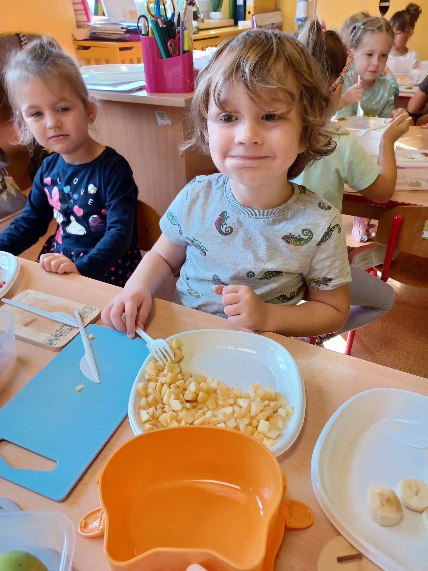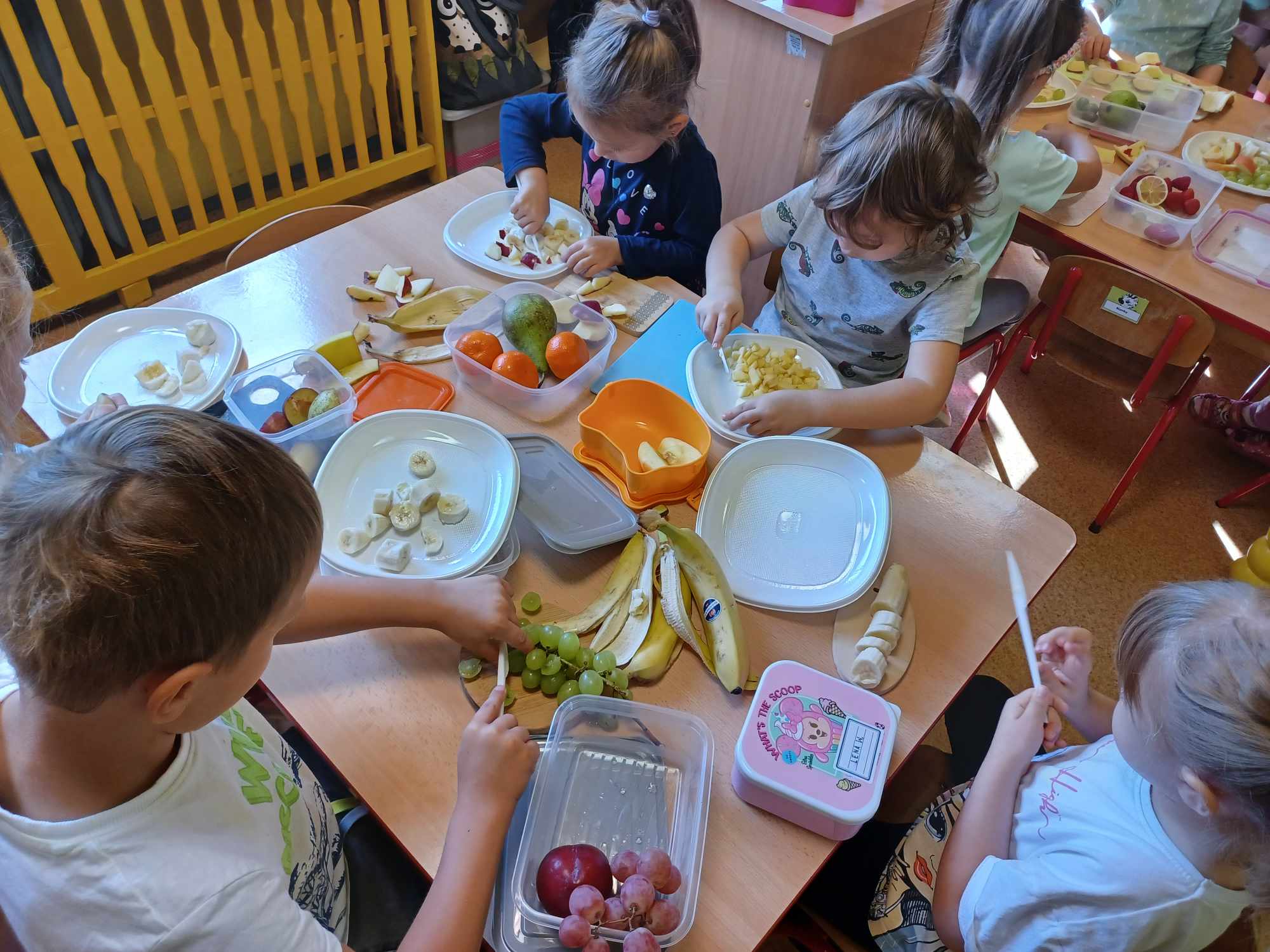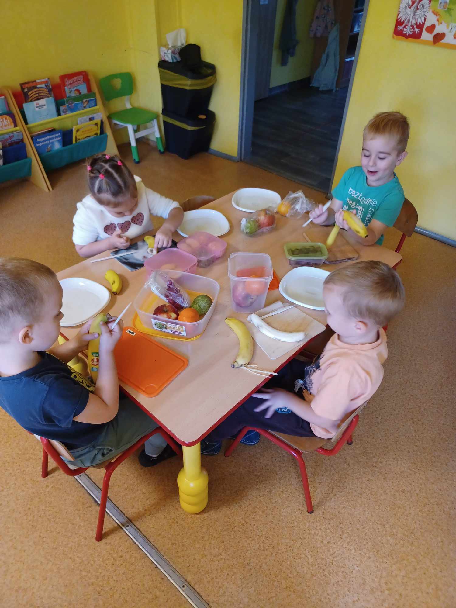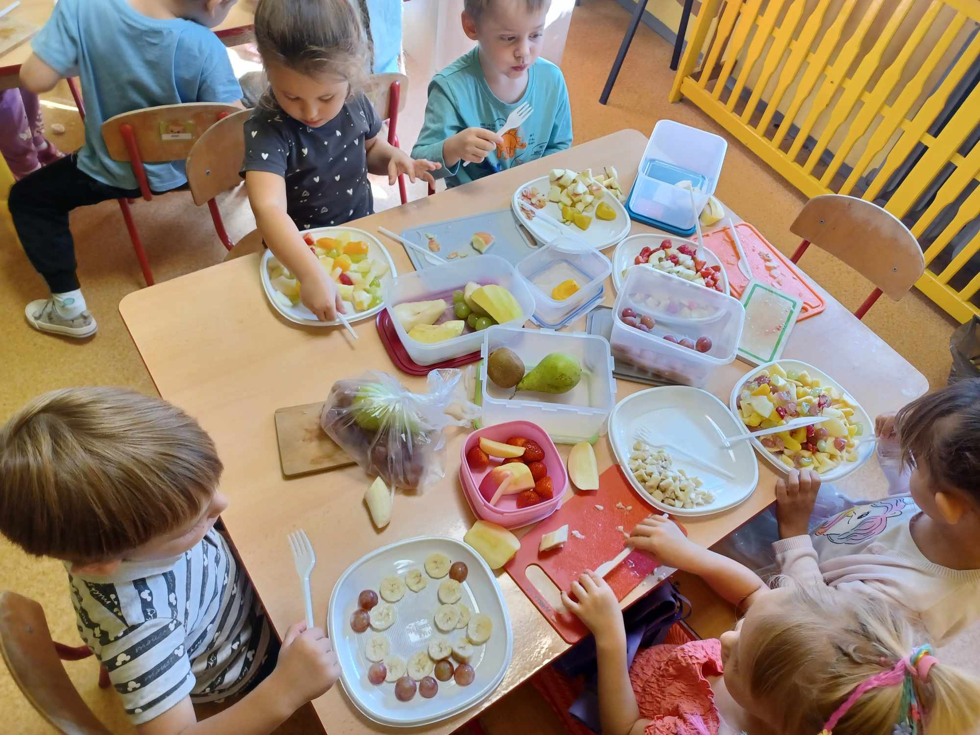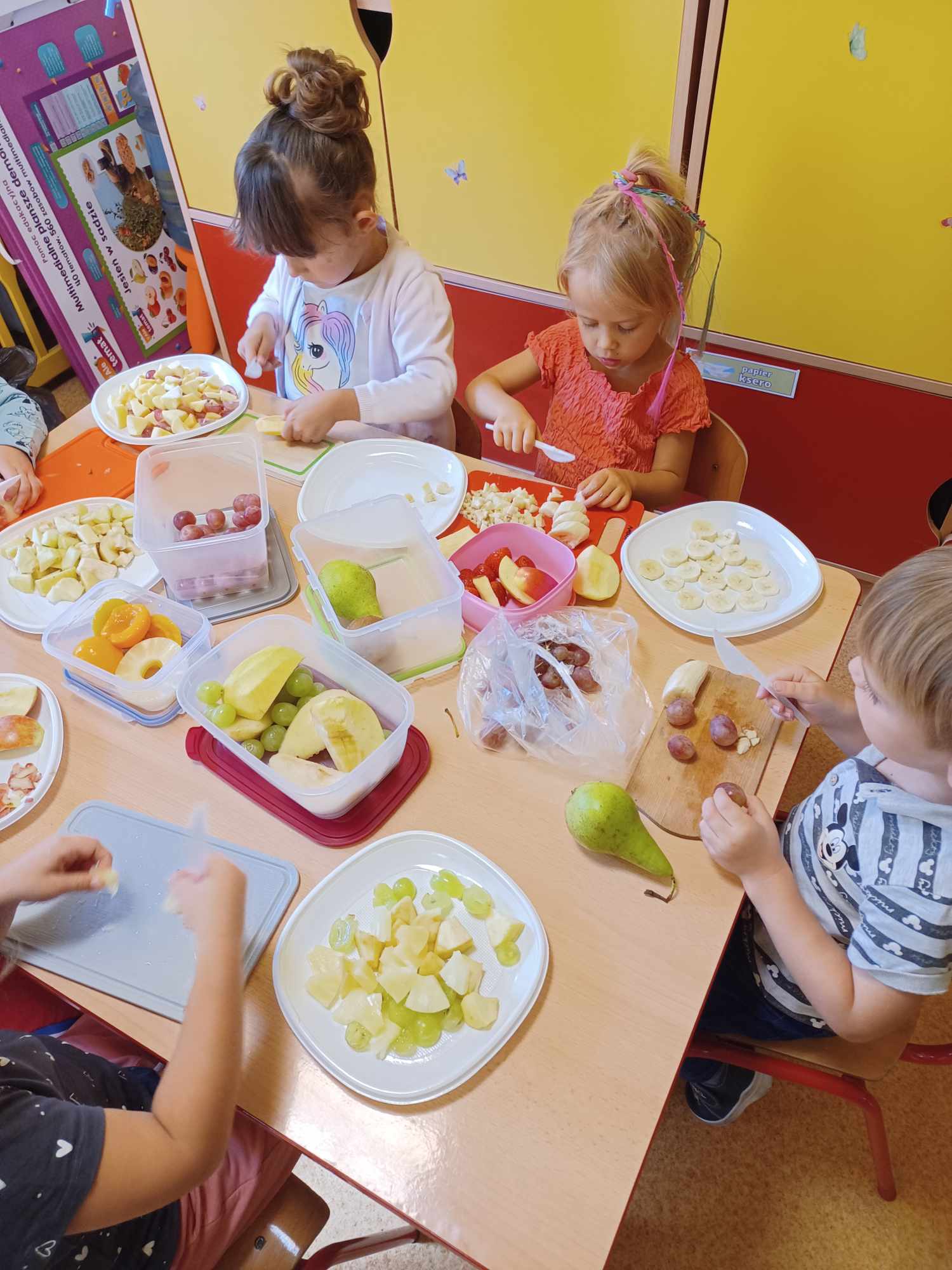 Grupa „Motylki” w tym tygodniu rozmawiała o witaminach. A skoro witaminy to nie mogło zabraknąć sałatki owocowej, która dzieci same przygotowały. Dodatkowo pracowały dzielnie w książkach oraz stworzyły „ziemniaczanego stworka”, gdzie doskonaliły motorykę małą. „Motylki” uczestniczyły również w zajęciach z projektu edukacyjnego „Nie lada to gratka, poznajemy Misia Uszatka”, z którym wybrały się na jesienny spacer. Swoje urodzinki świętowała Wiktoria.
