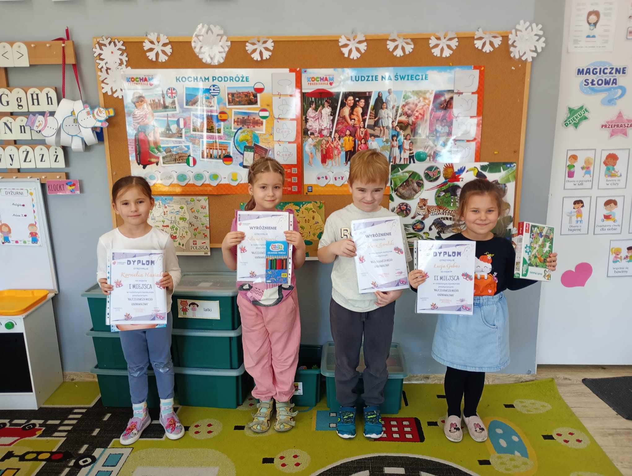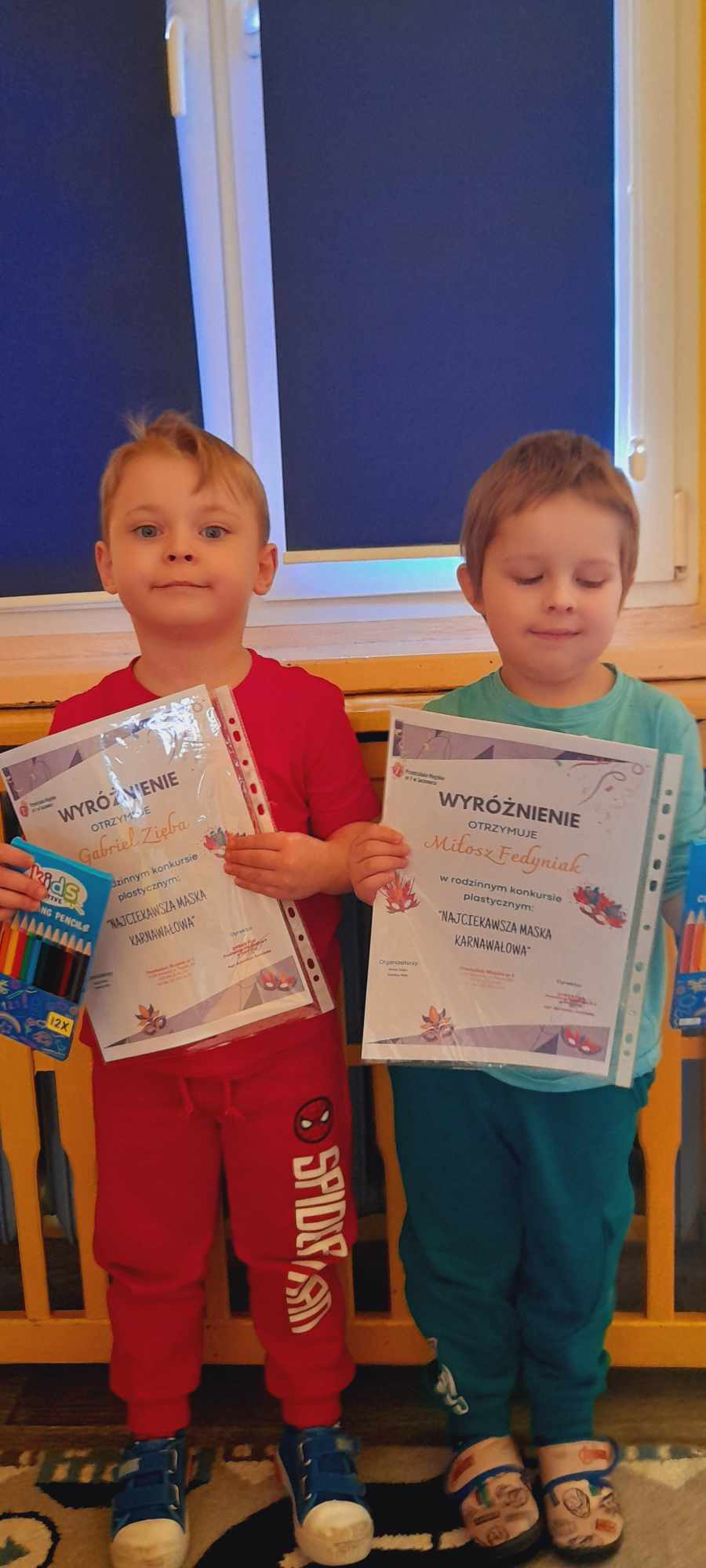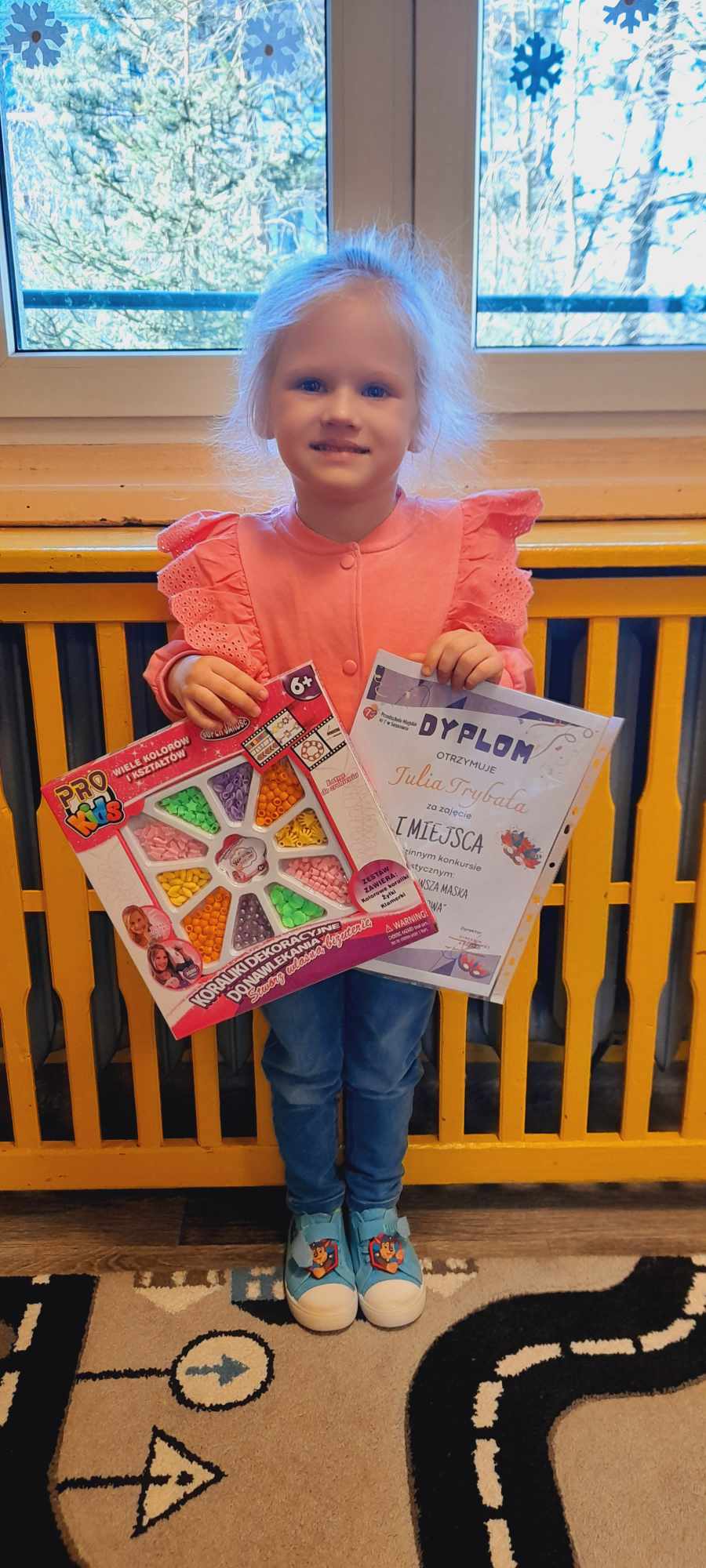 W rodzinnym konkursie „Najciekawsza maska karnawałowa” Kornelia zajęła I miejsce, Emilka i Łucja II miejsce natomiast Zosia III miejsce,