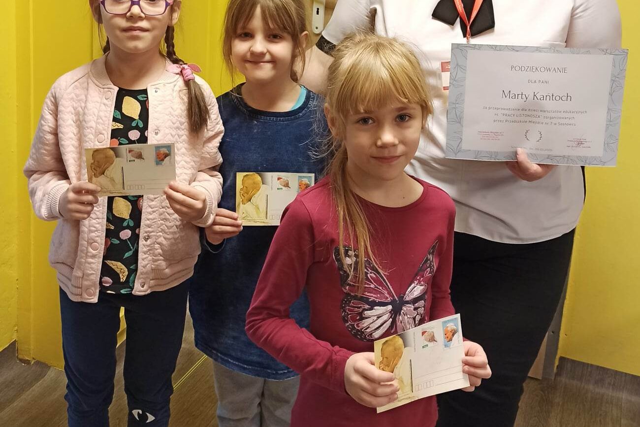 Dodatkowo w czwartek (09.03) odwiedziła nasze przedszkole mama Wiktora, aby przybliżyć nam swój zawód. Przedszkolaki dowiedziały się jak wygląda praca listonosza, jakie sa jego atrybuty. Każdy mógł własnoręcznie przykleić znaczek na pocztówkę. Bardzo dziękujemy Pani Marcie za odwiedziny i ciekawe zajęcia 😉