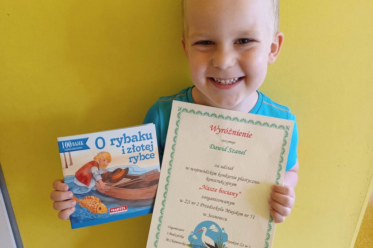 Dawidek w wojewódzkim konkursie plastyczno-konstrukcyjnym pt.”Nasze bociany” zorganizowanym przez PM 51 w Sosnowcu zdobył wyróżnienie.