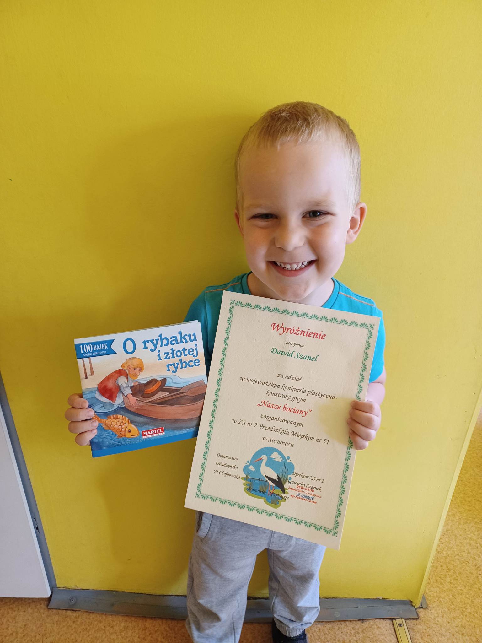 Dawidek w wojewódzkim konkursie plastyczno-konstrukcyjnym pt.”Nasze bociany” zorganizowanym przez PM 51 w Sosnowcu zdobył wyróżnienie.