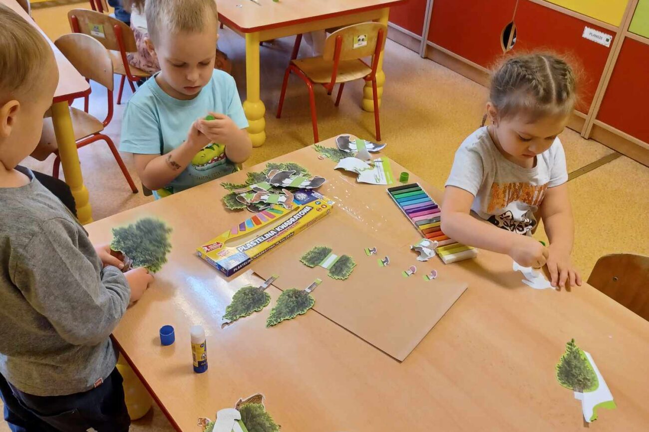 „Motylki” w tym tygodniu rozmawiały o lesie. Poznały zwierzęta, które w nim żyją. Dowiedziały się,że istnieją grzyby jadalne oraz takie, których jeść nie możemy. Wykonały dwie prace plastyczne: „Makietę lasu” oraz „Muchomorki”. Zapoznały się z darami lasu poprzez zmysł wzroku oraz dotyku, chodzac po przygotowanej ścieżce sensorycznej.