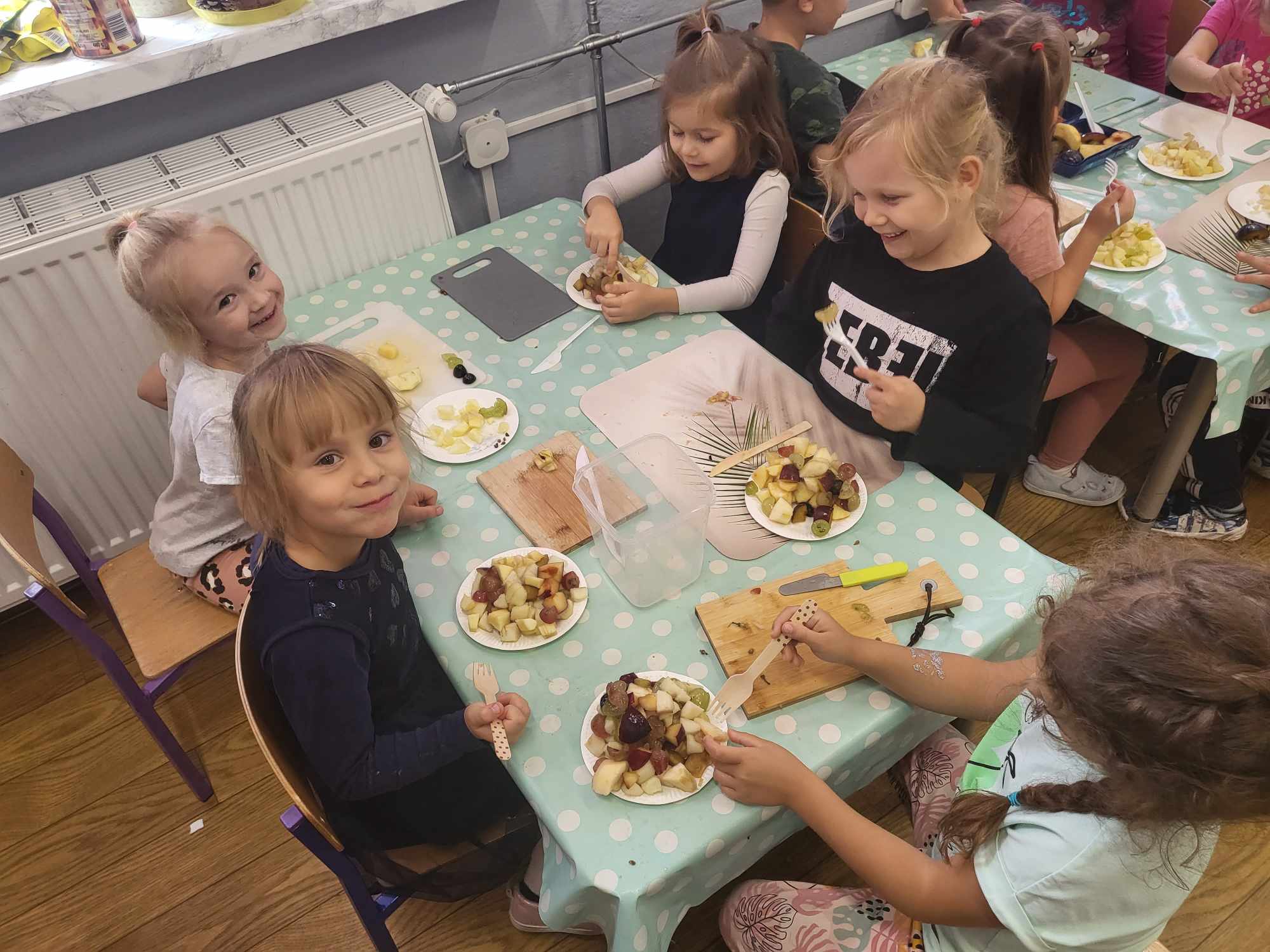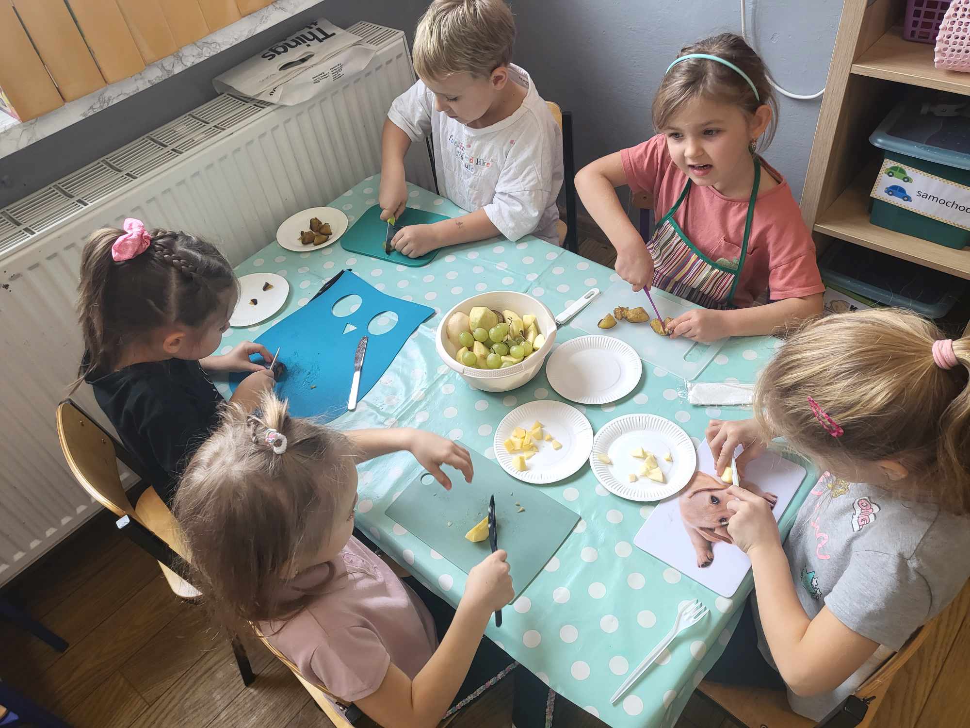 „Biedronki „ w tym tygodniu poznała litery:”I- i”, gdzie wykonywała po śladzie techniką wydzieranki nowopoznaną literę, cyfrę 2 oraz wykonywała ćwiczenia gimnastyczne. Dzieci utworzyły pracę plastyczną „Koszyk warzyw”. Przedszkolaki samodzielnie przygotowały przepyszną sałatkę owocową.