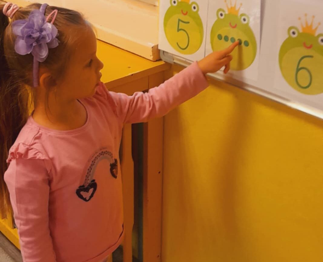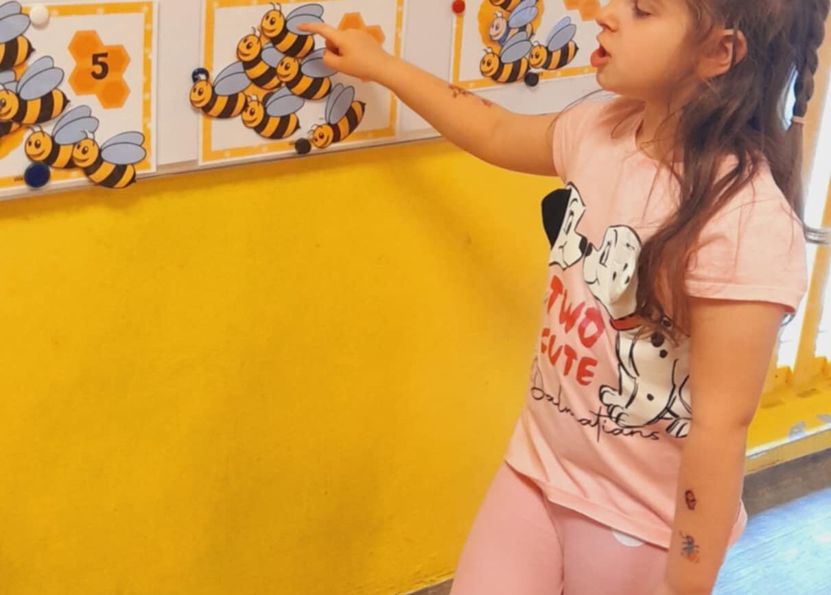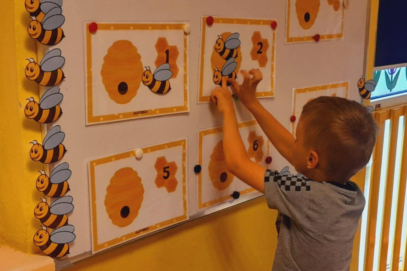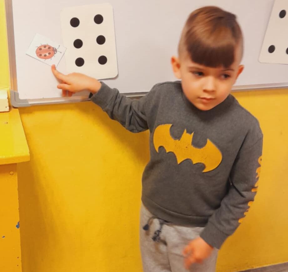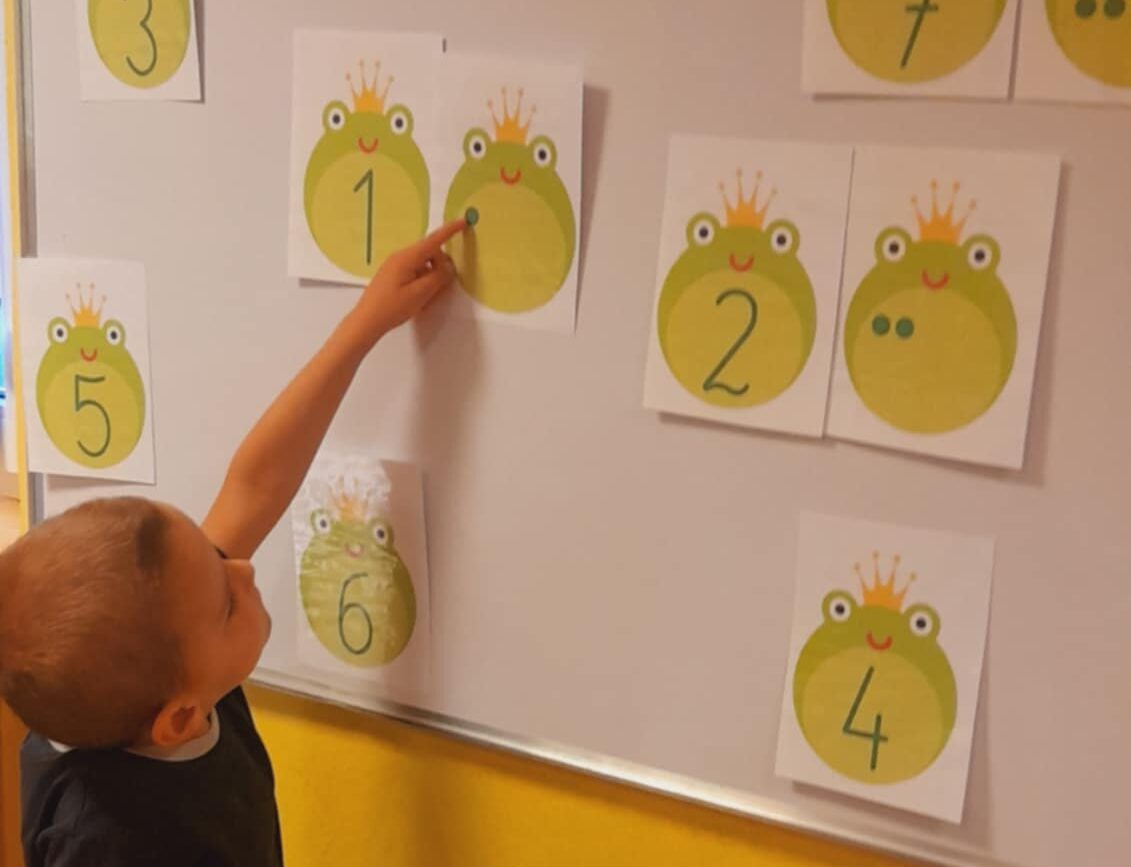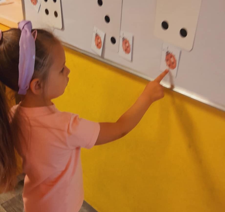 Uczestniczyły w zabawach matematycznych, przeliczając pszczoły, biedronki i żaby – utrwalając poznane cyfry.Tworzyły pary z kolekcji obrazkowych.