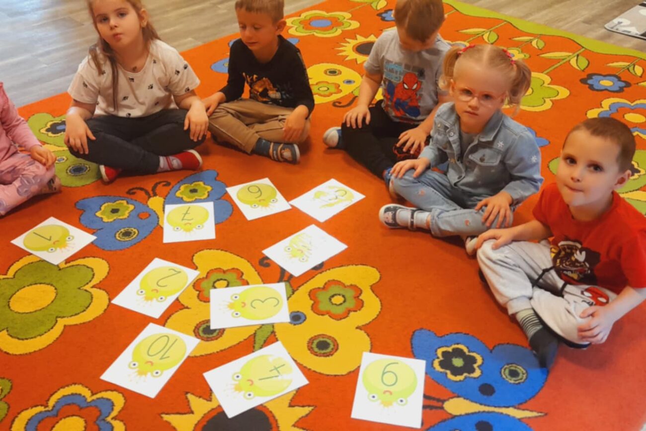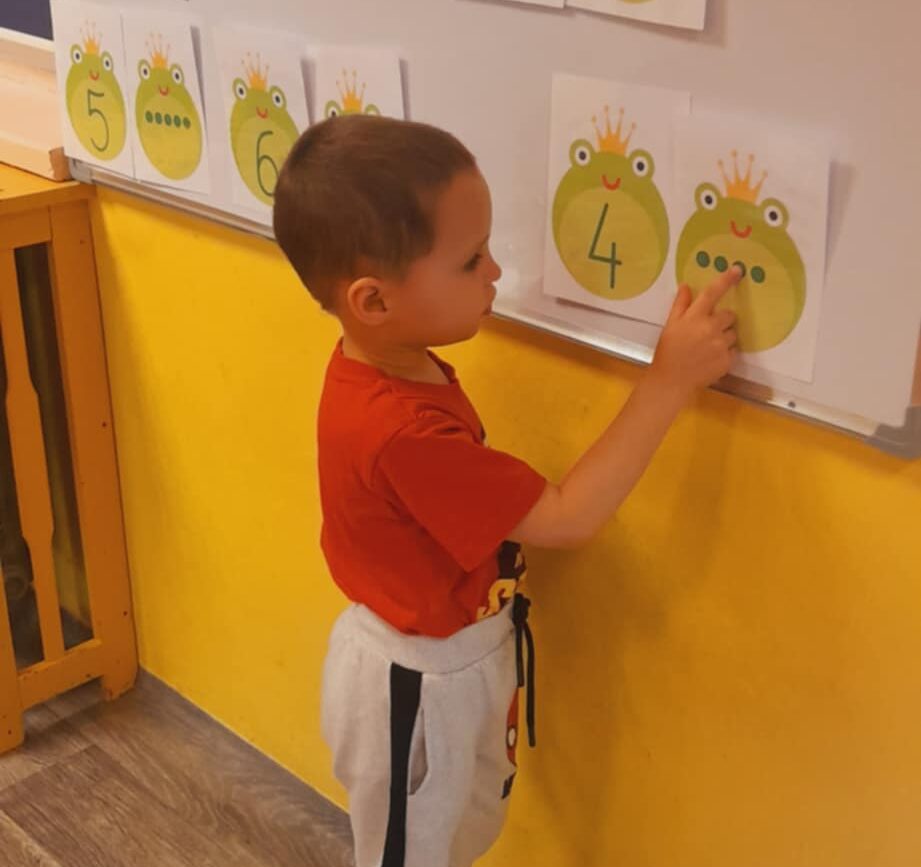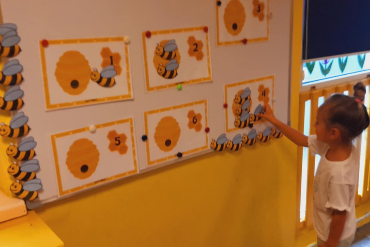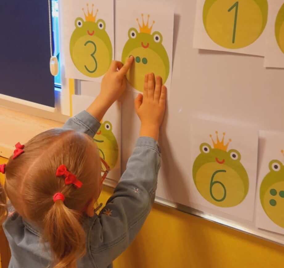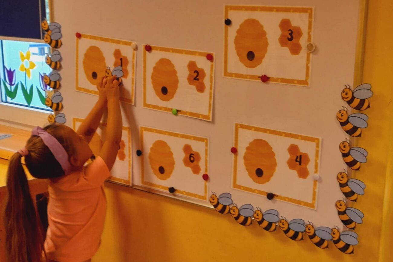 Uczestniczyły w zabawach matematycznych, przeliczając pszczoły, biedronki i żaby – utrwalając poznane cyfry.Tworzyły pary z kolekcji obrazkowych.