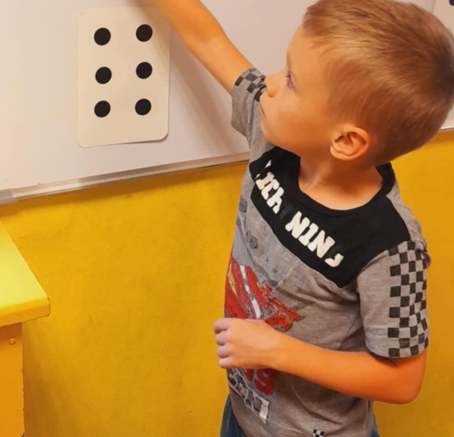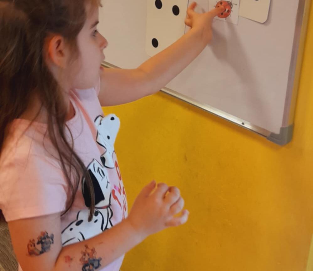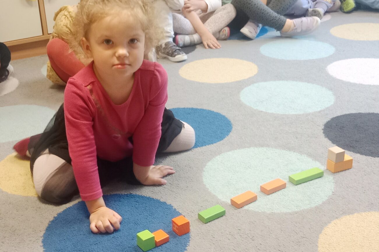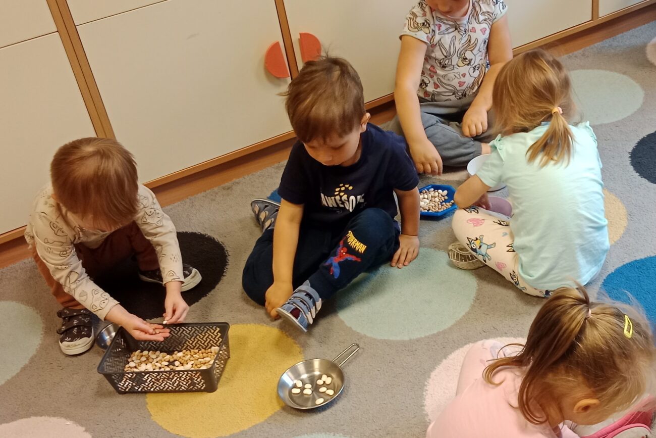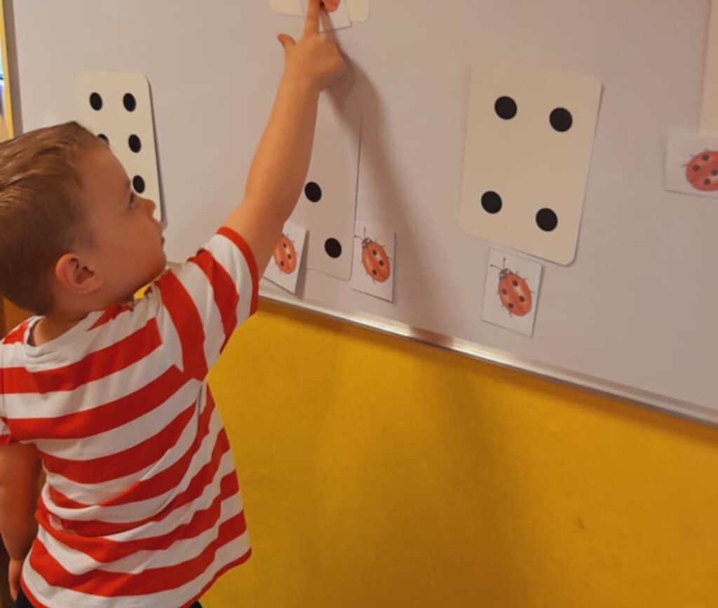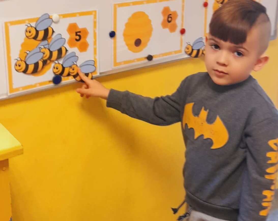 Uczestniczyły w zabawach matematycznych, przeliczając pszczoły, biedronki i żaby – utrwalając poznane cyfry.Tworzyły pary z kolekcji obrazkowych.