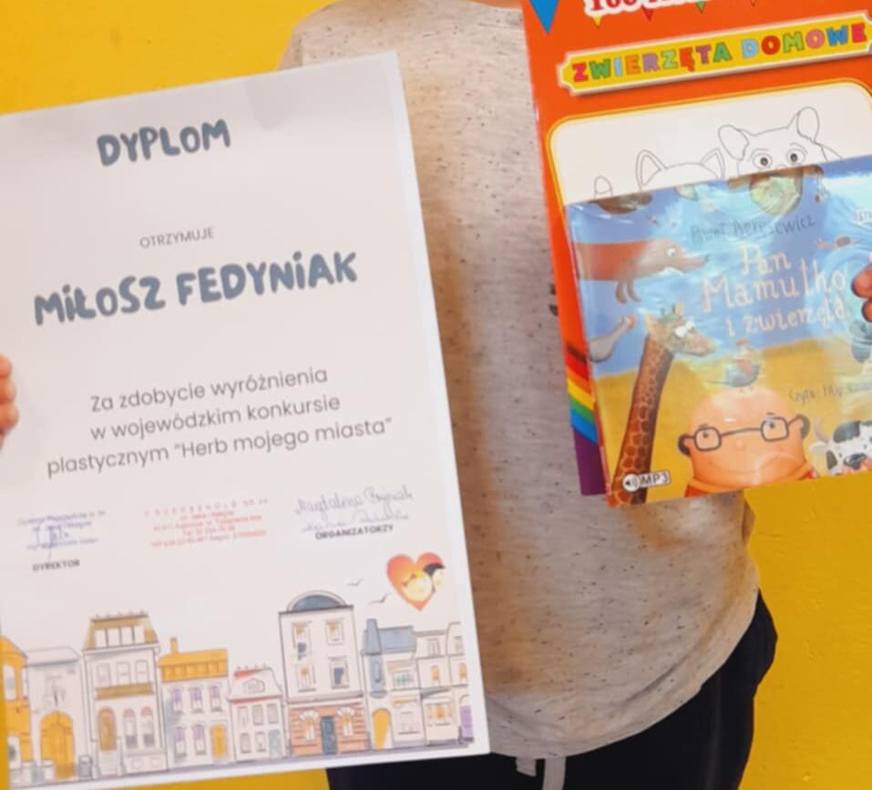 Wyróżnienie w wojewódzkim konkursie plastycznym: „Herb mojego miasta”- zorganizowanym przez Przedszkole Miejskie nr 34 im. Jasia i Małgosi w Katowicach otrzymał Miłosz F.