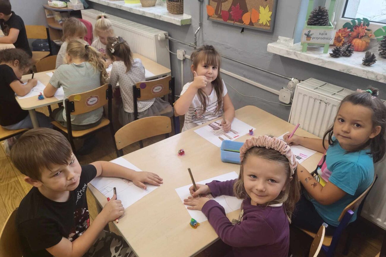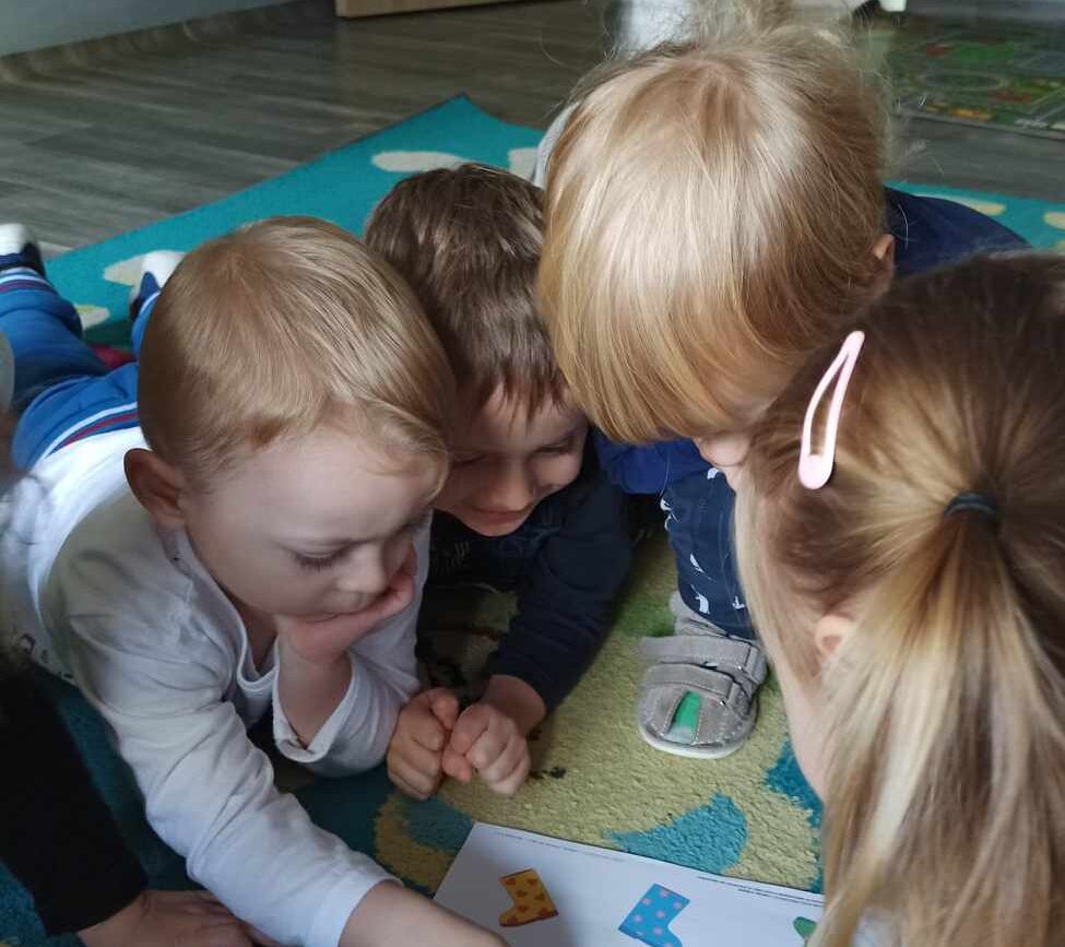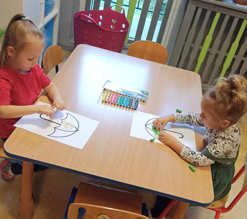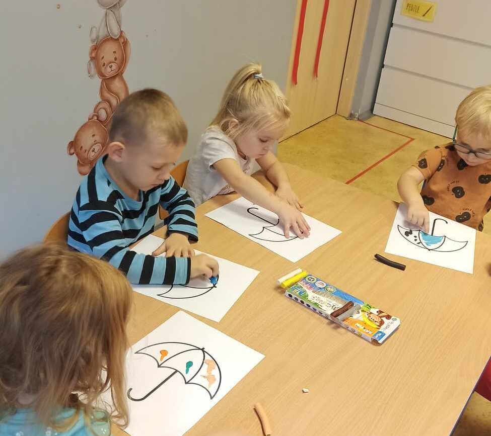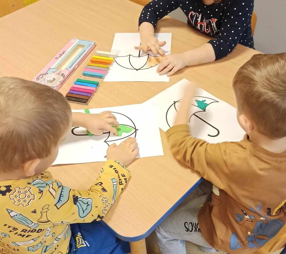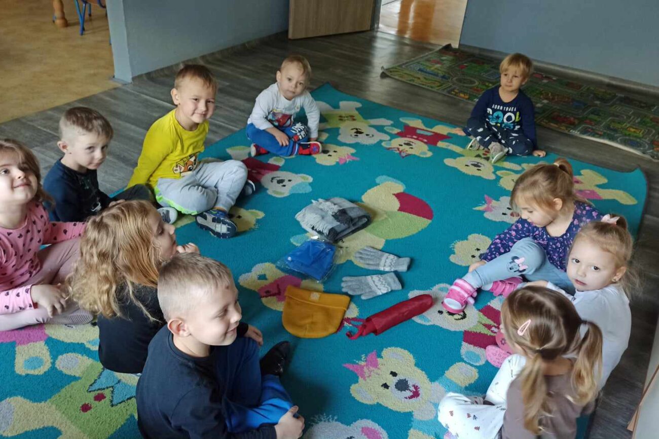 Dzieci z grupy „Misie” rozwiązywały zagadki dotyczące ubrań, które zakładamy jesienią i zimą, kształtowały swoją spostrzegawczość poprzez odnajdywanie par takich samych kaloszy. Z uwagą słuchały wiersza i patrzyły na świat przez „kolorowe” okulary. Poznały zawód malarza oraz jego narzędzia pracy. Układały rytmy, przeliczały elementy, a także wykonały pracę plastyczną.