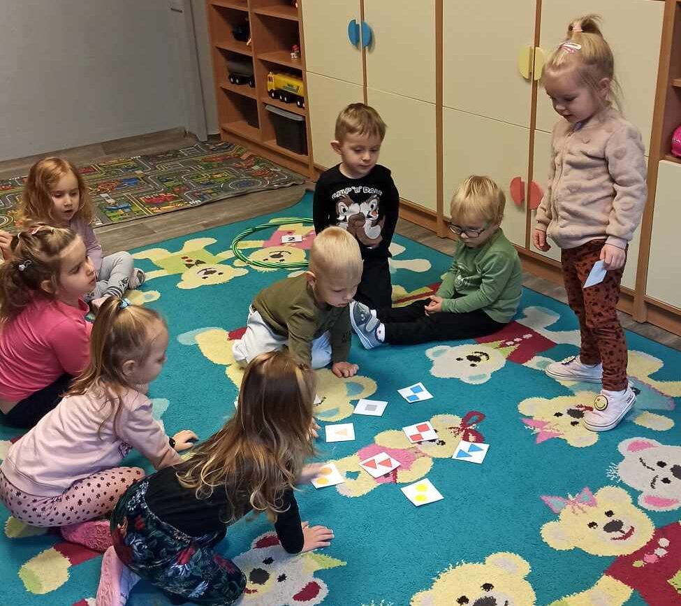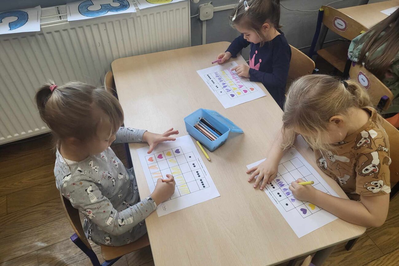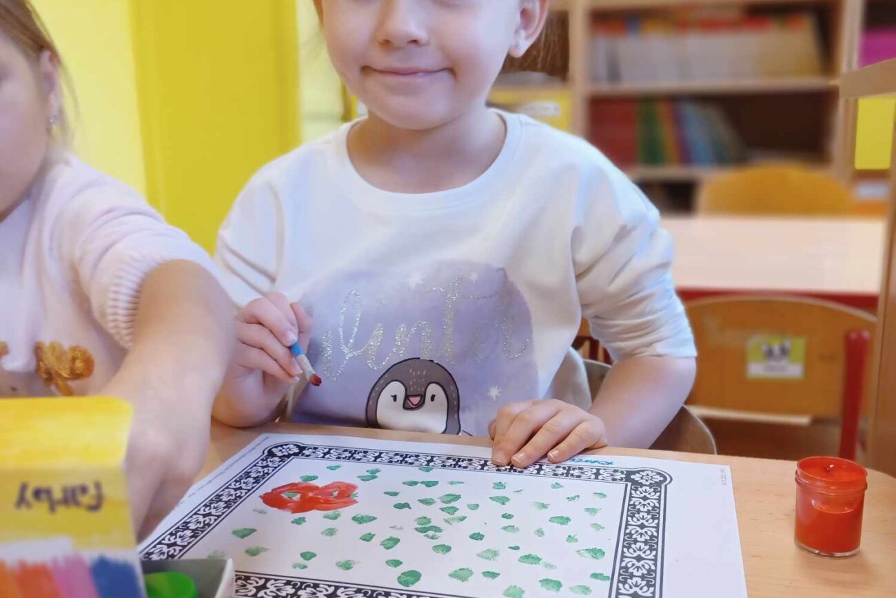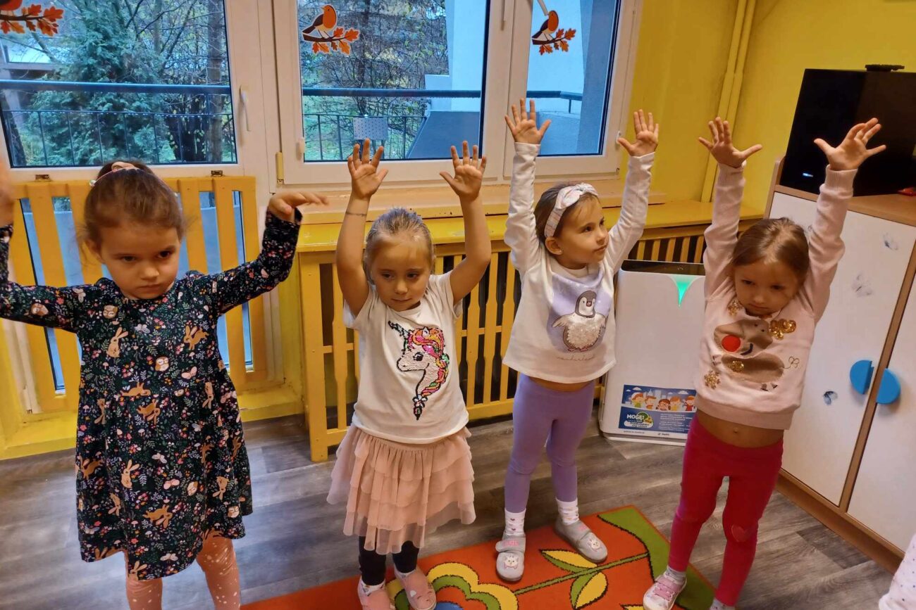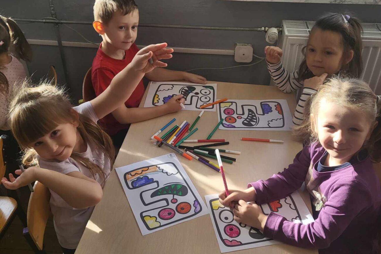 Dzieci z grupy „Misie” rozwiązywały zagadki dotyczące ubrań, które zakładamy jesienią i zimą, kształtowały swoją spostrzegawczość poprzez odnajdywanie par takich samych kaloszy. Z uwagą słuchały wiersza i patrzyły na świat przez „kolorowe” okulary. Poznały zawód malarza oraz jego narzędzia pracy. Układały rytmy, przeliczały elementy, a także wykonały pracę plastyczną.