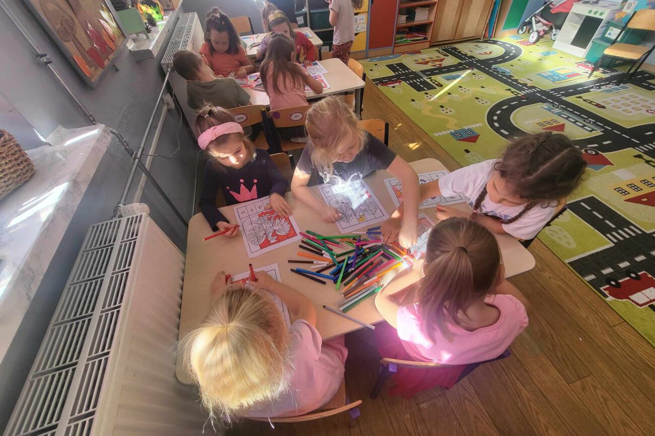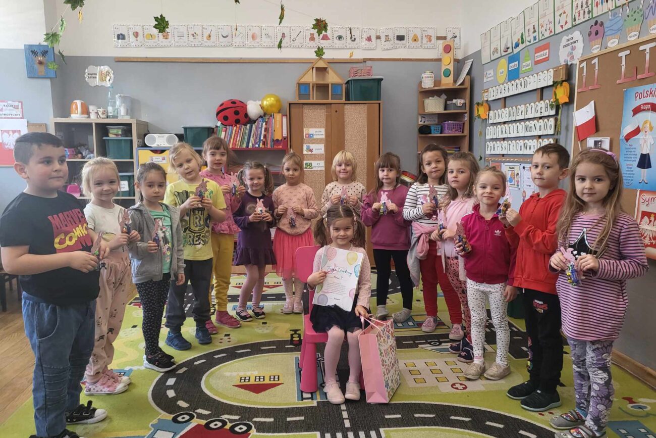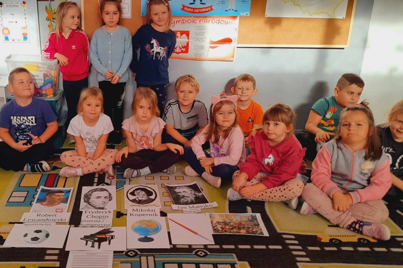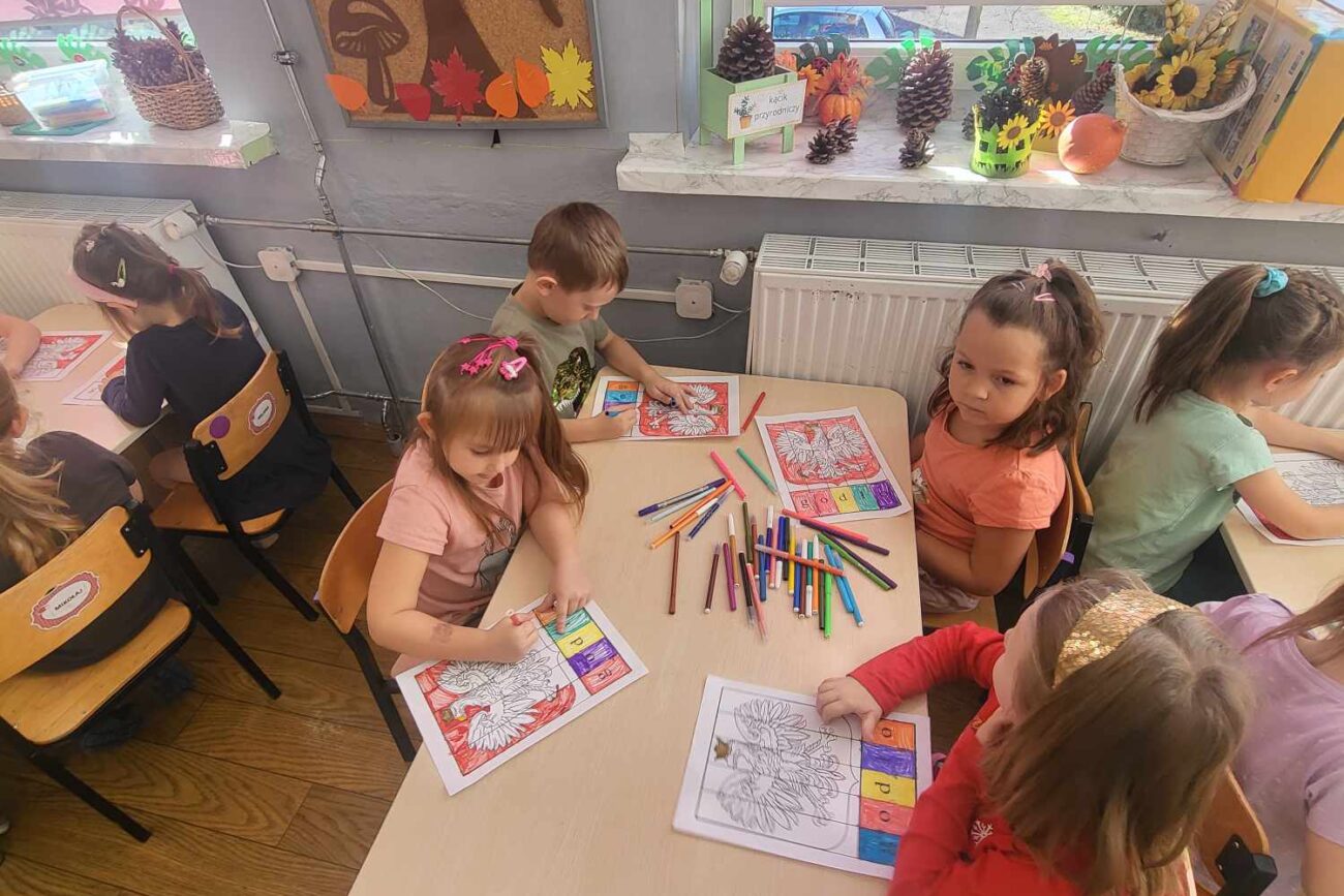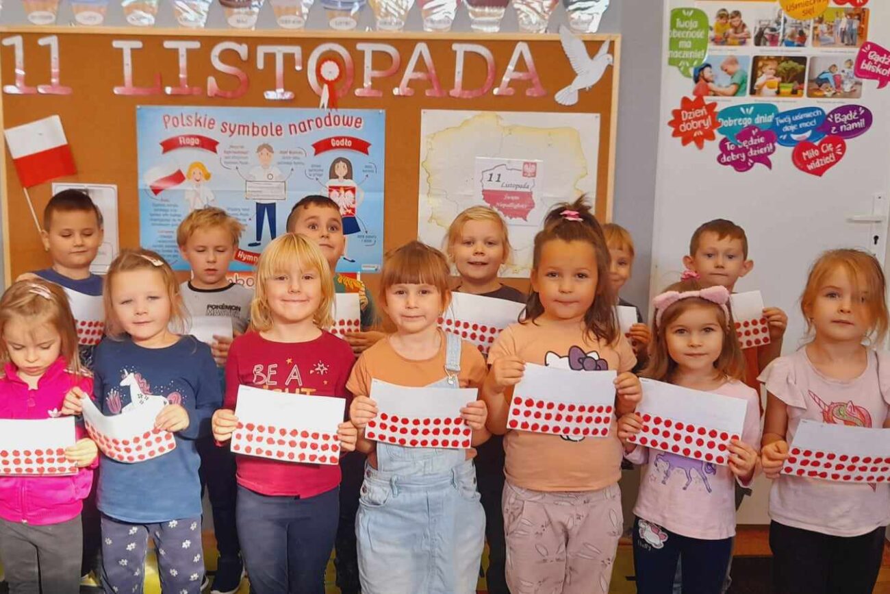 Grupa „Biedronki” poznała sylwety sławnych Polaków i ciekawostki na ich temat, wykonywała flagę Polski techniką wypełniania kontur plasteliną. Doskonaliła umiejętność bezpiecznego i prawidłowego posługiwania się nożyczkami, poprzez wycinanie wzorów po śladzie. Grupa poznała również litery:”E-e”, których kontur wypełniała kawałkami z gazet, cyfrę 3, sylwety sławnych Polaków i ciekawostki na ich temat, wykonywała flagę Polski techniką wypełniania kontur plasteliną. Doskonaliła umiejętność bezpiecznego i prawidłowego posługiwania się nożyczkami, poprzez wycinanie wzorów po śladzie. Wykonywała pracę plastyczną techniką ” mokre w mokrym”. Nie zabrakło zabaw z użyciem liter oraz ćwiczeń w kodowaniu. W ramach innowacji: „Dotknij, poczuj, zobacz” Biedronki wykonywały zadania za pomocą ciastoliny.