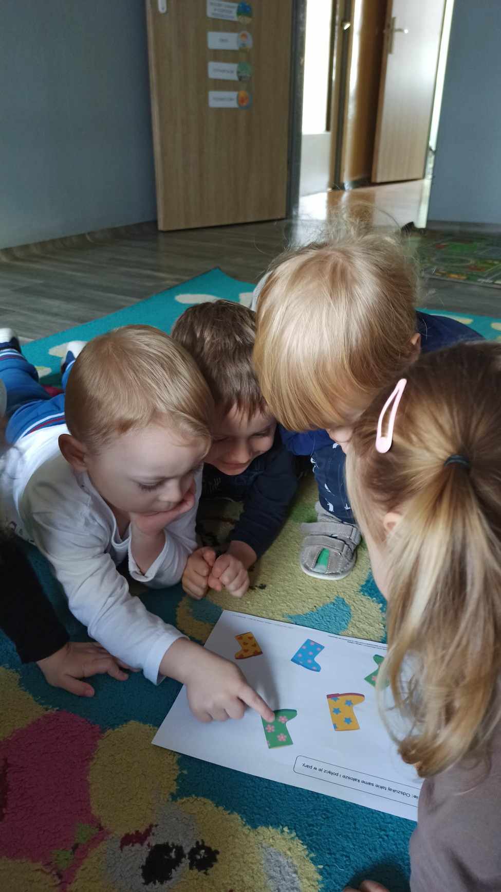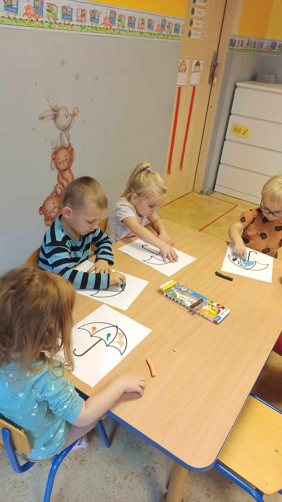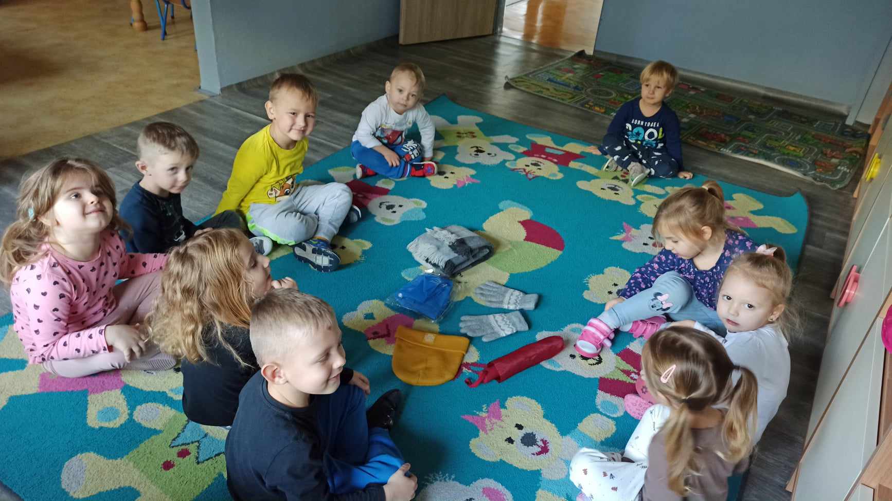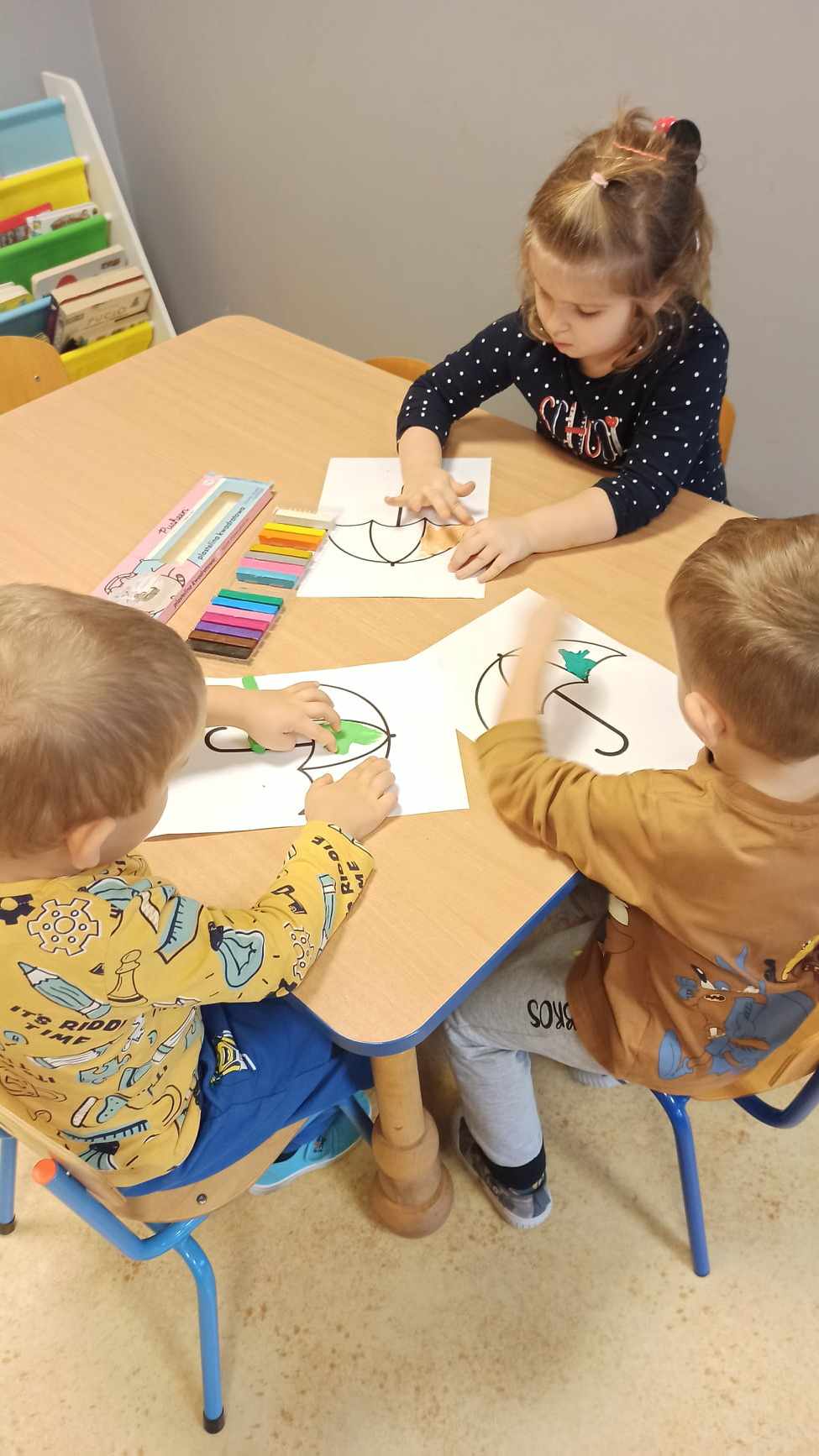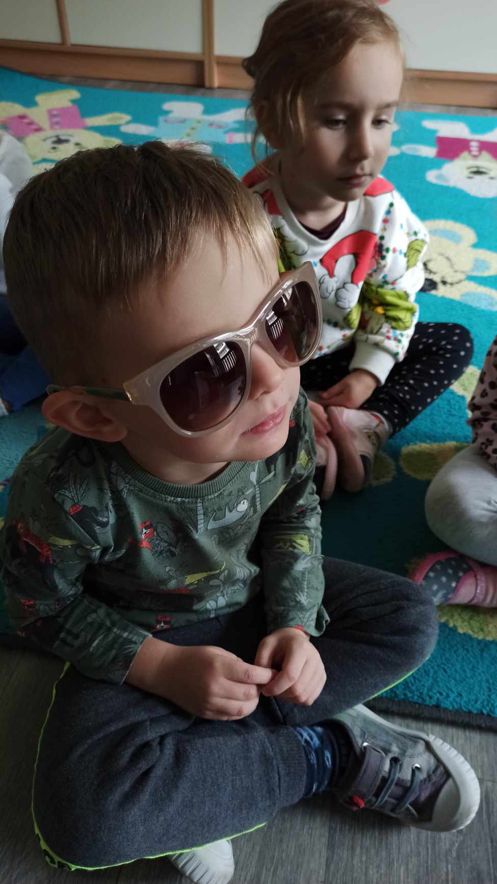 Dzieci z grupy „Misie” rozwiązywały zagadki dotyczące ubrań, które zakładamy jesienią i zimą, kształtowały swoją spostrzegawczość poprzez odnajdywanie par takich samych kaloszy. Z uwagą słuchały wiersza i patrzyły na świat przez „kolorowe” okulary. Poznały zawód malarza oraz jego narzędzia pracy. Układały rytmy, przeliczały elementy, a także wykonały pracę plastyczną.