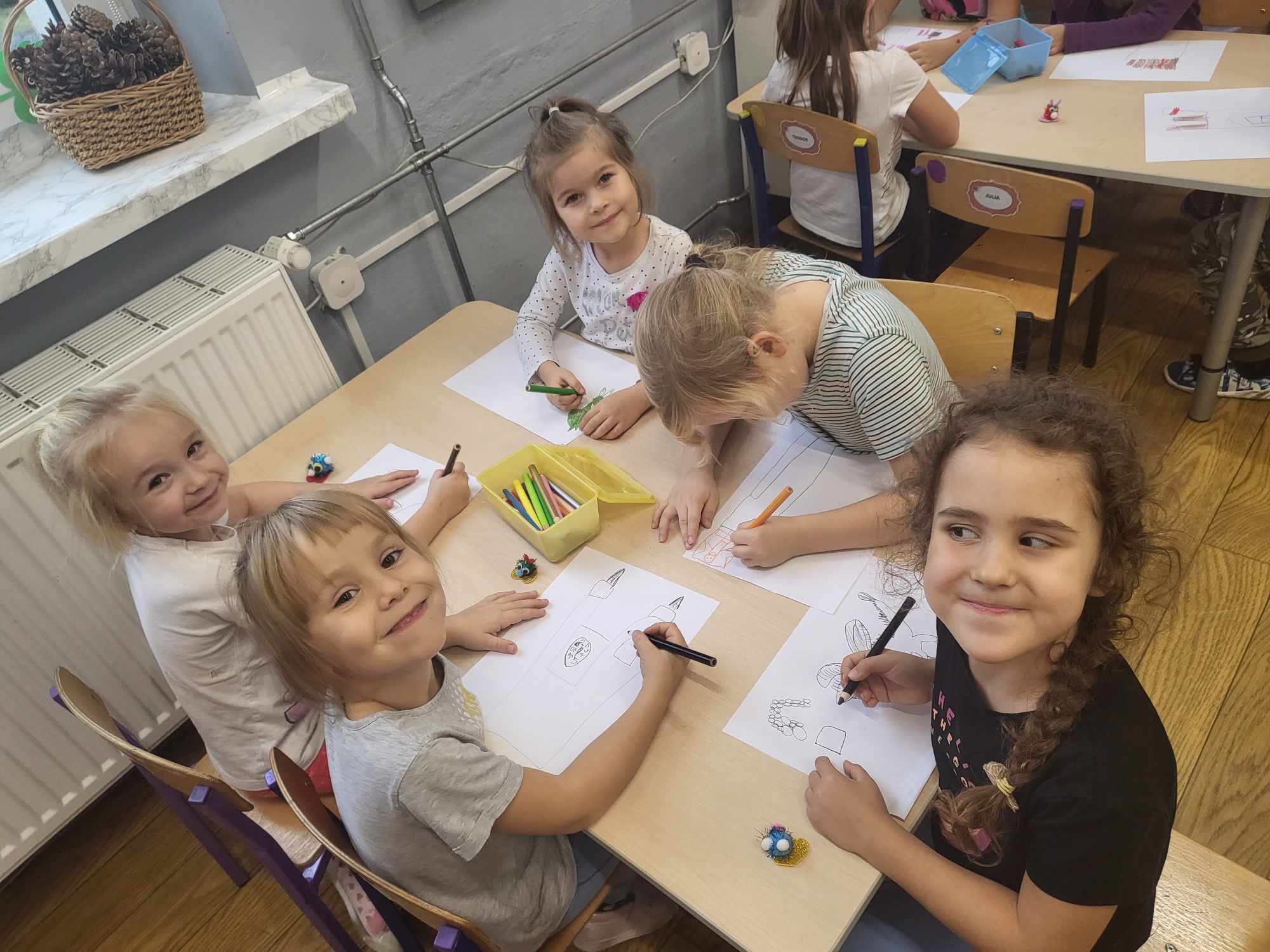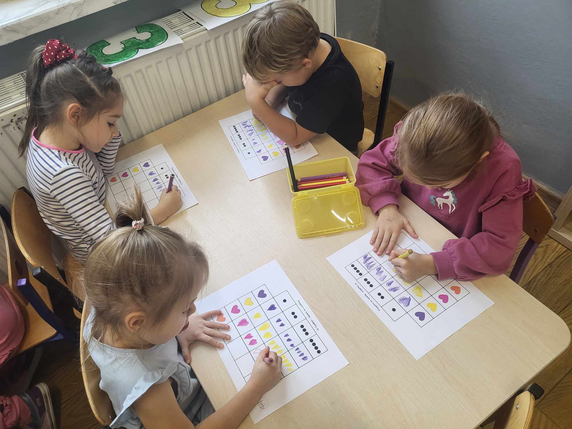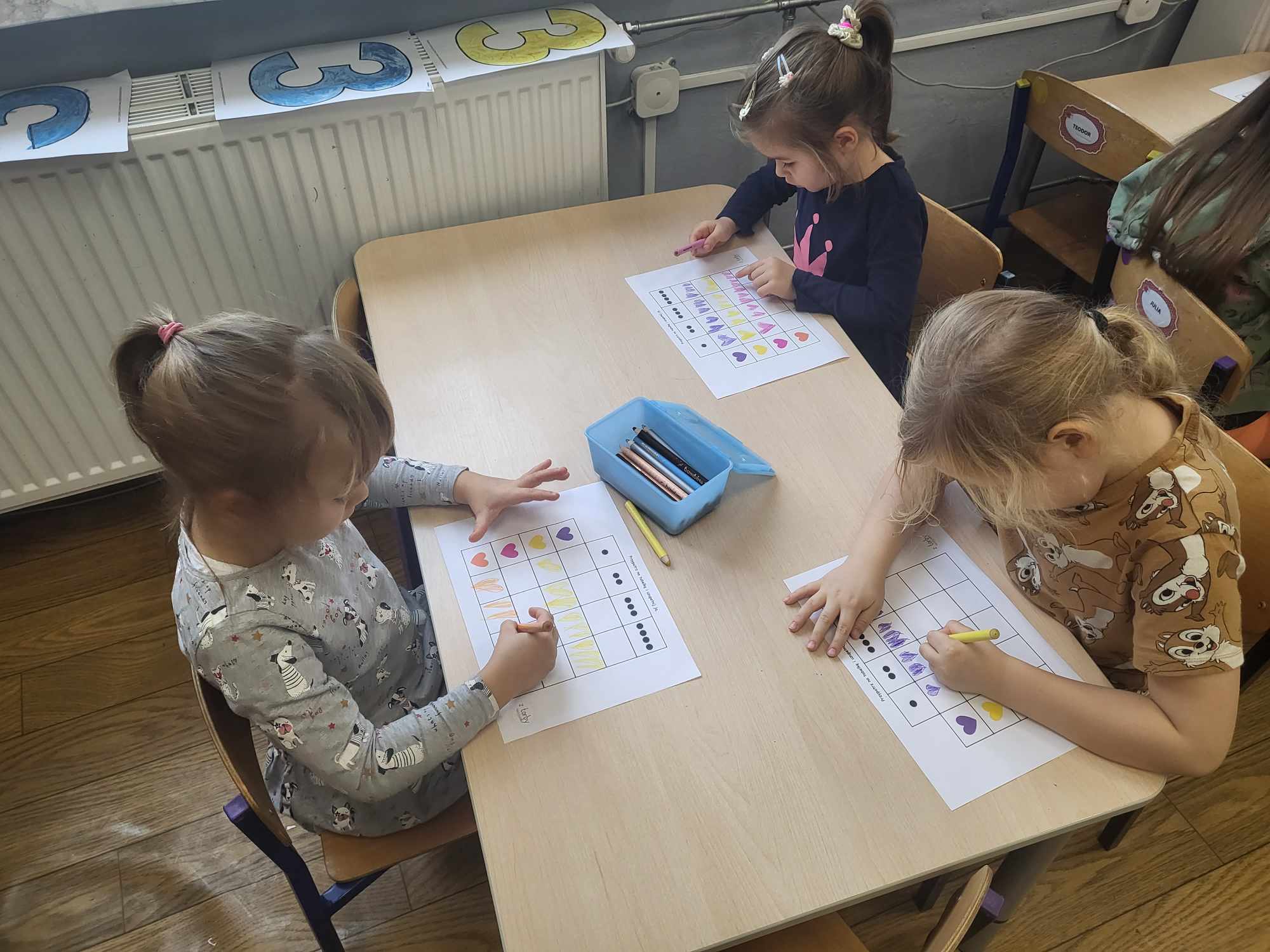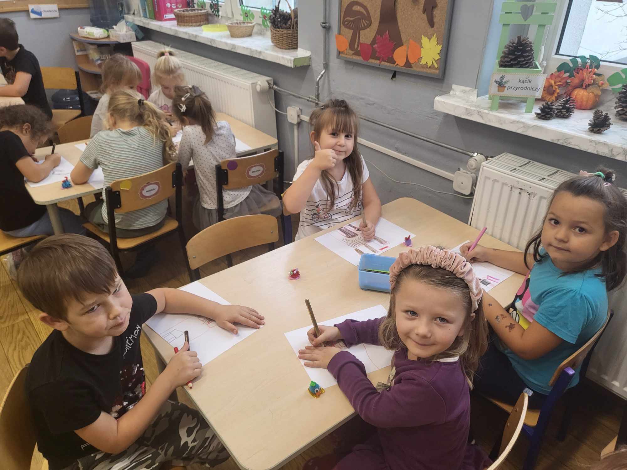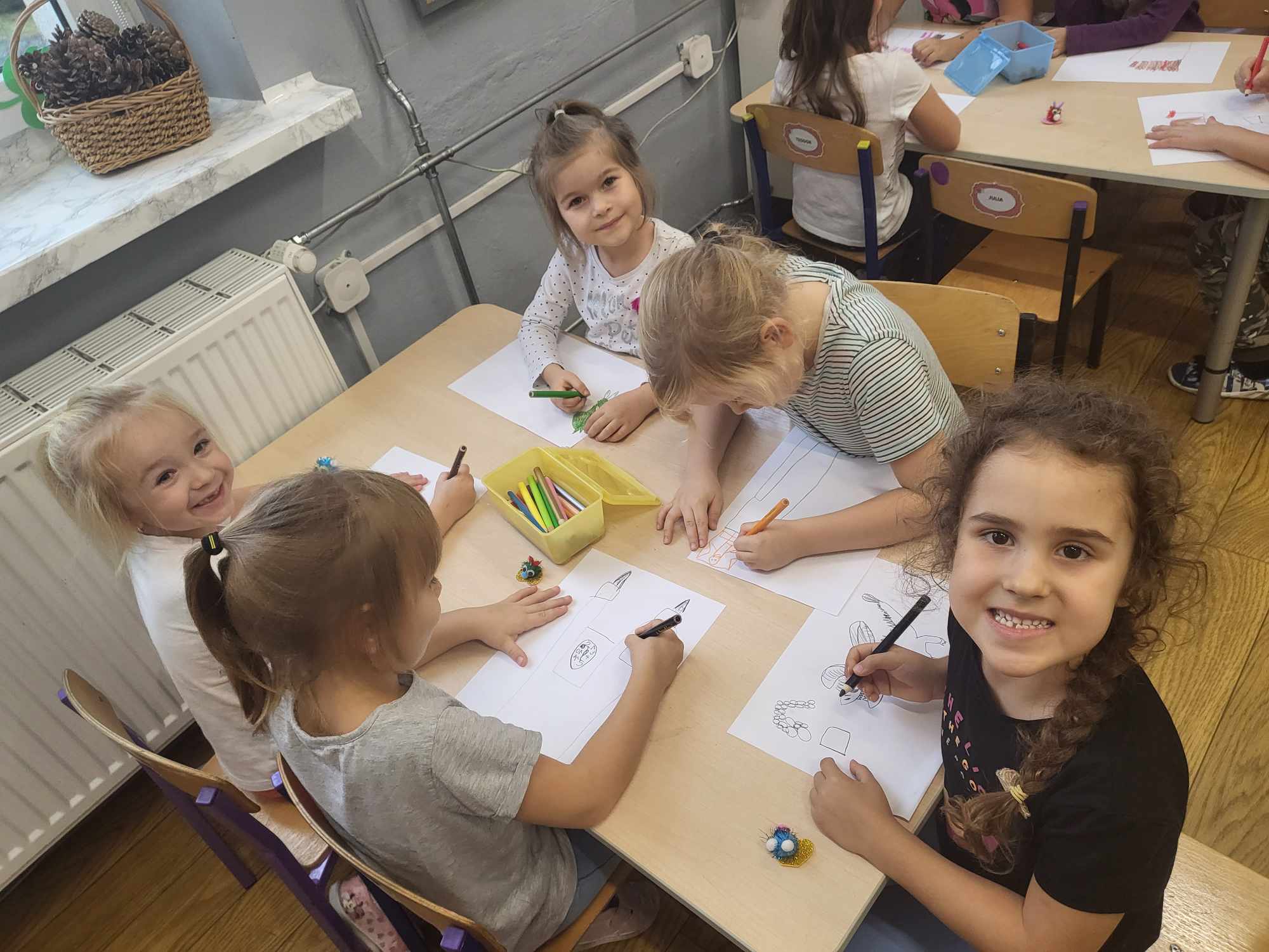 Dzieci z grupy „Misie” rozwiązywały zagadki dotyczące ubrań, które zakładamy jesienią i zimą, kształtowały swoją spostrzegawczość poprzez odnajdywanie par takich samych kaloszy. Z uwagą słuchały wiersza i patrzyły na świat przez „kolorowe” okulary. Poznały zawód malarza oraz jego narzędzia pracy. Układały rytmy, przeliczały elementy, a także wykonały pracę plastyczną.