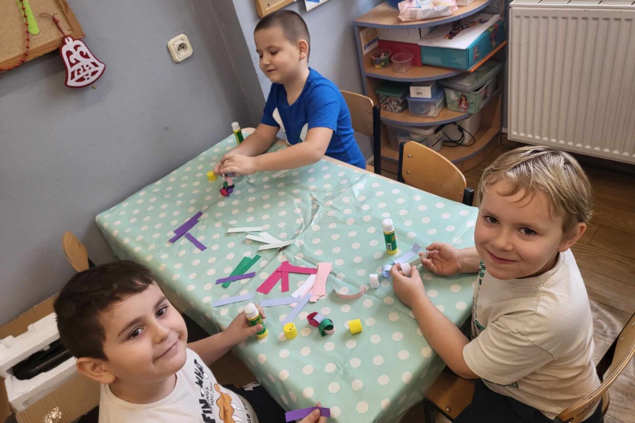 na choinkę, wycinajac paski papieru a następnie je sklejając. Wylepiały również choinkę za pomocą bibuły i dorysowywały jej kolorowe bombki. Urodziny świętowała Kornelka. Korzystając z pięknej pogody wybrały się również na spacer, wypatrując zimy.
