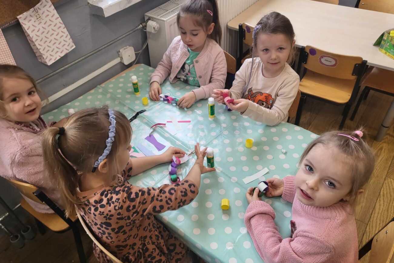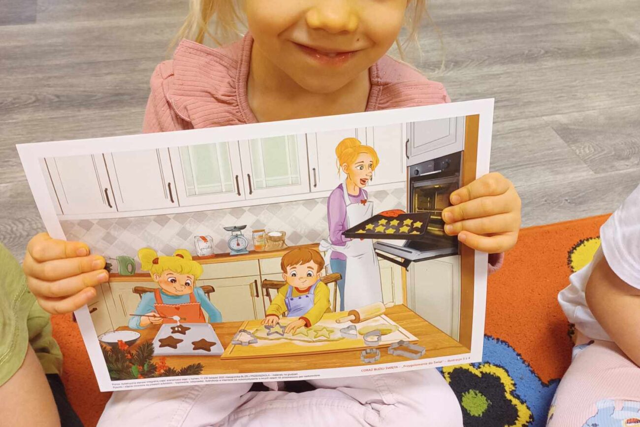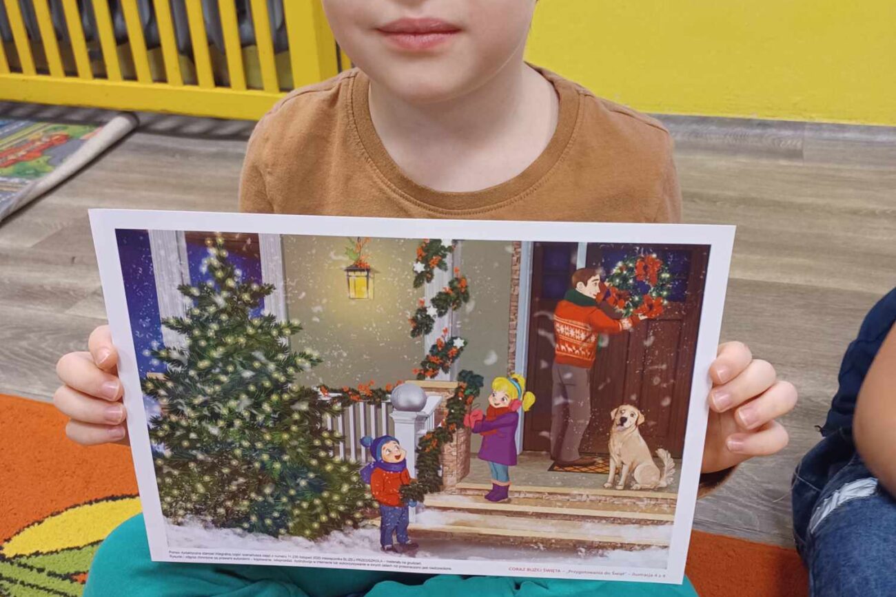 ze świętami. Wysłuchały i opowiadały historyjkę obrazkową pt.”Świąteczne przygotowania”. Stworzyły również piękny łańcuch