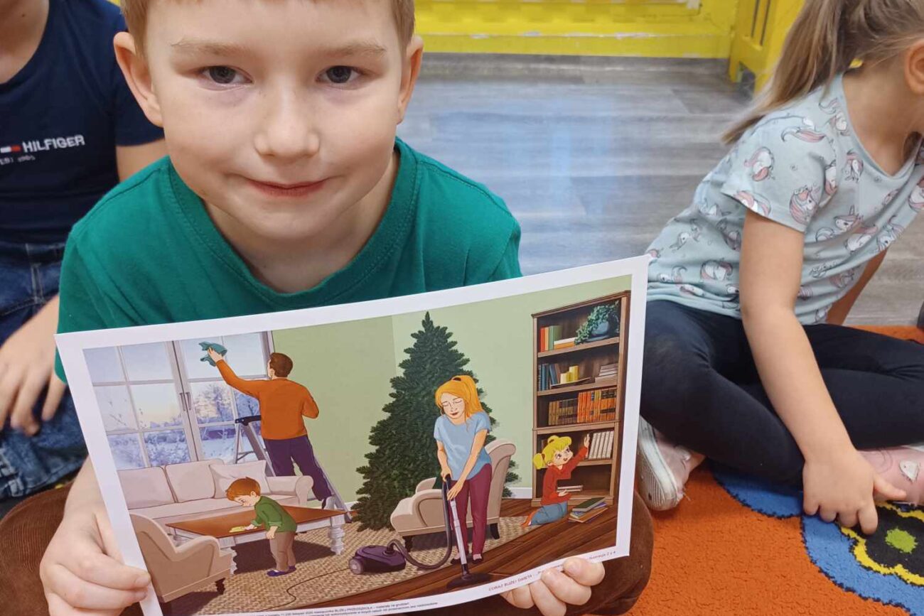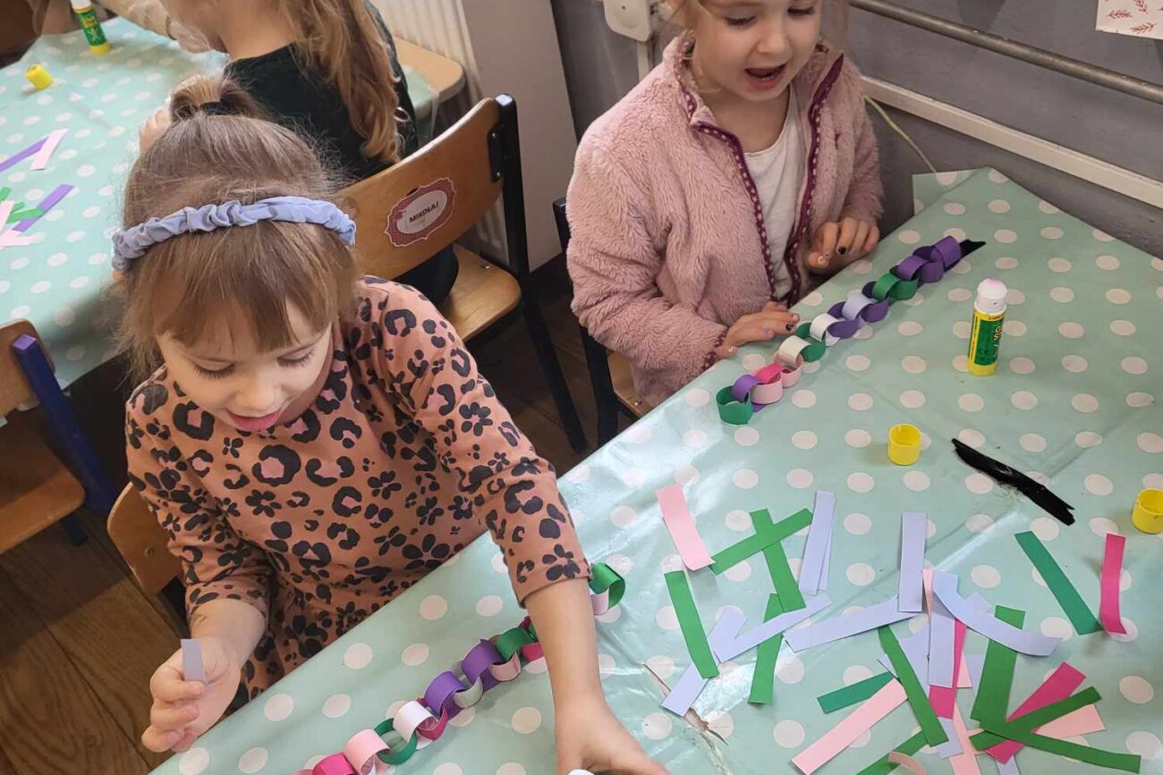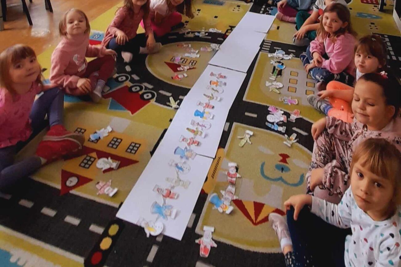 ze świętami. Wysłuchały i opowiadały historyjkę obrazkową pt.”Świąteczne przygotowania”. Stworzyły również piękny łańcuch