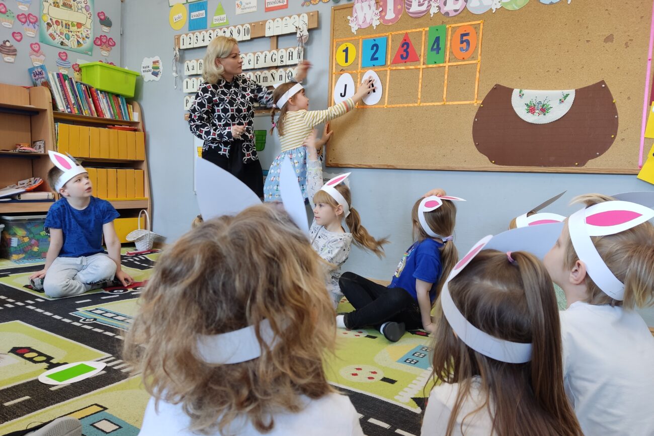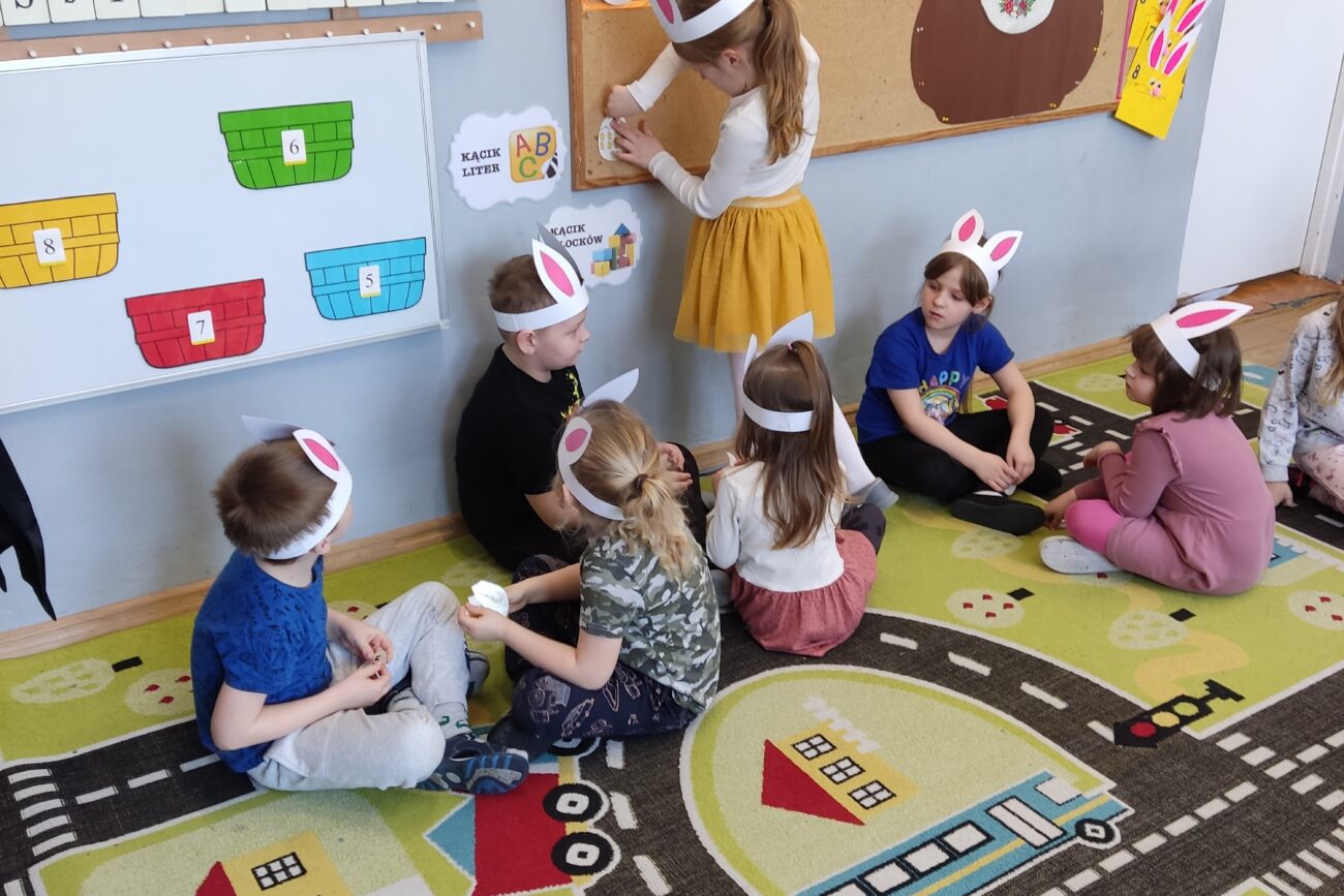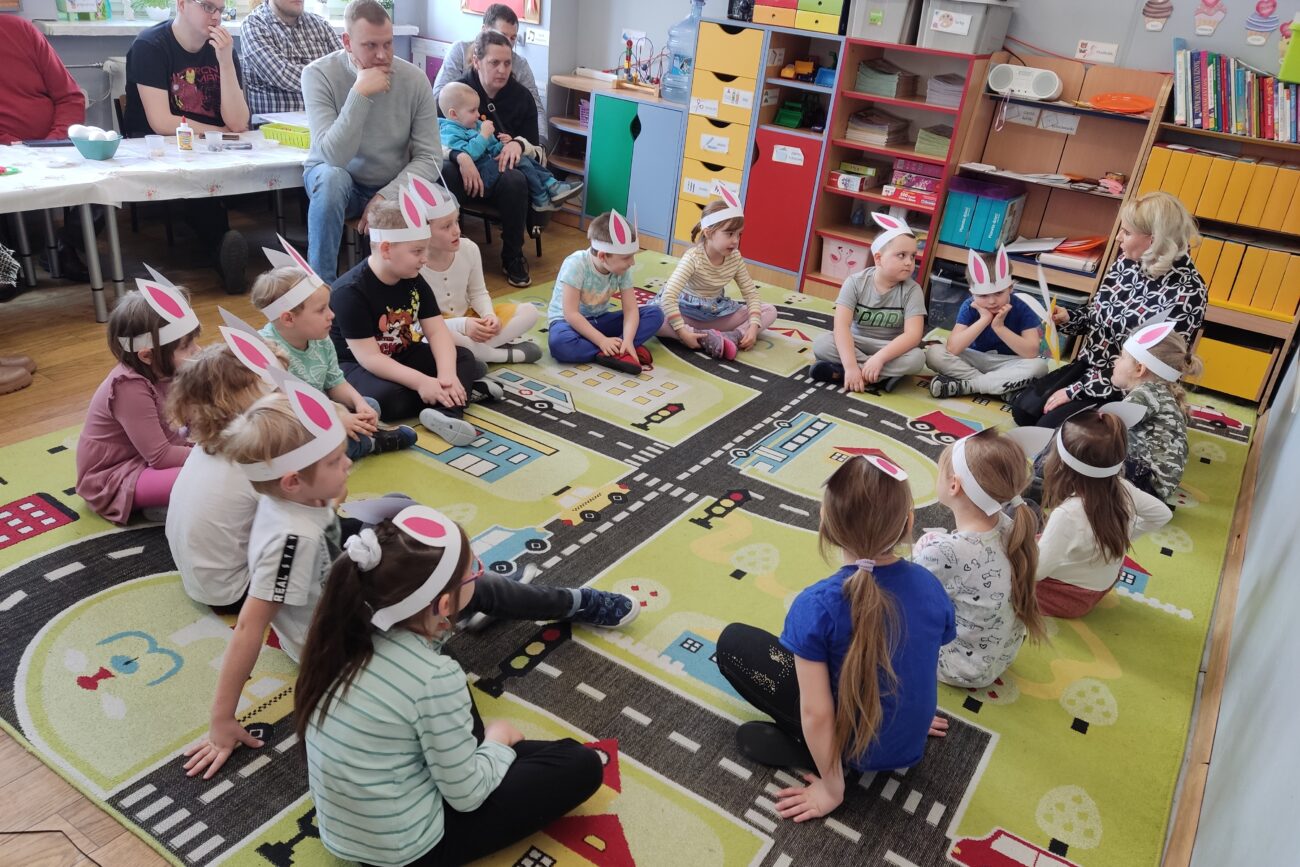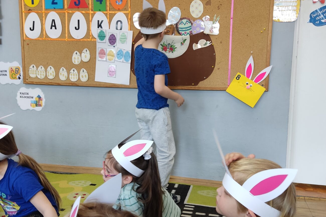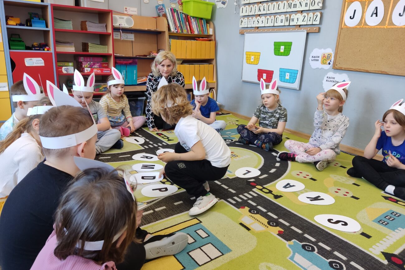 W dniu 05.04.2023r.w grupie „Biedronki „ odbyły się zajęcia otwarte z udziałem Rodziców, którego tematem były:”Zabawy z Wielkanocnym Zajączkiem „. Dzieci poprzez różnorodne zadania do wykonania miały okazję do poznawania tradycji Świąt Wielkanocnych.Rozwiązywały zagadki, szyfr cyfrowo- literowy, nazywały figury geometryczne, liczyły, przeliczały elementy oraz rozpoznawały poznane cyfry. Wykonywały działania na dodawanie i odejmowanie w zabawie matematycznej:”Jajeczne rachunki”. Utrwalały znajomość poznanych liter drukowanych oraz wyodrębniały głoskę w nagłosie nazwy obrazka. Układały pisankowe puzzle z pociętych części w całość. Uczestniczyły w zabawach muzyczno- ruchowych: „Szło jajeczko drogą „, „Zajączki”. Wspólnie zaśpiewały piosenkę, pt:”Pisanki- kraszanki”. Wielkanocny Zajączek za pięknie wykonane przez dzieci zadania przygotował słodką niespodziankę i medale. Na koniec odbyły się warsztaty świąteczne, podczas których dzieci wraz z rodzicami ozdabiały jajka.