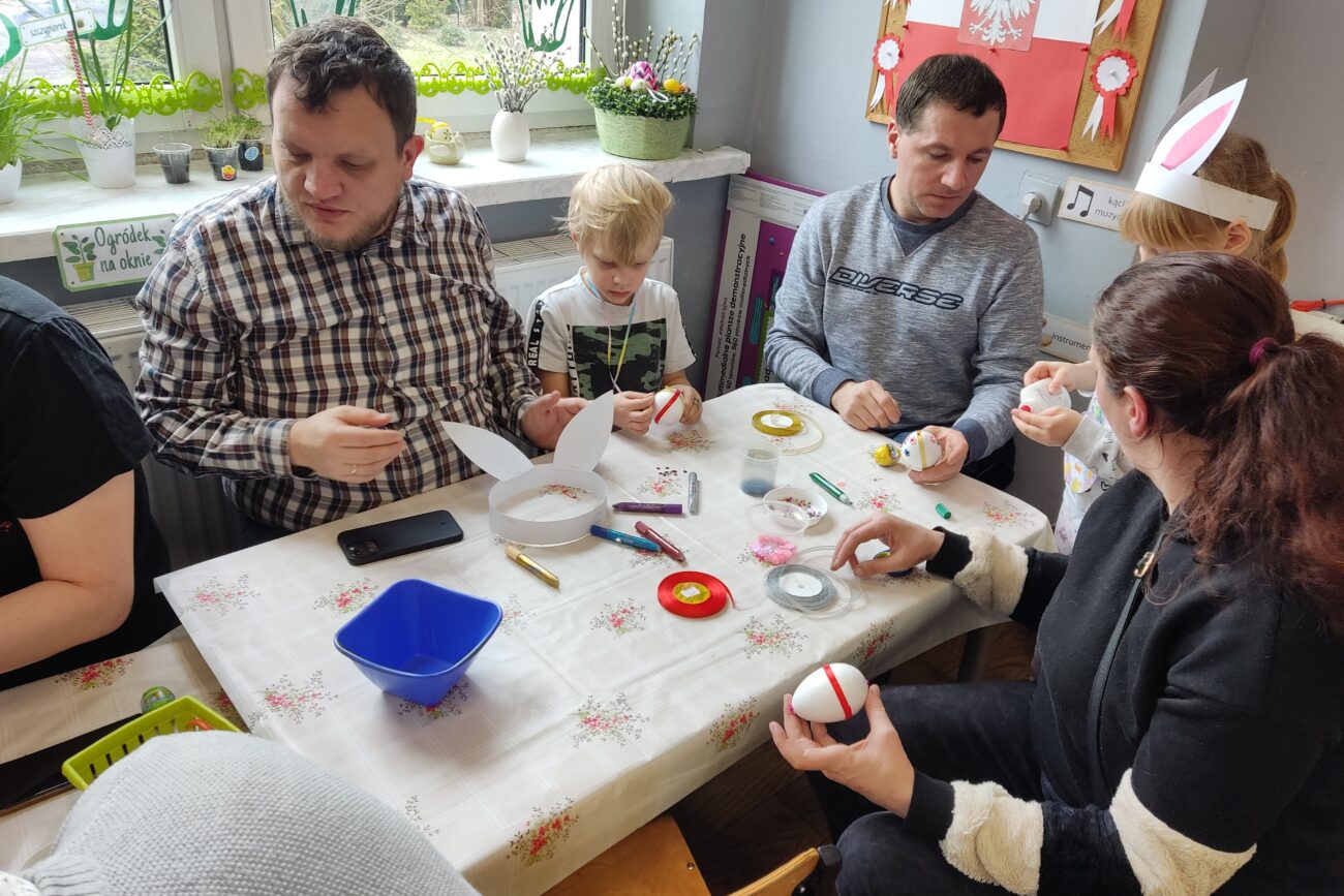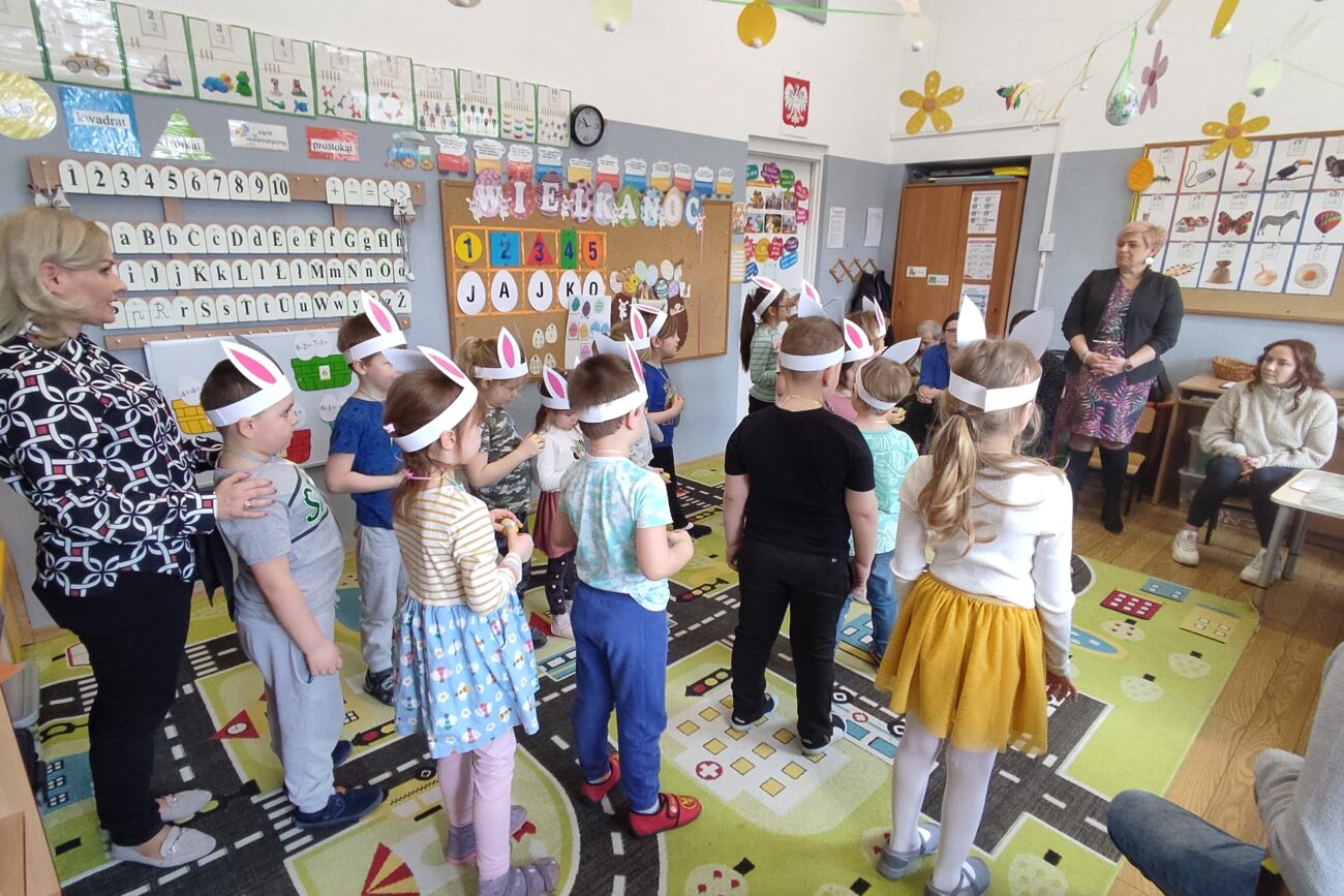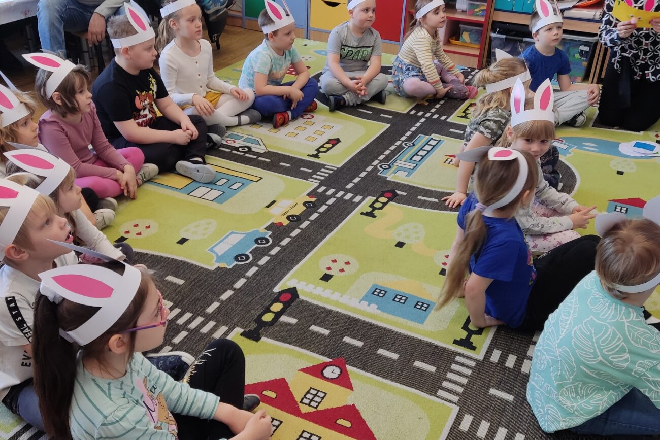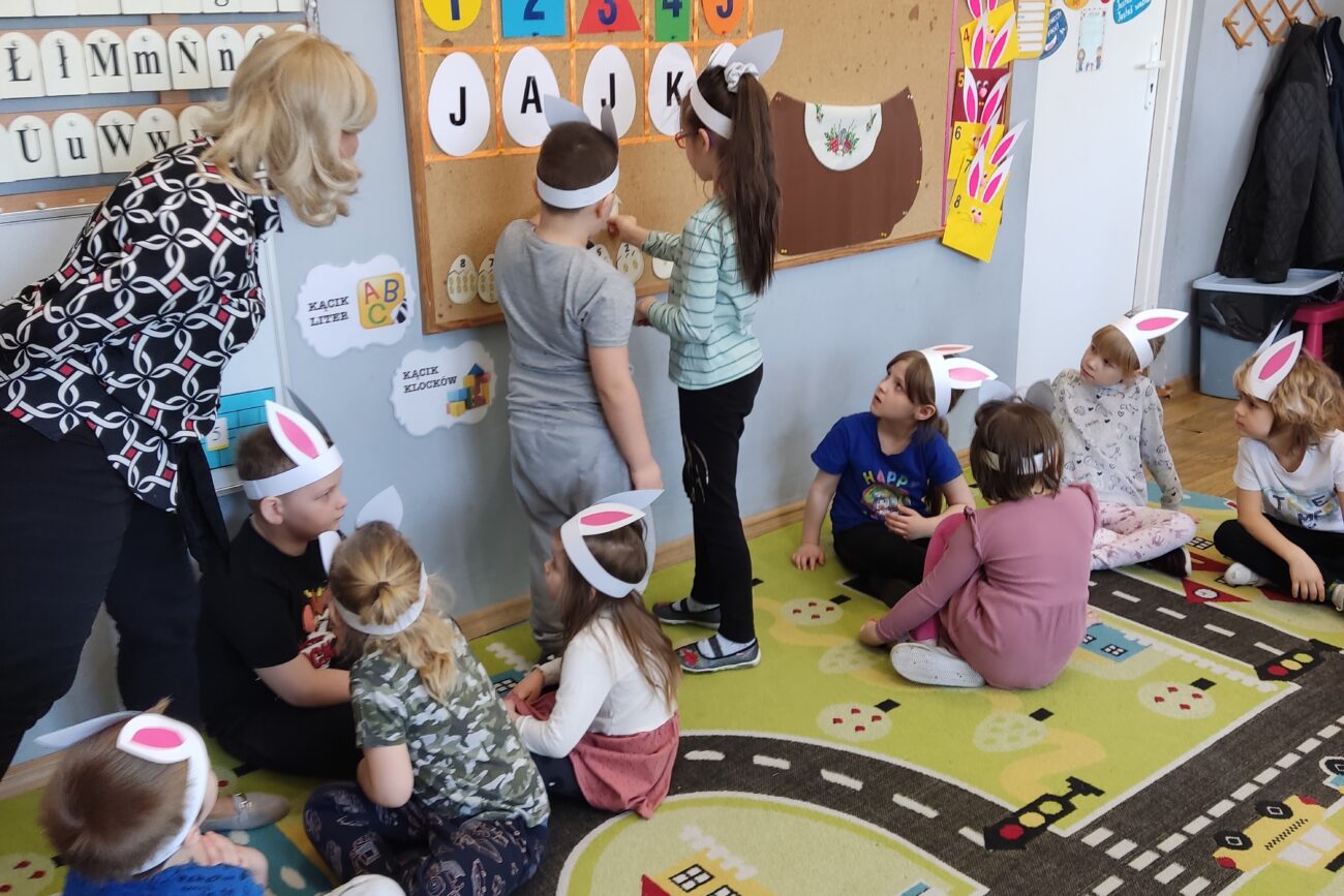 W dniu 05.04.2023r.w grupie „Biedronki „ odbyły się zajęcia otwarte z udziałem Rodziców, którego tematem były:”Zabawy z Wielkanocnym Zajączkiem „. Dzieci poprzez różnorodne zadania do wykonania miały okazję do poznawania tradycji Świąt Wielkanocnych.Rozwiązywały zagadki, szyfr cyfrowo- literowy, nazywały figury geometryczne, liczyły, przeliczały elementy oraz rozpoznawały poznane cyfry. Wykonywały działania na dodawanie i odejmowanie w zabawie matematycznej:”Jajeczne rachunki”. Utrwalały znajomość poznanych liter drukowanych oraz wyodrębniały głoskę w nagłosie nazwy obrazka. Układały pisankowe puzzle z pociętych części w całość. Uczestniczyły w zabawach muzyczno- ruchowych: „Szło jajeczko drogą „, „Zajączki”. Wspólnie zaśpiewały piosenkę, pt:”Pisanki- kraszanki”. Wielkanocny Zajączek za pięknie wykonane przez dzieci zadania przygotował słodką niespodziankę i medale. Na koniec odbyły się warsztaty świąteczne, podczas których dzieci wraz z rodzicami ozdabiały jajka.