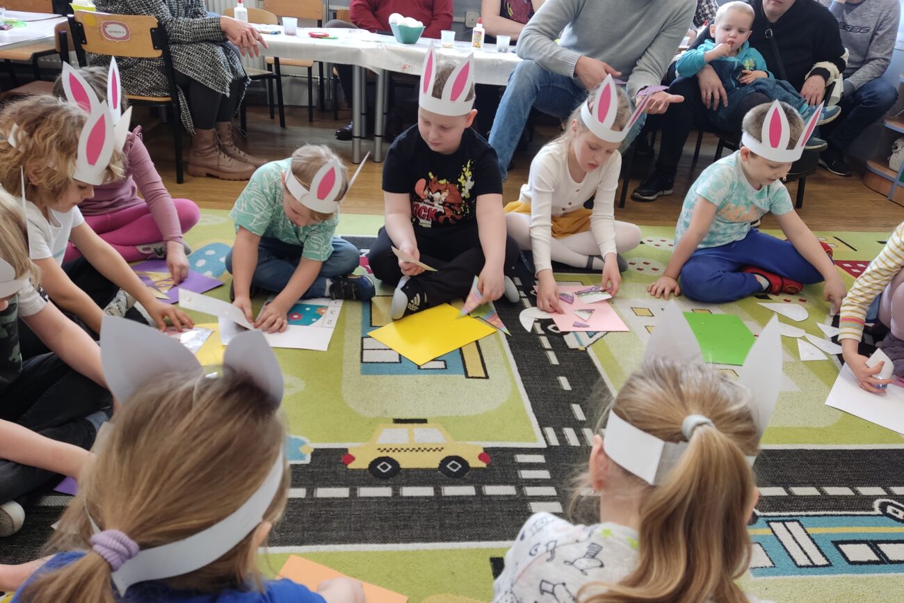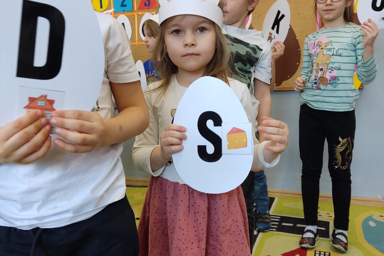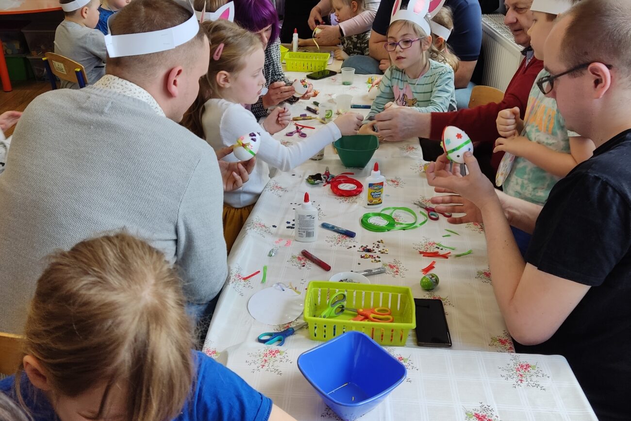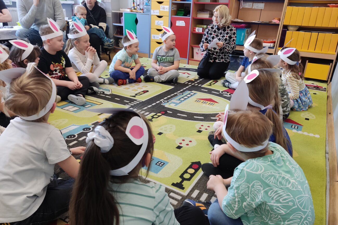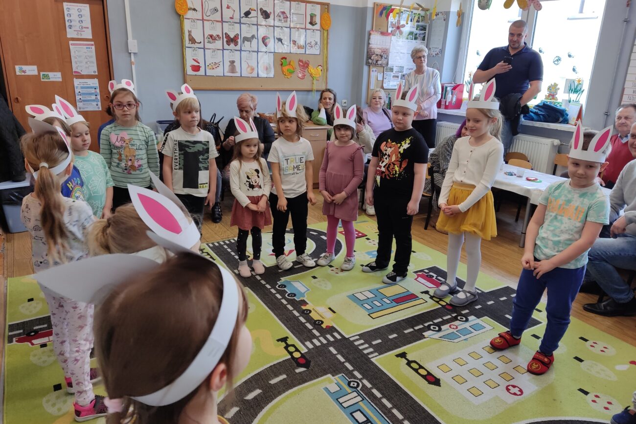 W dniu 05.04.2023r.w grupie „Biedronki „ odbyły się zajęcia otwarte z udziałem Rodziców, którego tematem były:”Zabawy z Wielkanocnym Zajączkiem „. Dzieci poprzez różnorodne zadania do wykonania miały okazję do poznawania tradycji Świąt Wielkanocnych.Rozwiązywały zagadki, szyfr cyfrowo- literowy, nazywały figury geometryczne, liczyły, przeliczały elementy oraz rozpoznawały poznane cyfry. Wykonywały działania na dodawanie i odejmowanie w zabawie matematycznej:”Jajeczne rachunki”. Utrwalały znajomość poznanych liter drukowanych oraz wyodrębniały głoskę w nagłosie nazwy obrazka. Układały pisankowe puzzle z pociętych części w całość. Uczestniczyły w zabawach muzyczno- ruchowych: „Szło jajeczko drogą „, „Zajączki”. Wspólnie zaśpiewały piosenkę, pt:”Pisanki- kraszanki”. Wielkanocny Zajączek za pięknie wykonane przez dzieci zadania przygotował słodką niespodziankę i medale. Na koniec odbyły się warsztaty świąteczne, podczas których dzieci wraz z rodzicami ozdabiały jajka.