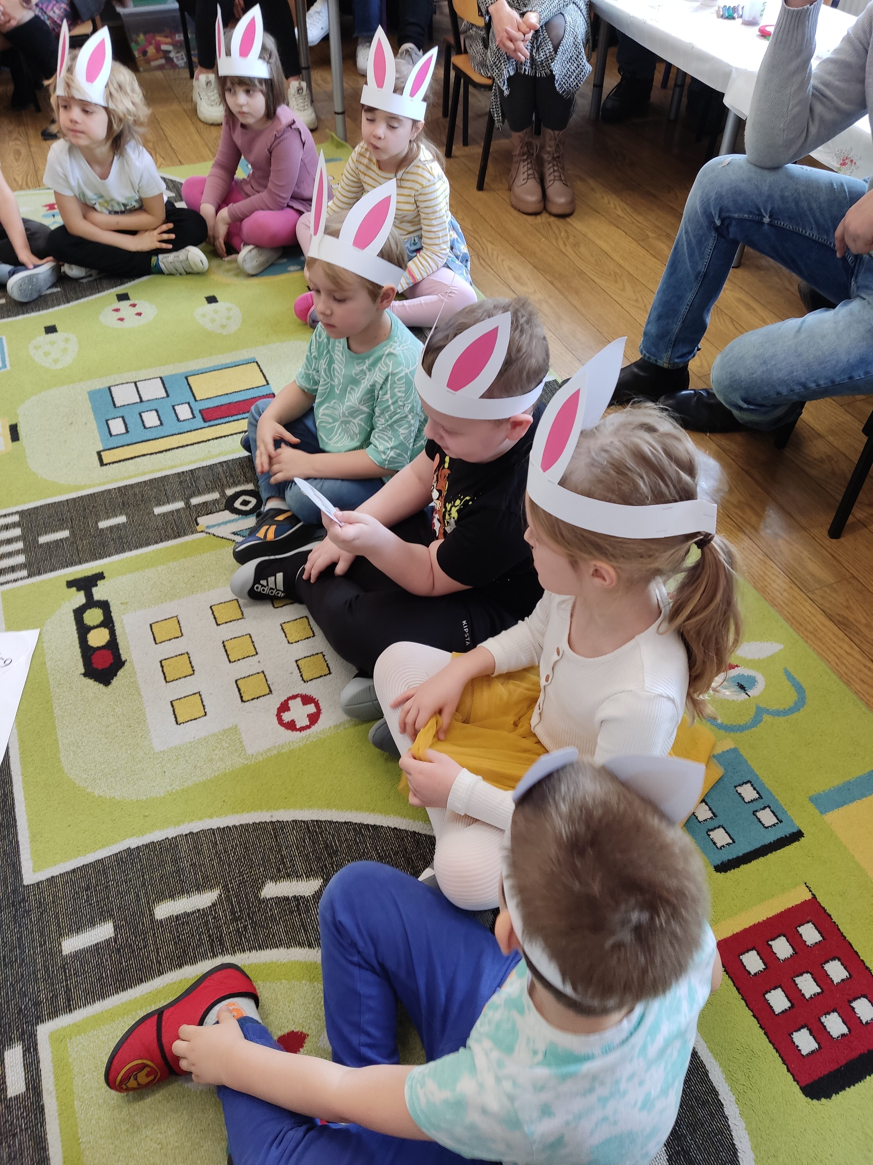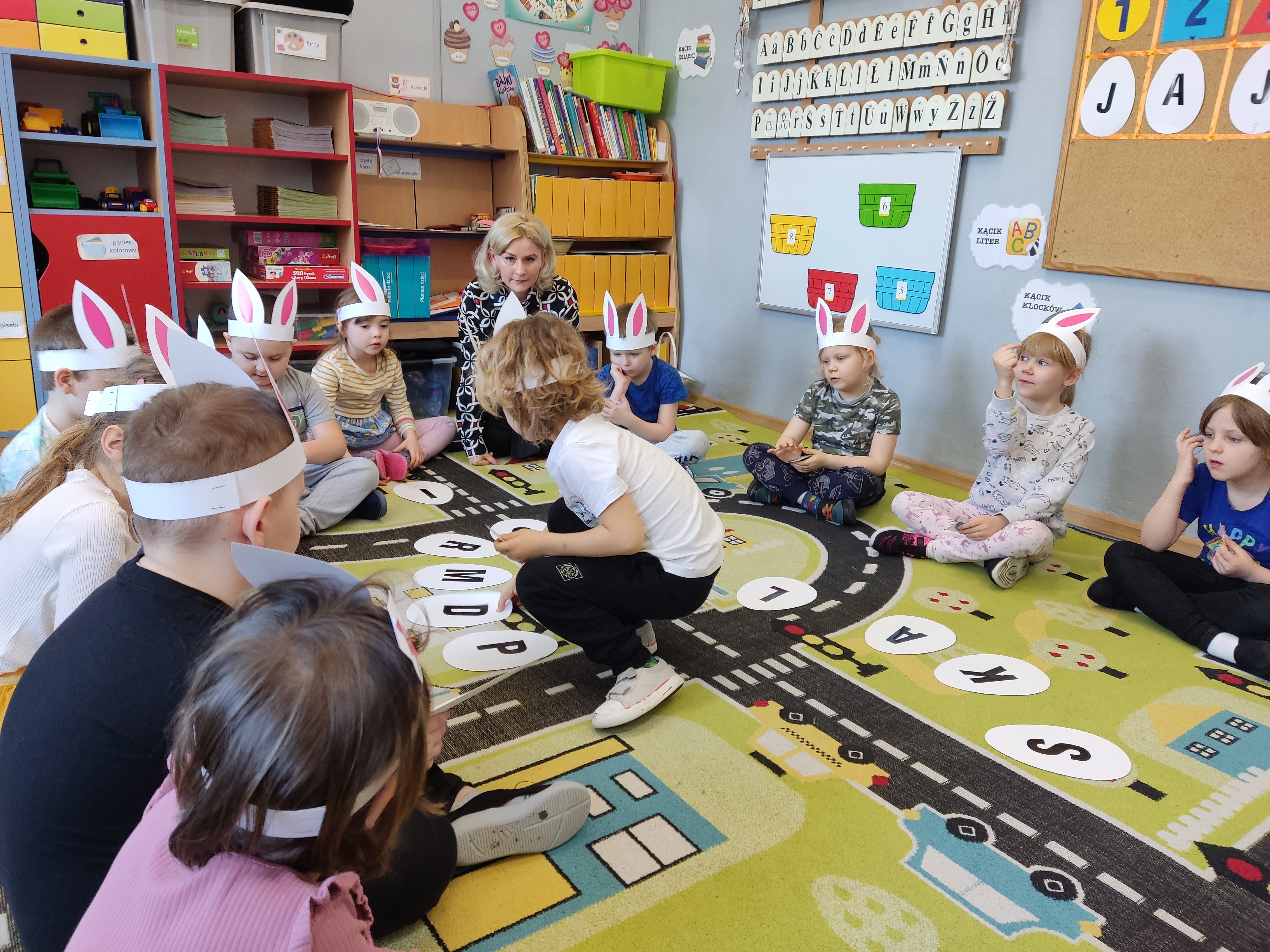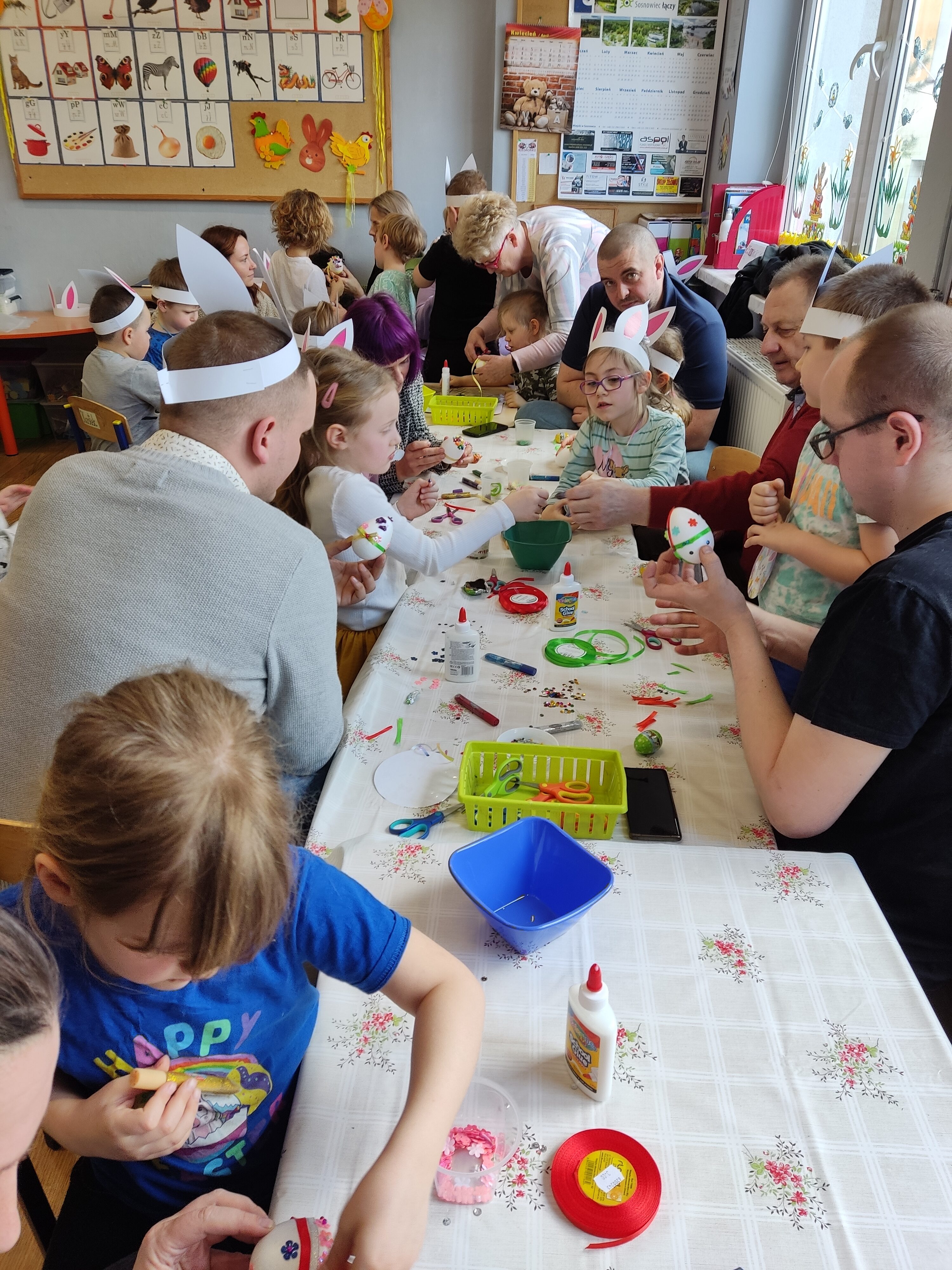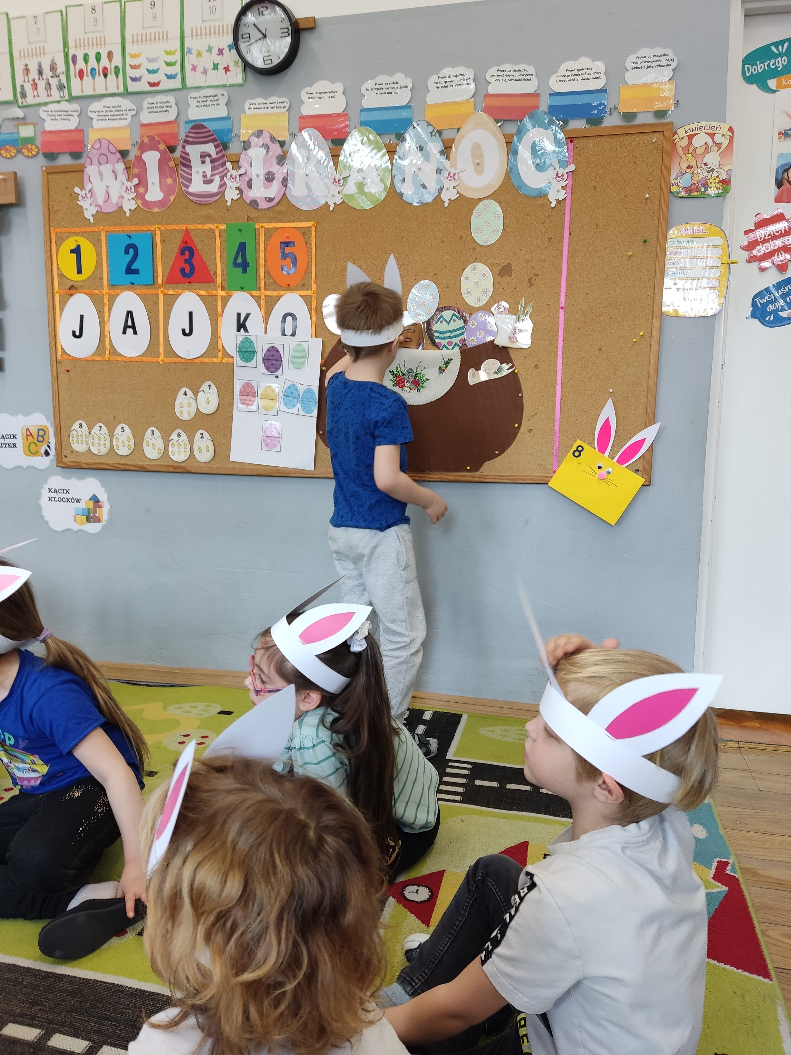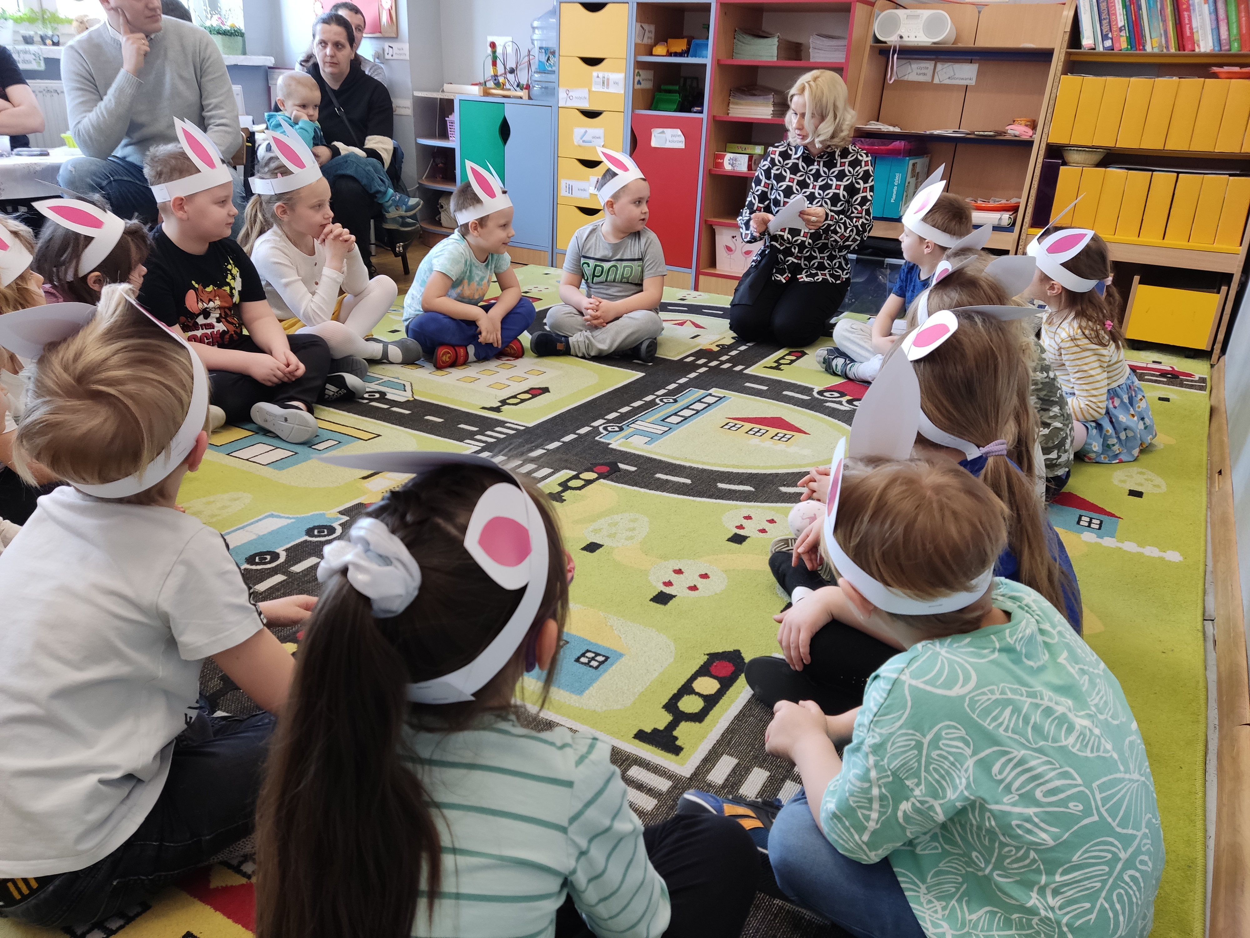 W dniu 05.04.2023r.w grupie „Biedronki „ odbyły się zajęcia otwarte z udziałem Rodziców, którego tematem były:”Zabawy z Wielkanocnym Zajączkiem „. Dzieci poprzez różnorodne zadania do wykonania miały okazję do poznawania tradycji Świąt Wielkanocnych.Rozwiązywały zagadki, szyfr cyfrowo- literowy, nazywały figury geometryczne, liczyły, przeliczały elementy oraz rozpoznawały poznane cyfry. Wykonywały działania na dodawanie i odejmowanie w zabawie matematycznej:”Jajeczne rachunki”. Utrwalały znajomość poznanych liter drukowanych oraz wyodrębniały głoskę w nagłosie nazwy obrazka. Układały pisankowe puzzle z pociętych części w całość. Uczestniczyły w zabawach muzyczno- ruchowych: „Szło jajeczko drogą „, „Zajączki”. Wspólnie zaśpiewały piosenkę, pt:”Pisanki- kraszanki”. Wielkanocny Zajączek za pięknie wykonane przez dzieci zadania przygotował słodką niespodziankę i medale. Na koniec odbyły się warsztaty świąteczne, podczas których dzieci wraz z rodzicami ozdabiały jajka.