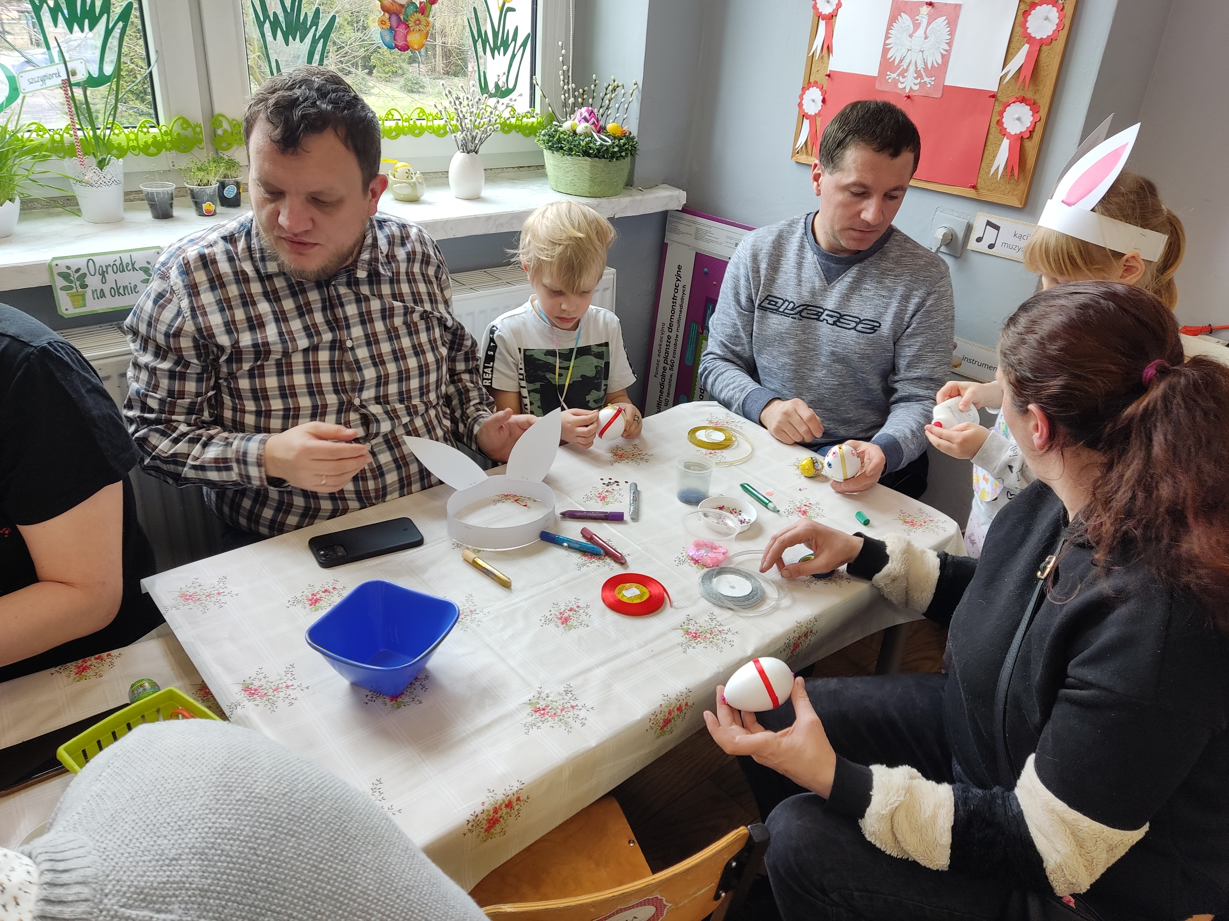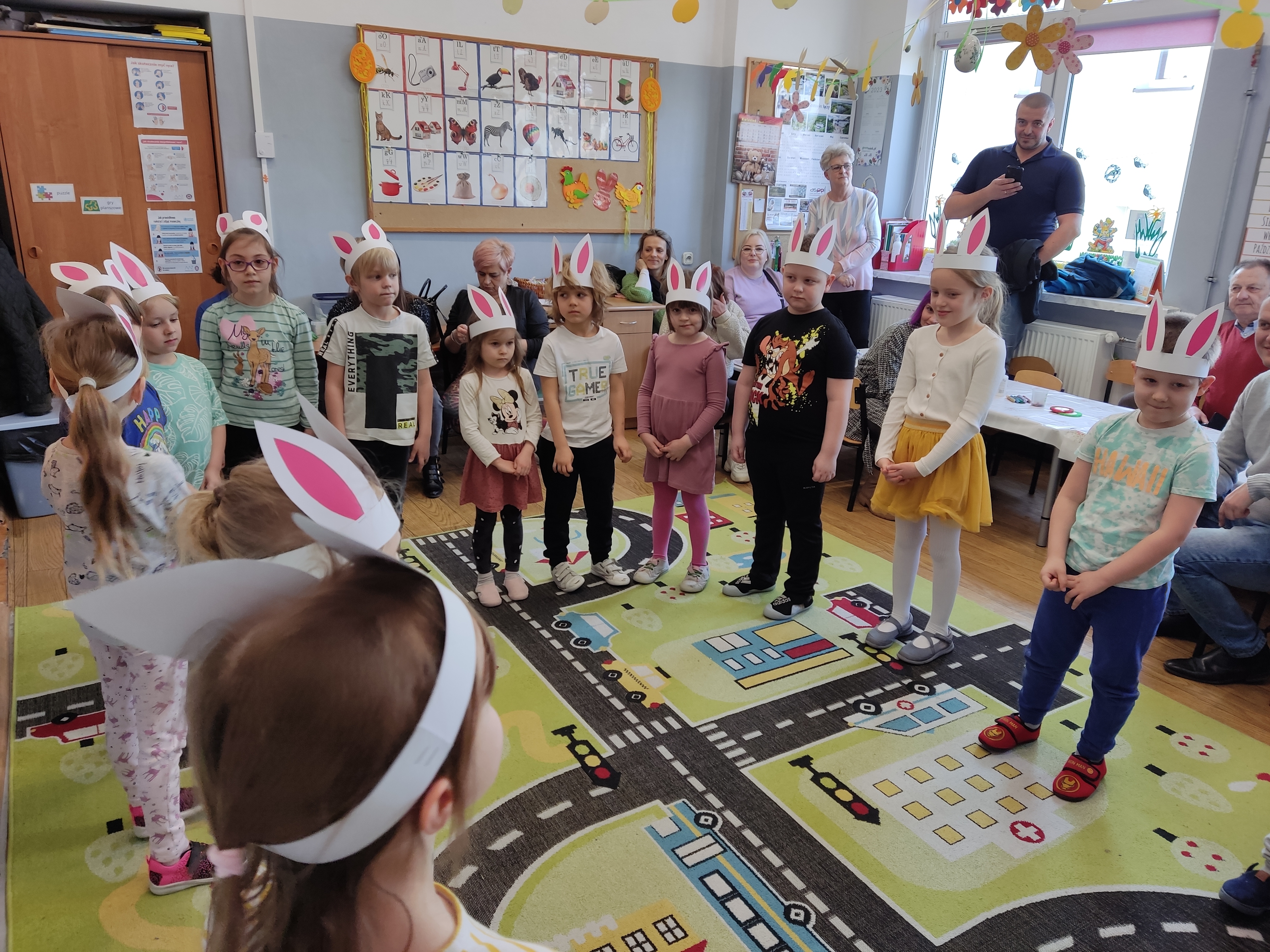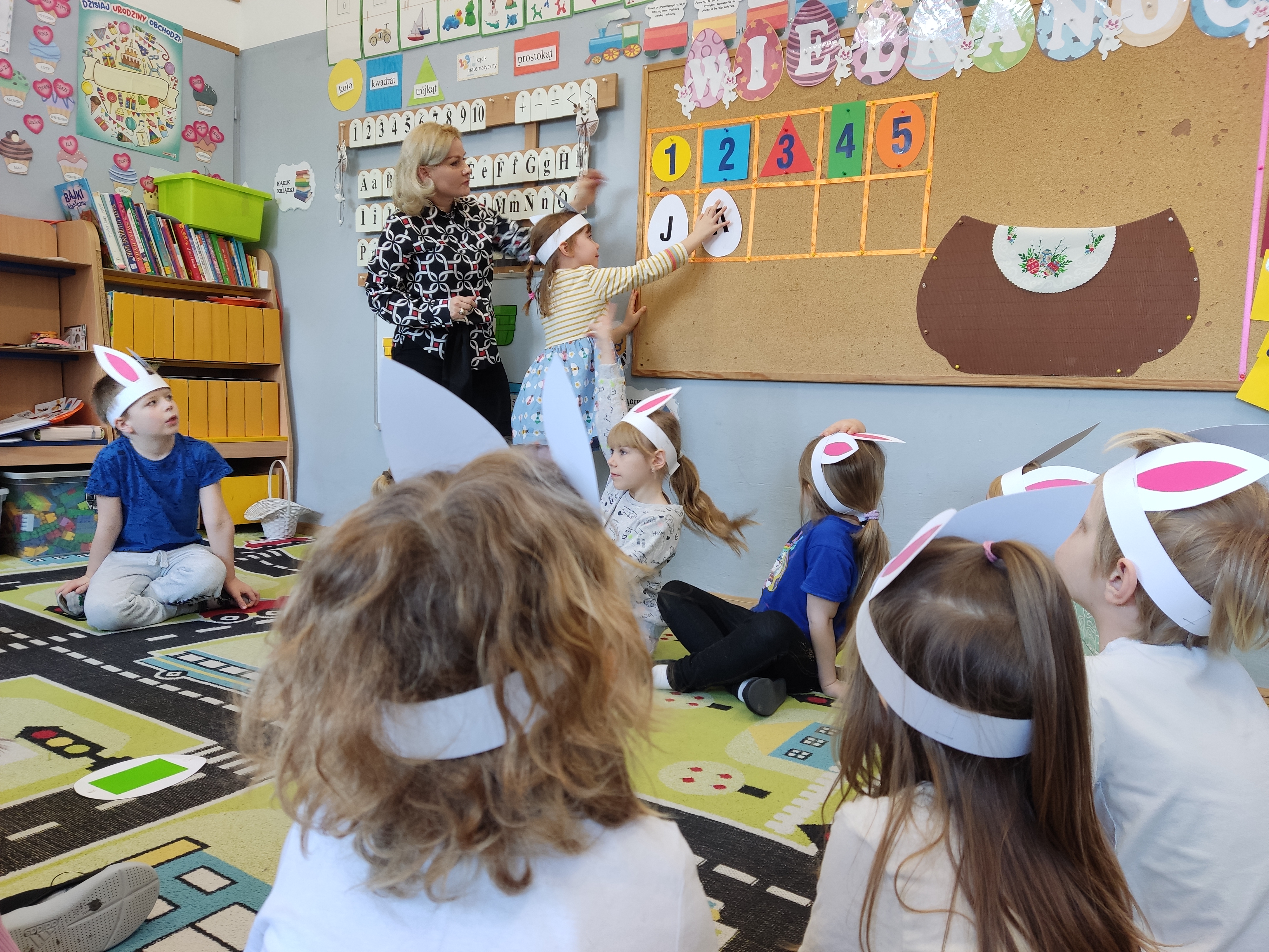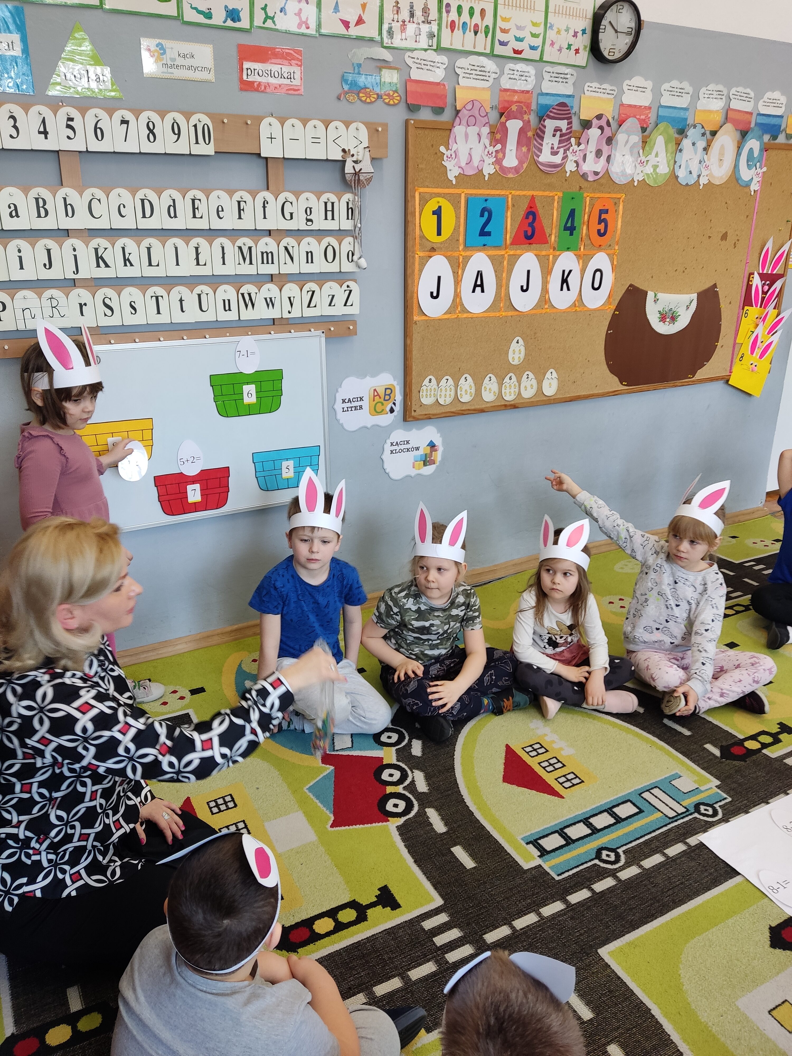W dniu 05.04.2023r.w grupie „Biedronki „ odbyły się zajęcia otwarte z udziałem Rodziców, którego tematem były:”Zabawy z Wielkanocnym Zajączkiem „. Dzieci poprzez różnorodne zadania do wykonania miały okazję do poznawania tradycji Świąt Wielkanocnych.Rozwiązywały zagadki, szyfr cyfrowo- literowy, nazywały figury geometryczne, liczyły, przeliczały elementy oraz rozpoznawały poznane cyfry. Wykonywały działania na dodawanie i odejmowanie w zabawie matematycznej:”Jajeczne rachunki”. Utrwalały znajomość poznanych liter drukowanych oraz wyodrębniały głoskę w nagłosie nazwy obrazka. Układały pisankowe puzzle z pociętych części w całość. Uczestniczyły w zabawach muzyczno- ruchowych: „Szło jajeczko drogą „, „Zajączki”. Wspólnie zaśpiewały piosenkę, pt:”Pisanki- kraszanki”. Wielkanocny Zajączek za pięknie wykonane przez dzieci zadania przygotował słodką niespodziankę i medale. Na koniec odbyły się warsztaty świąteczne, podczas których dzieci wraz z rodzicami ozdabiały jajka.