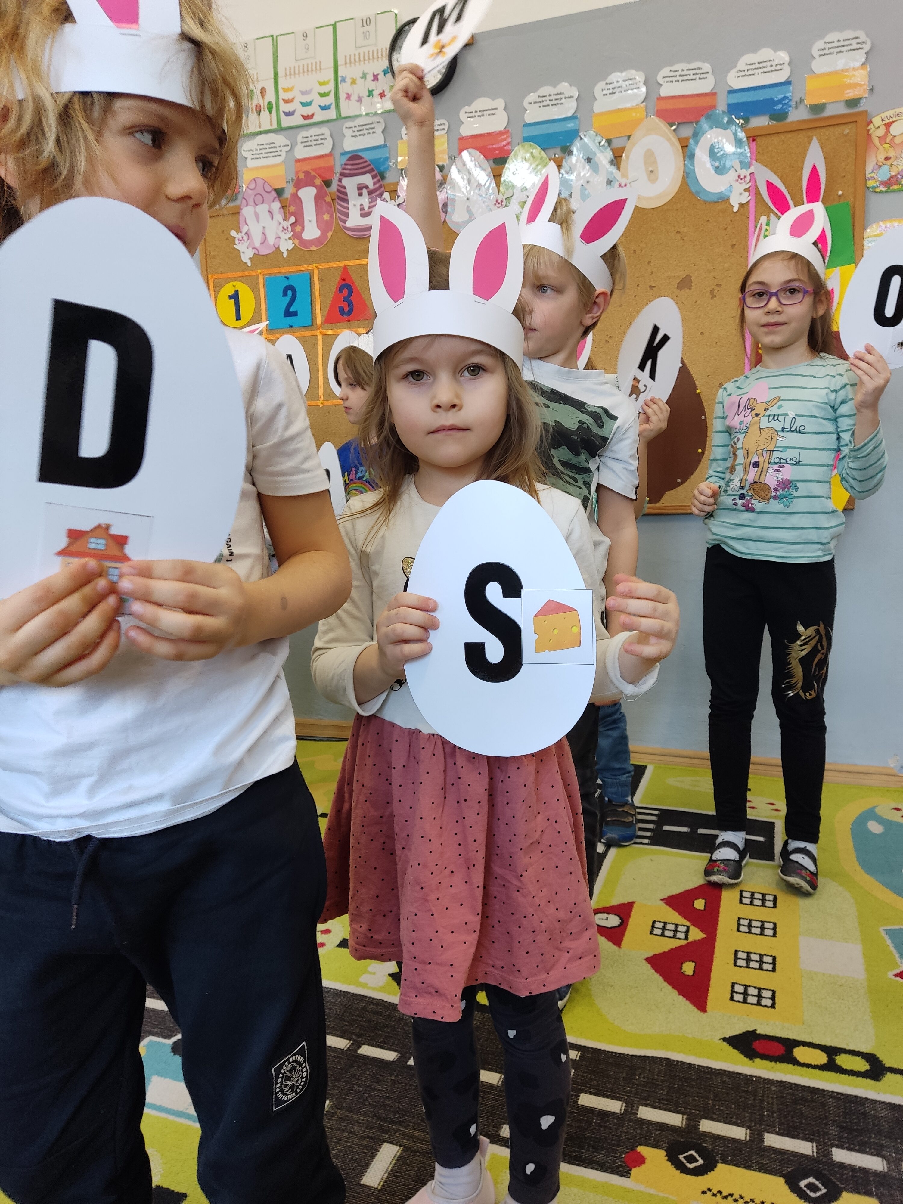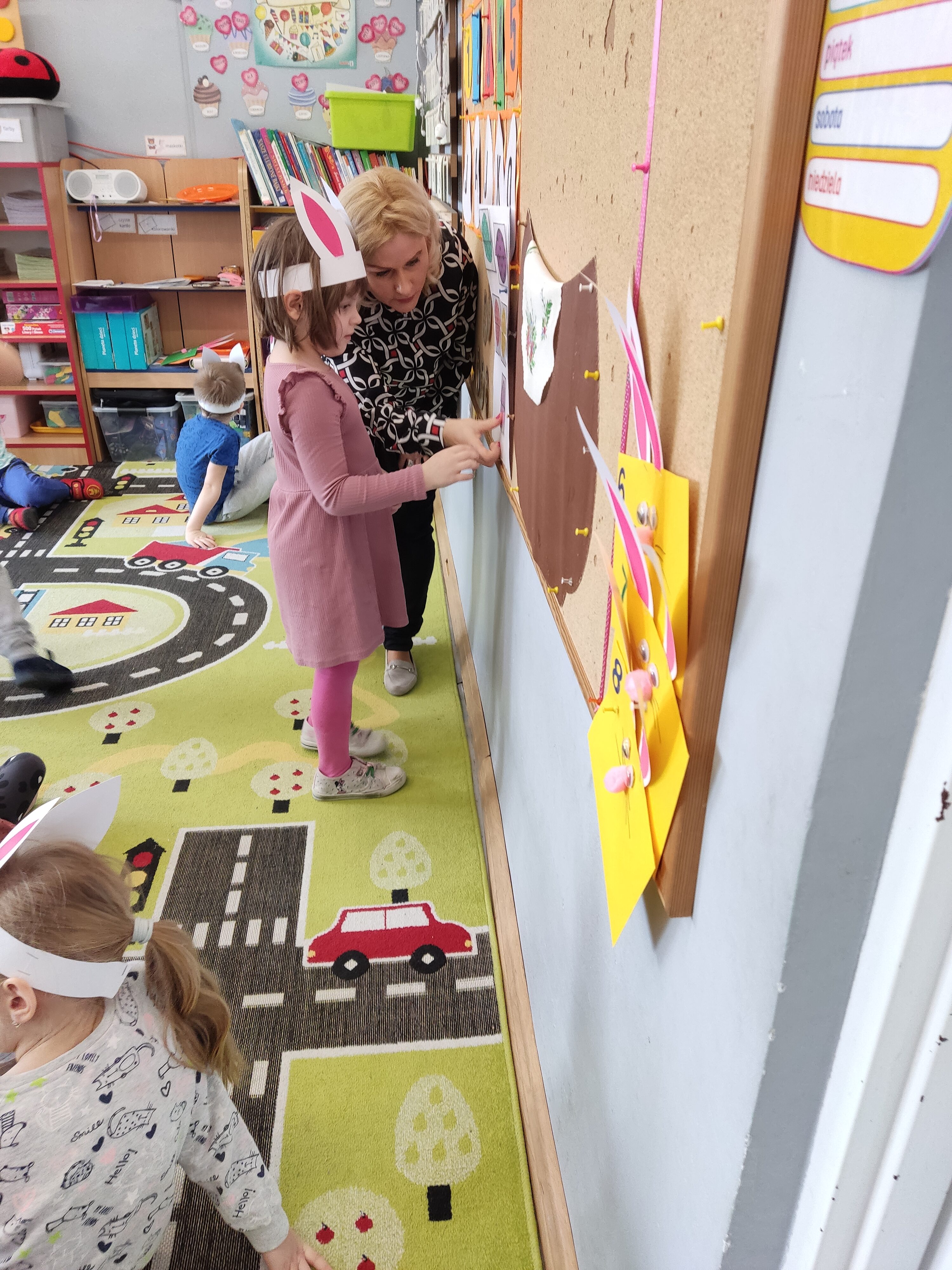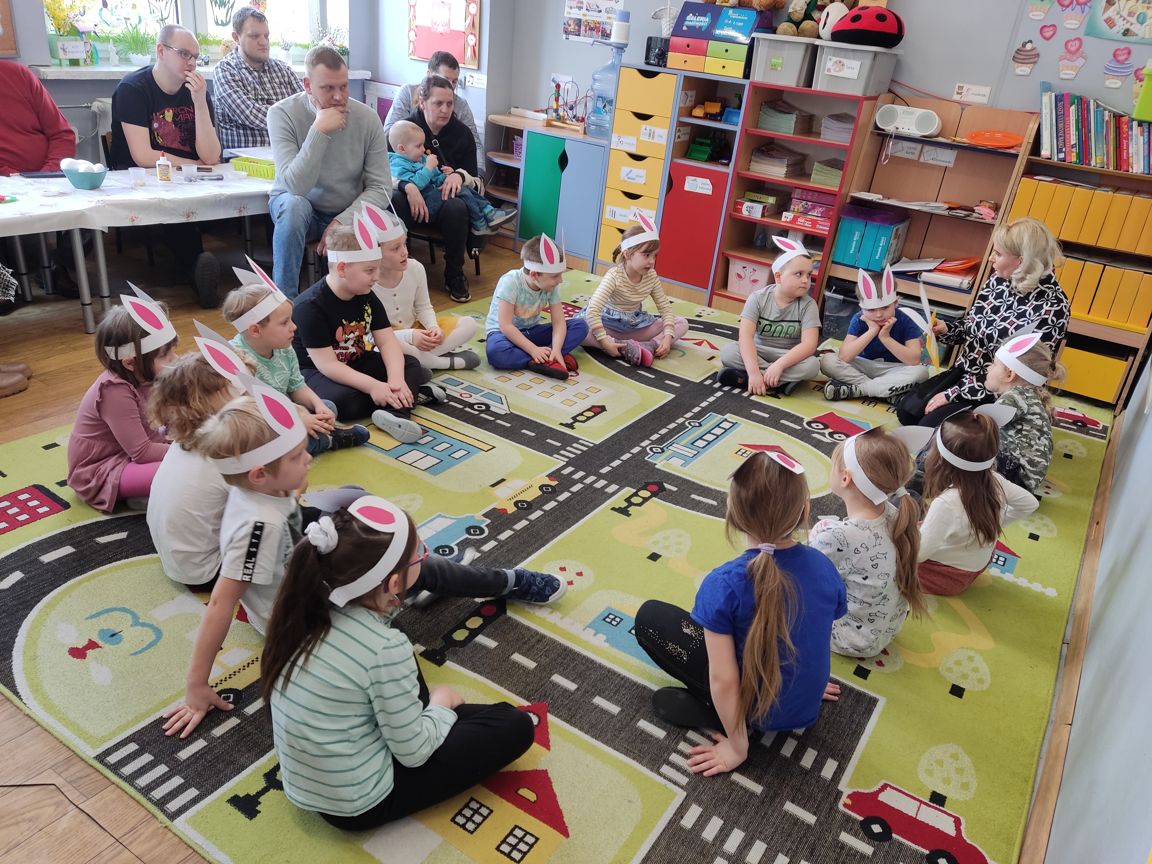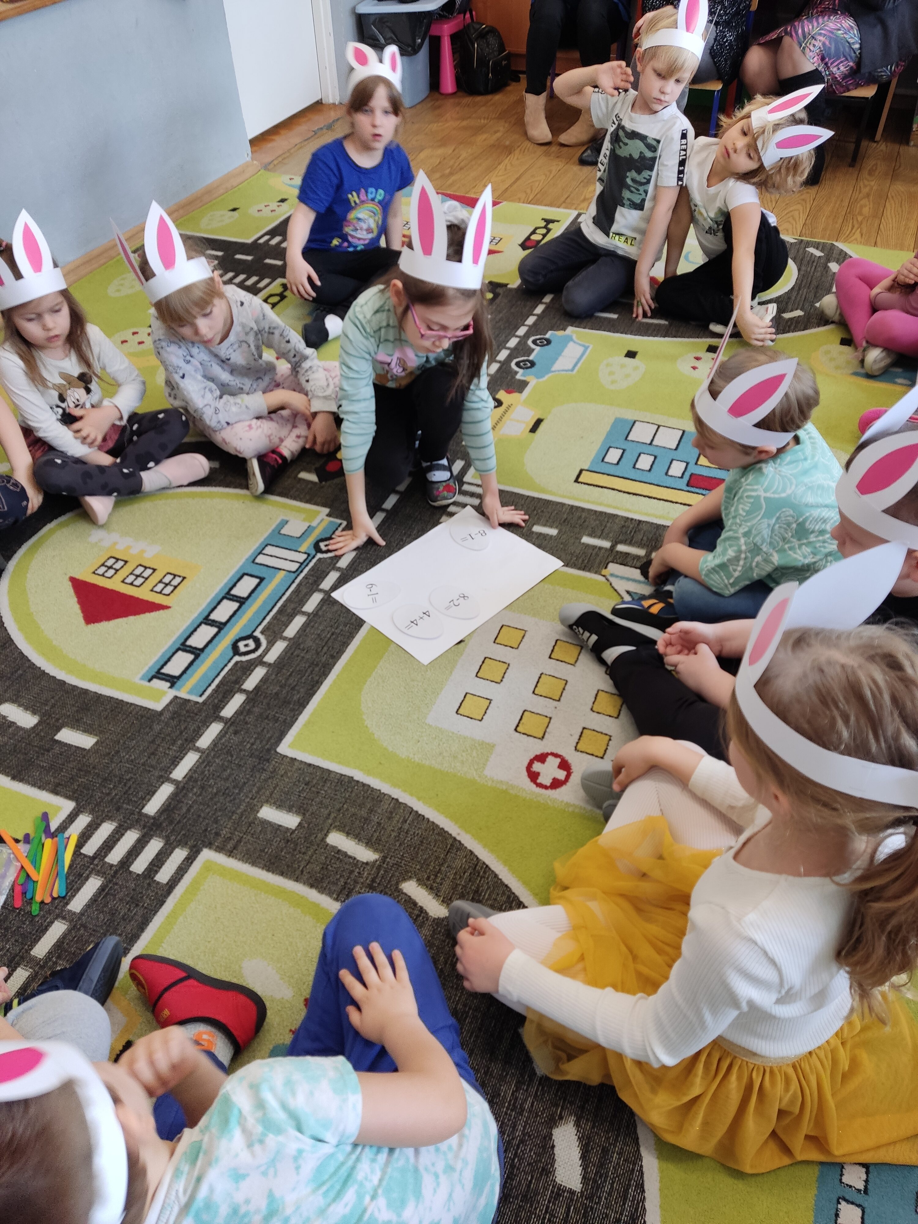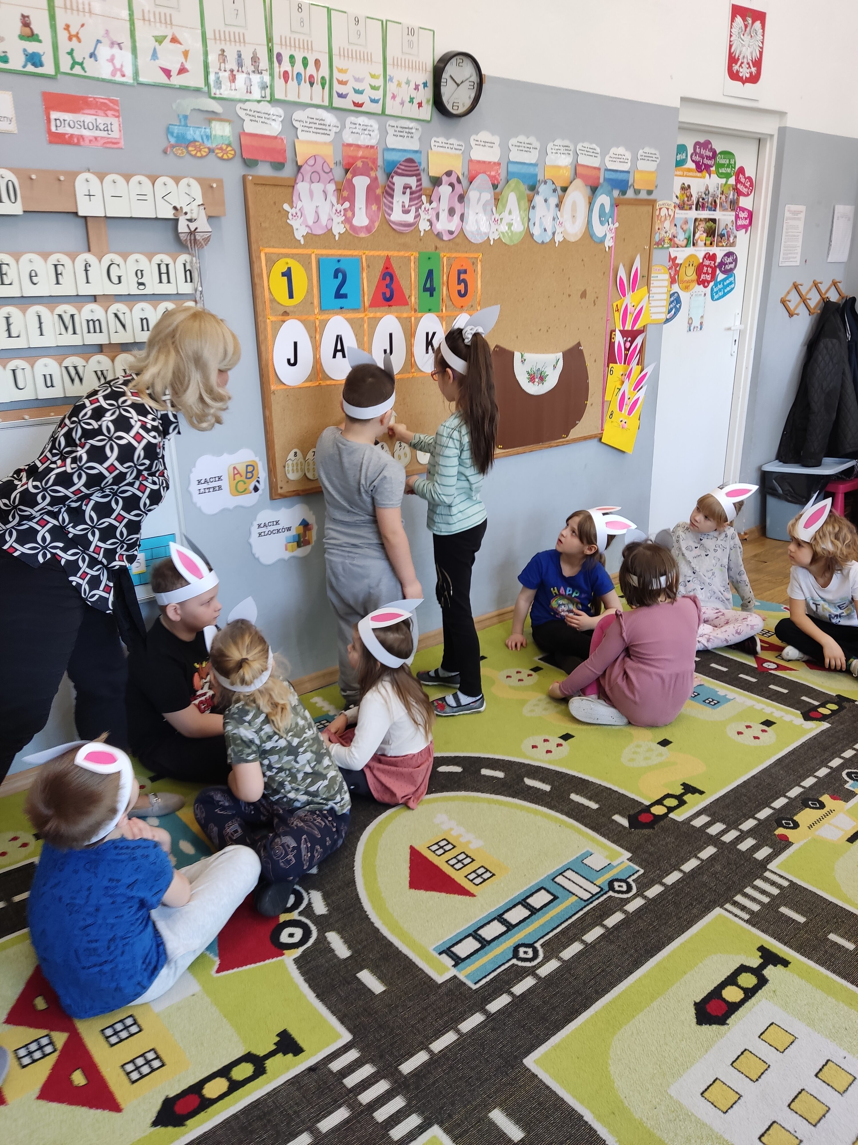 W dniu 05.04.2023r.w grupie „Biedronki „ odbyły się zajęcia otwarte z udziałem Rodziców, którego tematem były:”Zabawy z Wielkanocnym Zajączkiem „. Dzieci poprzez różnorodne zadania do wykonania miały okazję do poznawania tradycji Świąt Wielkanocnych.Rozwiązywały zagadki, szyfr cyfrowo- literowy, nazywały figury geometryczne, liczyły, przeliczały elementy oraz rozpoznawały poznane cyfry. Wykonywały działania na dodawanie i odejmowanie w zabawie matematycznej:”Jajeczne rachunki”. Utrwalały znajomość poznanych liter drukowanych oraz wyodrębniały głoskę w nagłosie nazwy obrazka. Układały pisankowe puzzle z pociętych części w całość. Uczestniczyły w zabawach muzyczno- ruchowych: „Szło jajeczko drogą „, „Zajączki”. Wspólnie zaśpiewały piosenkę, pt:”Pisanki- kraszanki”. Wielkanocny Zajączek za pięknie wykonane przez dzieci zadania przygotował słodką niespodziankę i medale. Na koniec odbyły się warsztaty świąteczne, podczas których dzieci wraz z rodzicami ozdabiały jajka.