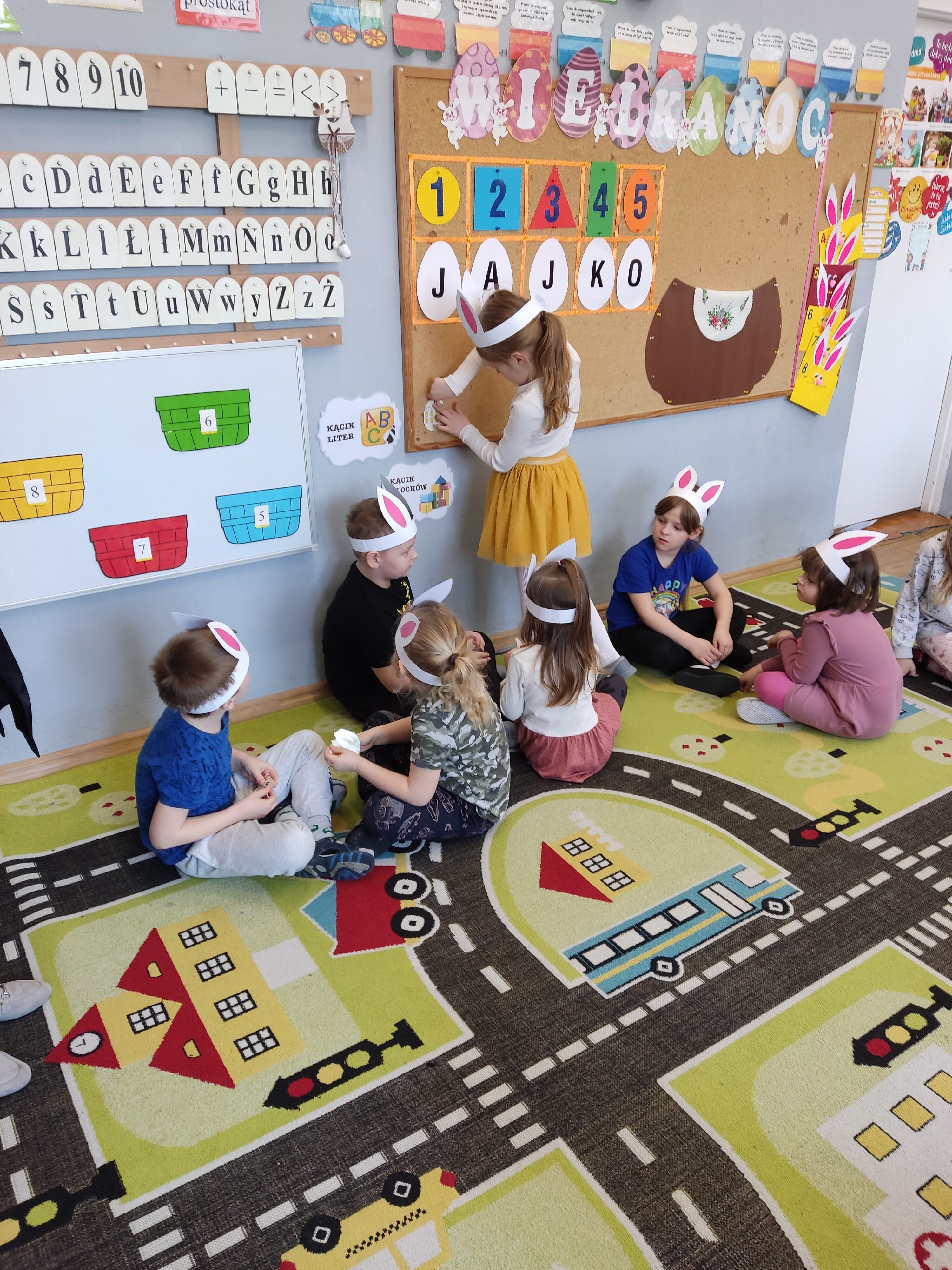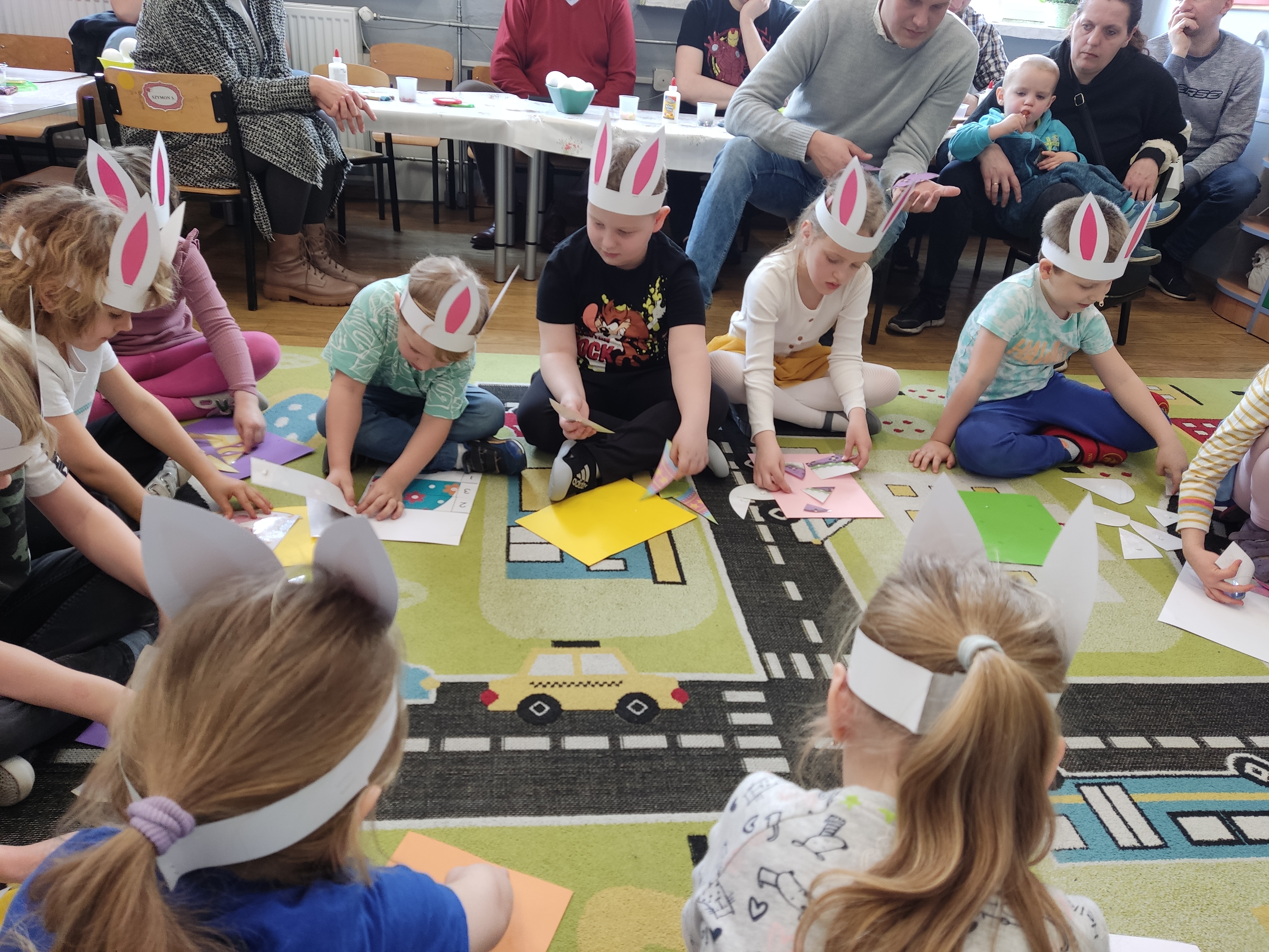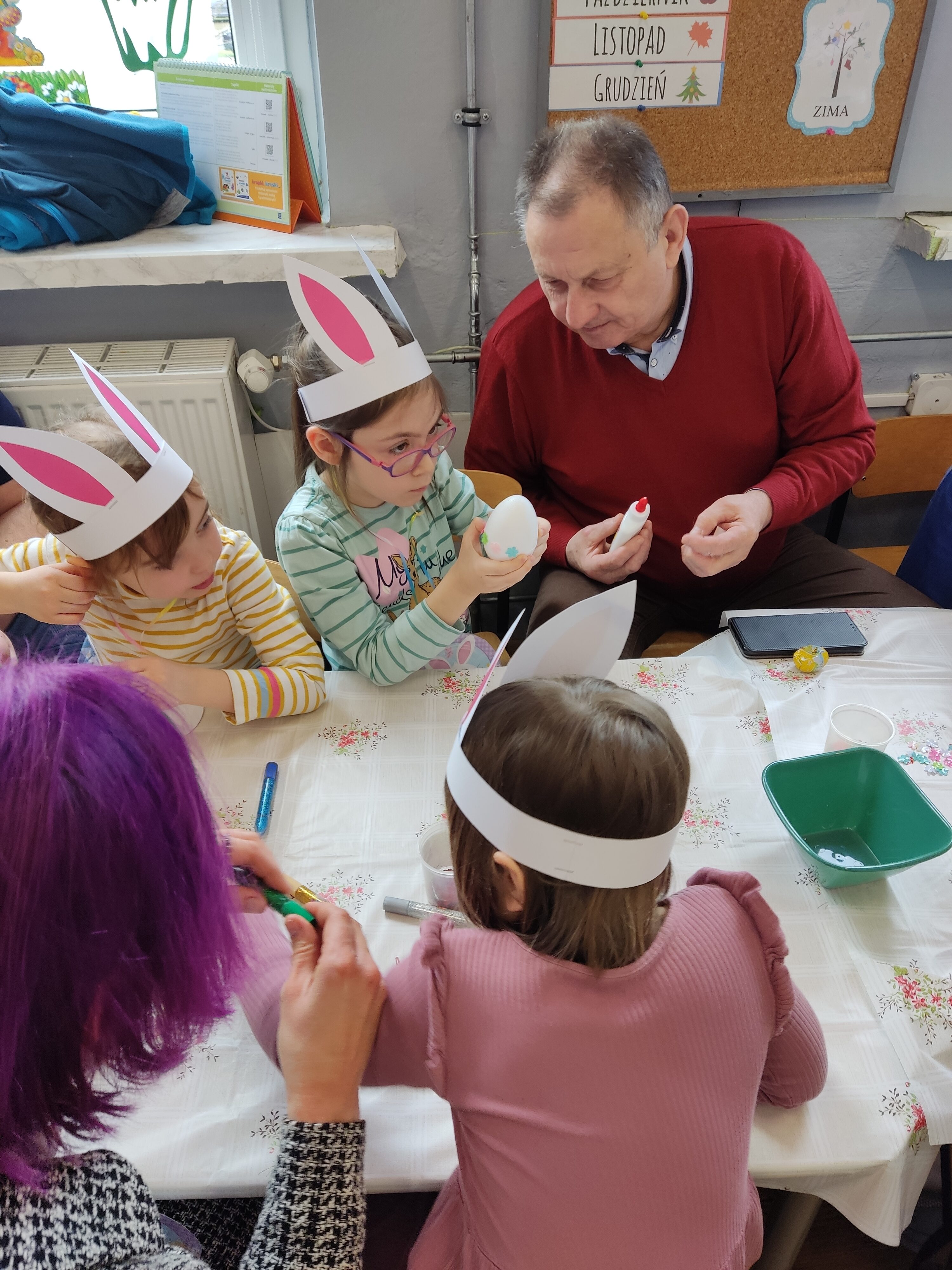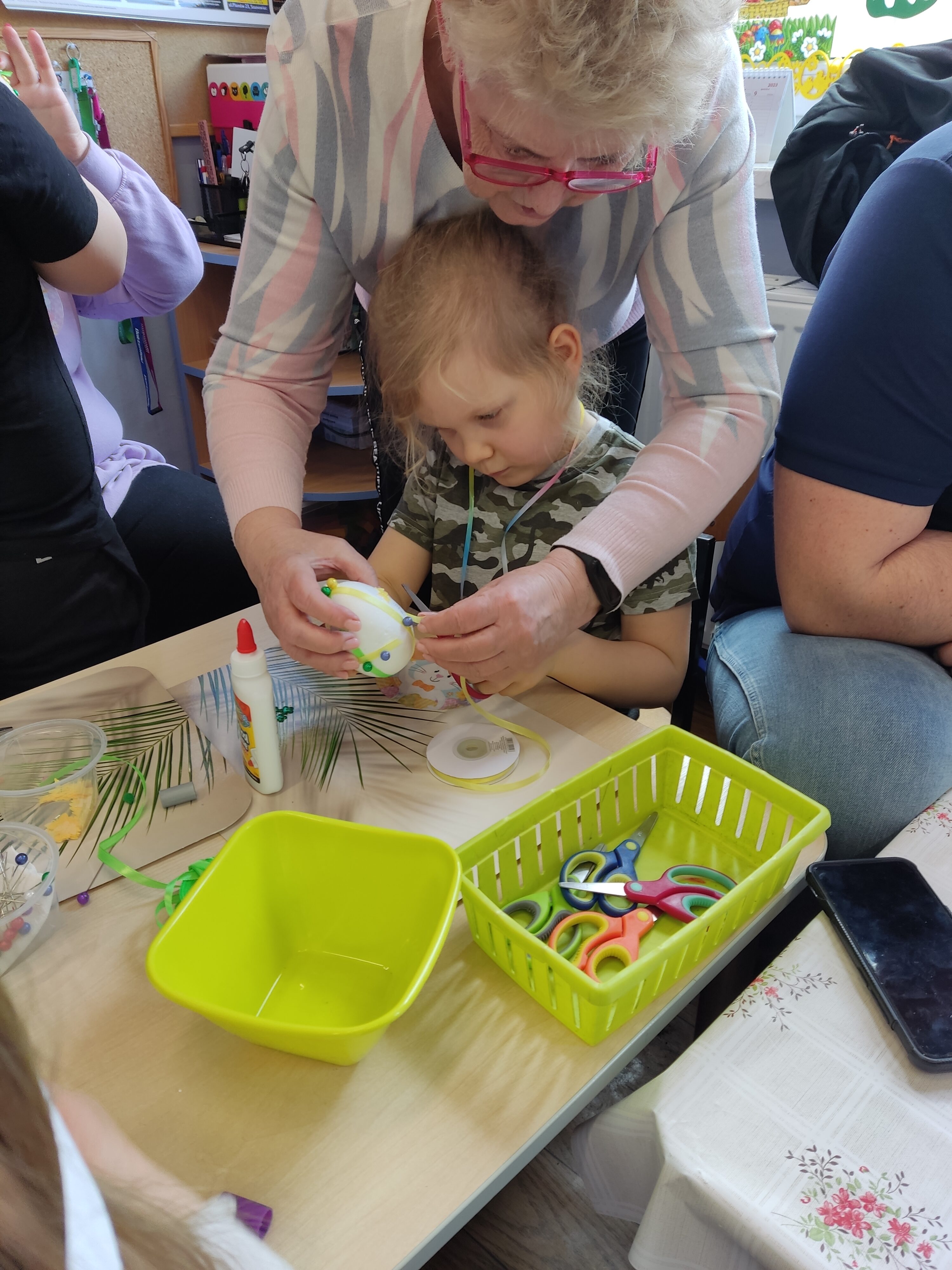 W dniu 05.04.2023r.w grupie „Biedronki „ odbyły się zajęcia otwarte z udziałem Rodziców, którego tematem były:”Zabawy z Wielkanocnym Zajączkiem „. Dzieci poprzez różnorodne zadania do wykonania miały okazję do poznawania tradycji Świąt Wielkanocnych.Rozwiązywały zagadki, szyfr cyfrowo- literowy, nazywały figury geometryczne, liczyły, przeliczały elementy oraz rozpoznawały poznane cyfry. Wykonywały działania na dodawanie i odejmowanie w zabawie matematycznej:”Jajeczne rachunki”. Utrwalały znajomość poznanych liter drukowanych oraz wyodrębniały głoskę w nagłosie nazwy obrazka. Układały pisankowe puzzle z pociętych części w całość. Uczestniczyły w zabawach muzyczno- ruchowych: „Szło jajeczko drogą „, „Zajączki”. Wspólnie zaśpiewały piosenkę, pt:”Pisanki- kraszanki”. Wielkanocny Zajączek za pięknie wykonane przez dzieci zadania przygotował słodką niespodziankę i medale. Na koniec odbyły się warsztaty świąteczne, podczas których dzieci wraz z rodzicami ozdabiały jajka.