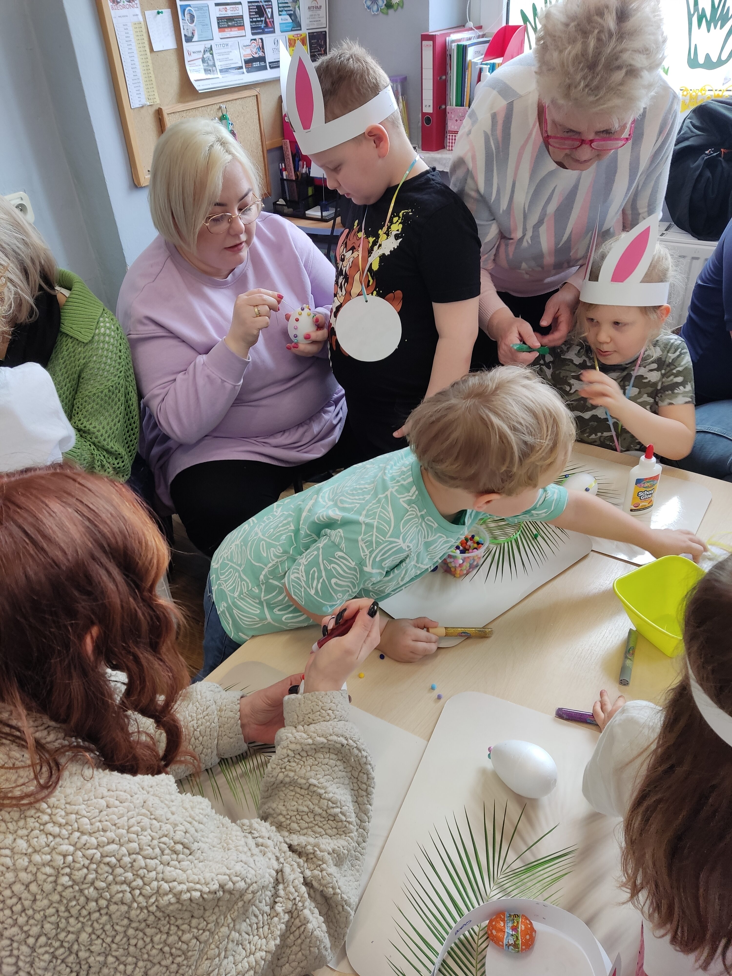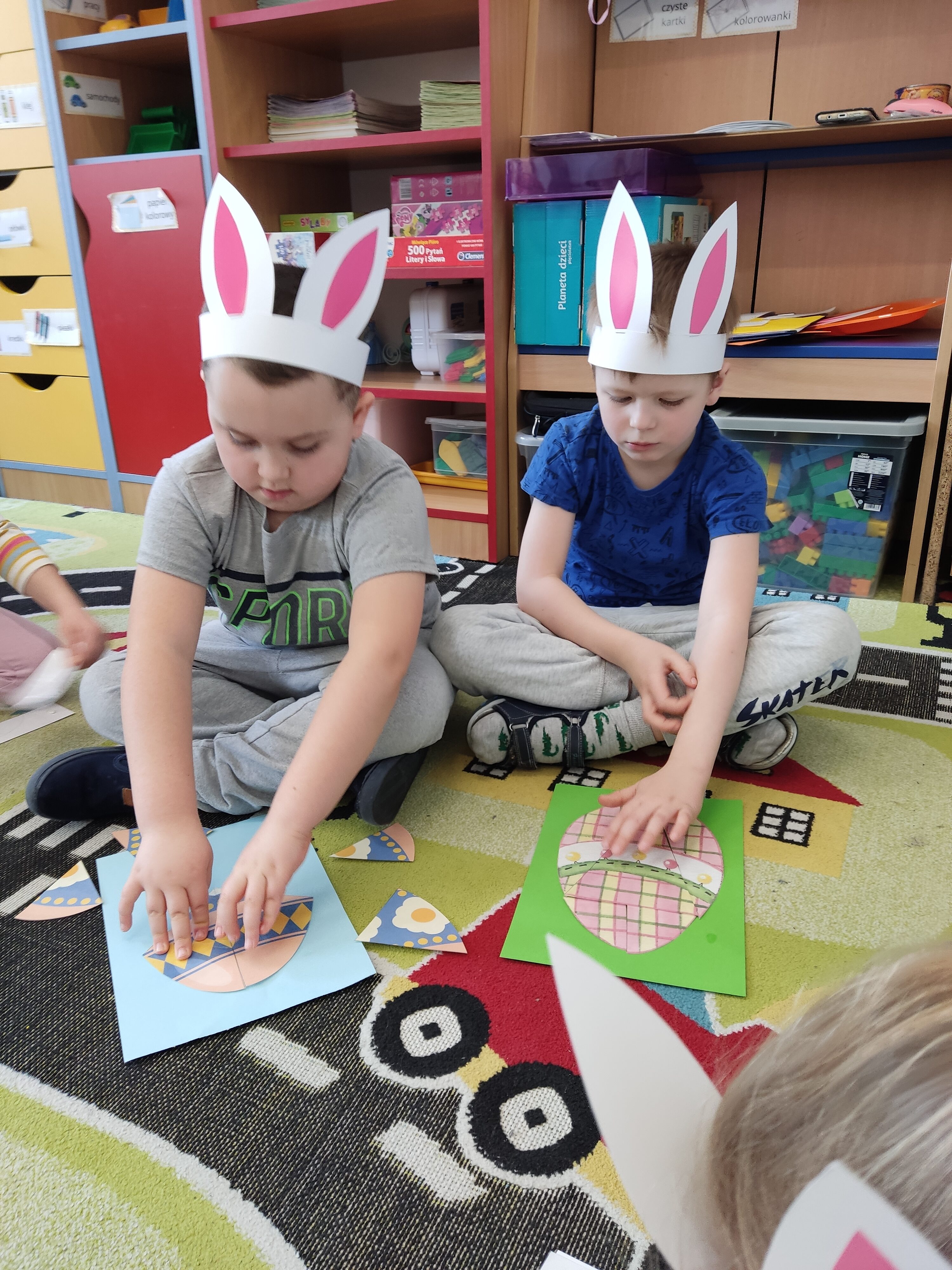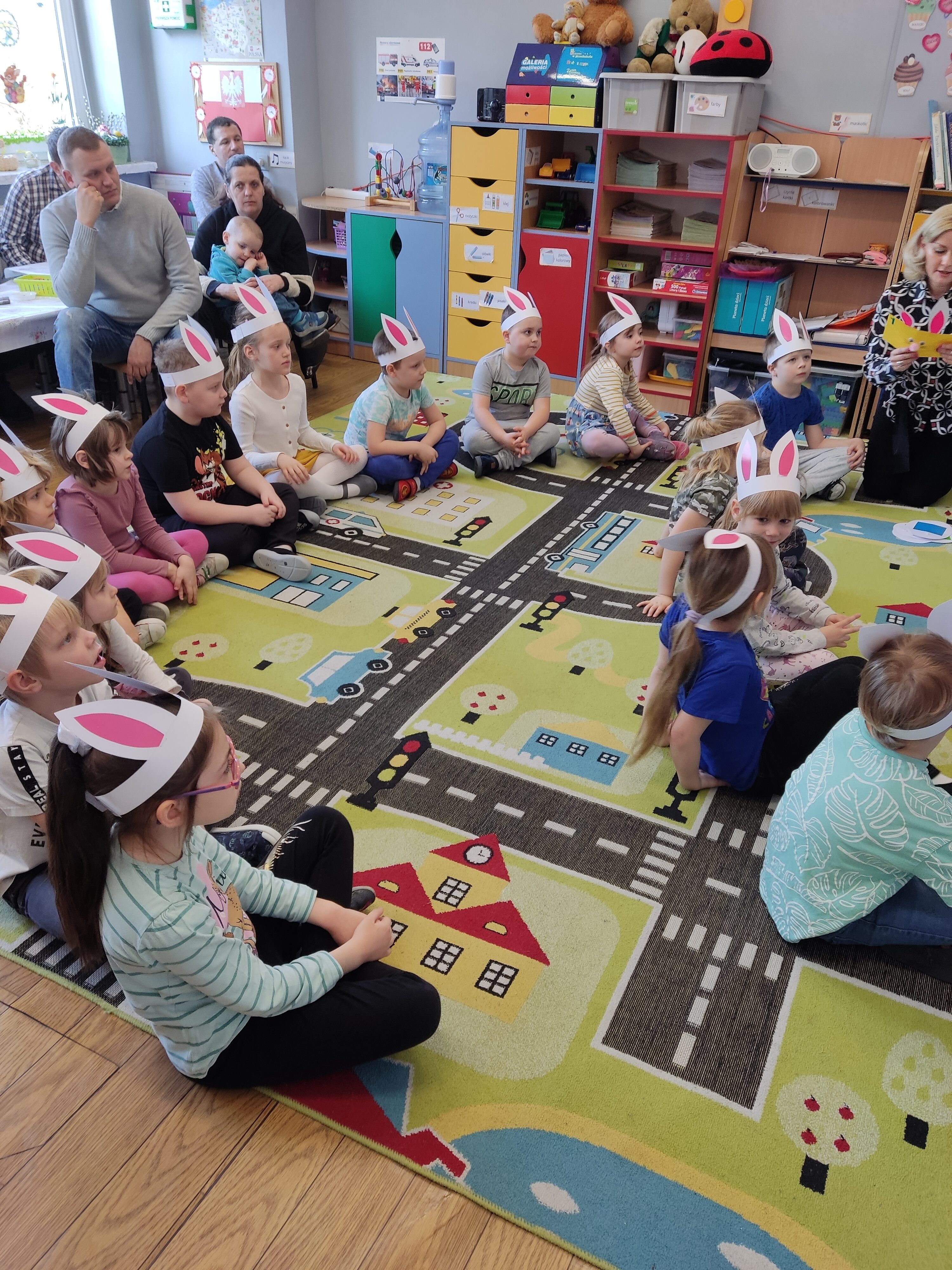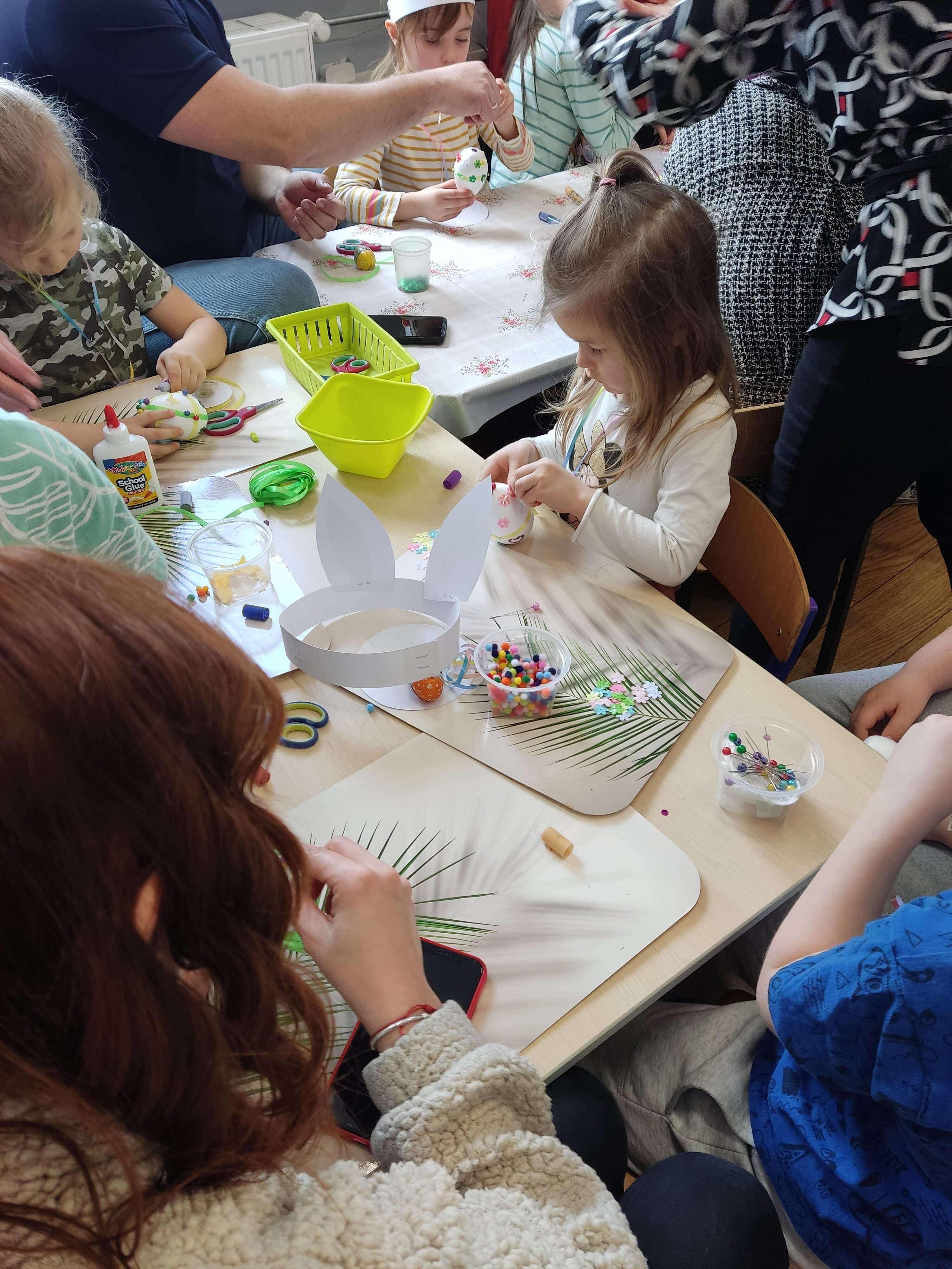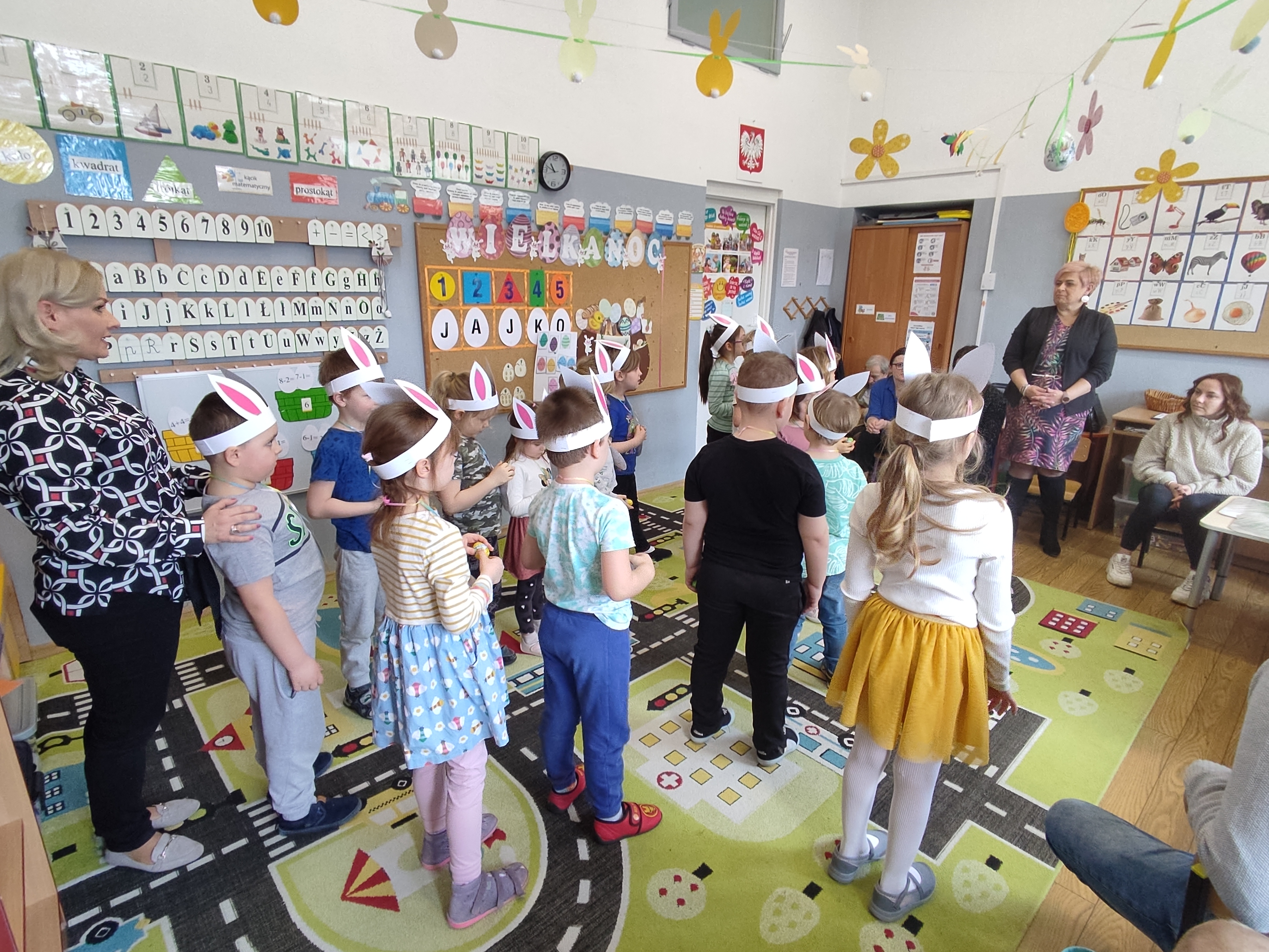 W dniu 05.04.2023r.w grupie „Biedronki „ odbyły się zajęcia otwarte z udziałem Rodziców, którego tematem były:”Zabawy z Wielkanocnym Zajączkiem „. Dzieci poprzez różnorodne zadania do wykonania miały okazję do poznawania tradycji Świąt Wielkanocnych.Rozwiązywały zagadki, szyfr cyfrowo- literowy, nazywały figury geometryczne, liczyły, przeliczały elementy oraz rozpoznawały poznane cyfry. Wykonywały działania na dodawanie i odejmowanie w zabawie matematycznej:”Jajeczne rachunki”. Utrwalały znajomość poznanych liter drukowanych oraz wyodrębniały głoskę w nagłosie nazwy obrazka. Układały pisankowe puzzle z pociętych części w całość. Uczestniczyły w zabawach muzyczno- ruchowych: „Szło jajeczko drogą „, „Zajączki”. Wspólnie zaśpiewały piosenkę, pt:”Pisanki- kraszanki”. Wielkanocny Zajączek za pięknie wykonane przez dzieci zadania przygotował słodką niespodziankę i medale. Na koniec odbyły się warsztaty świąteczne, podczas których dzieci wraz z rodzicami ozdabiały jajka.